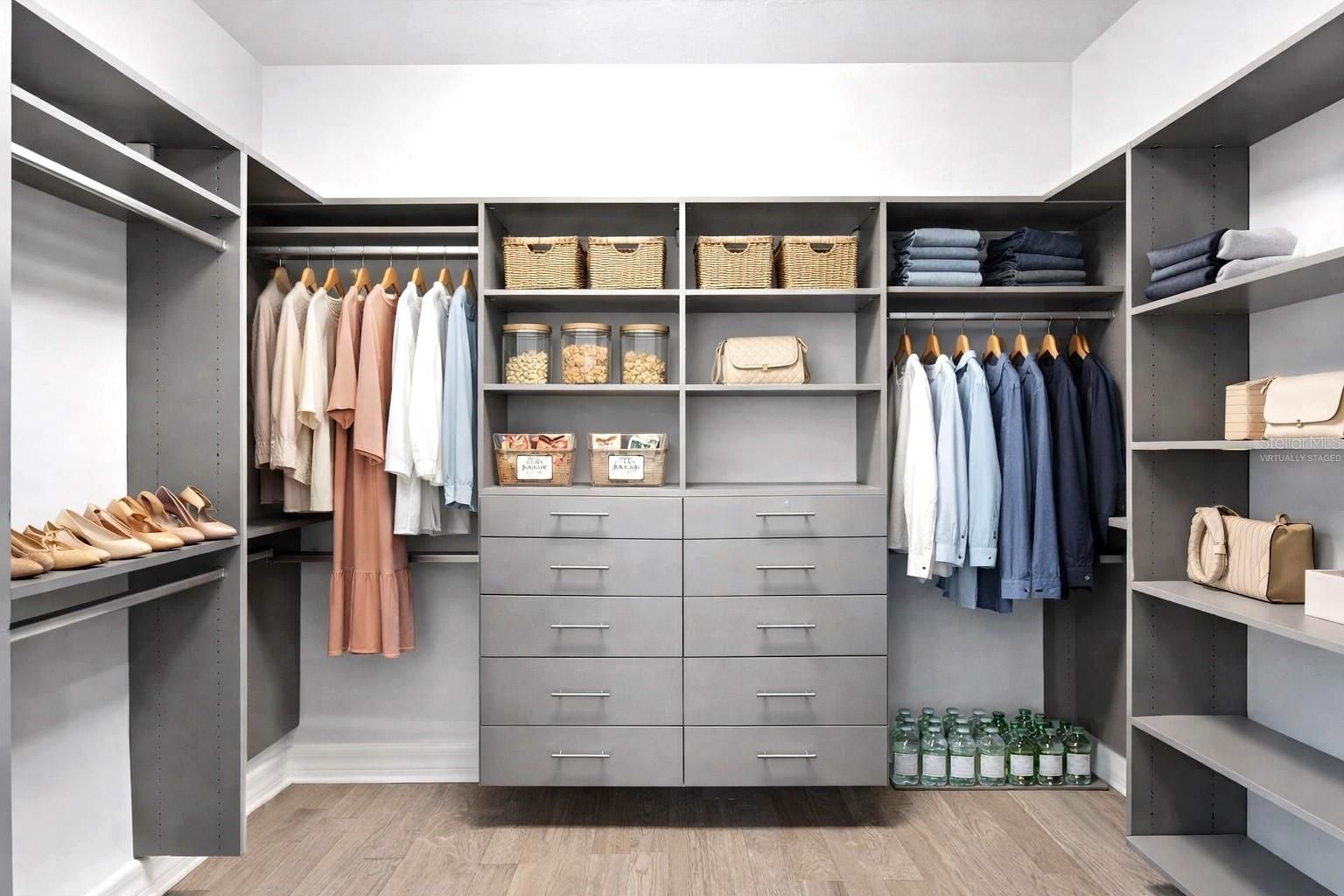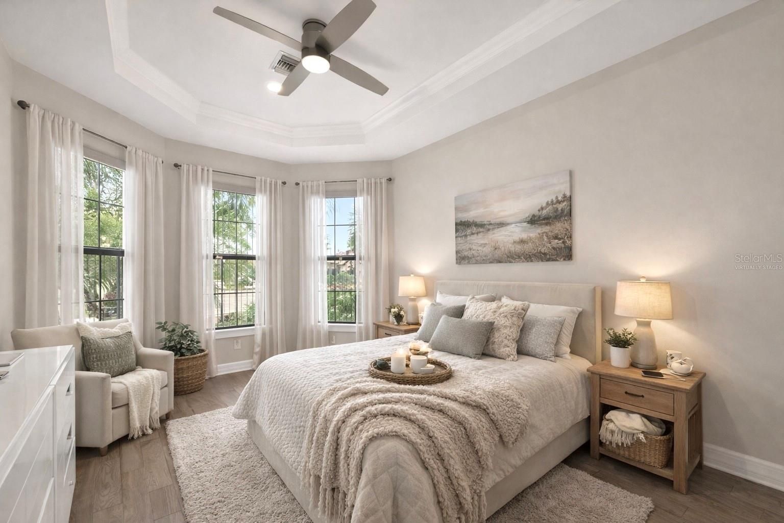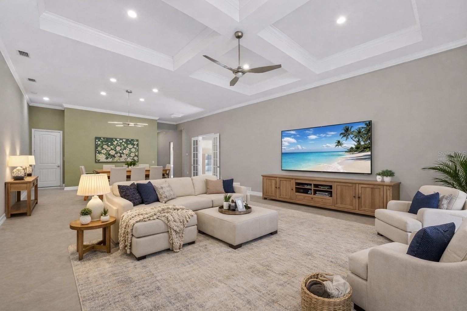 - Ceiling Fan(s), Coffered Ceiling(s), Crown Molding, High Ceilings, Living/Dining Room, Open Floorplan, Main Level Primary, Solid Surface Counters, Solid-Wood Cabinets, Split Bedrooms, Stone Counters, Thermostat, Walk-In Closet(s), Window Treatments