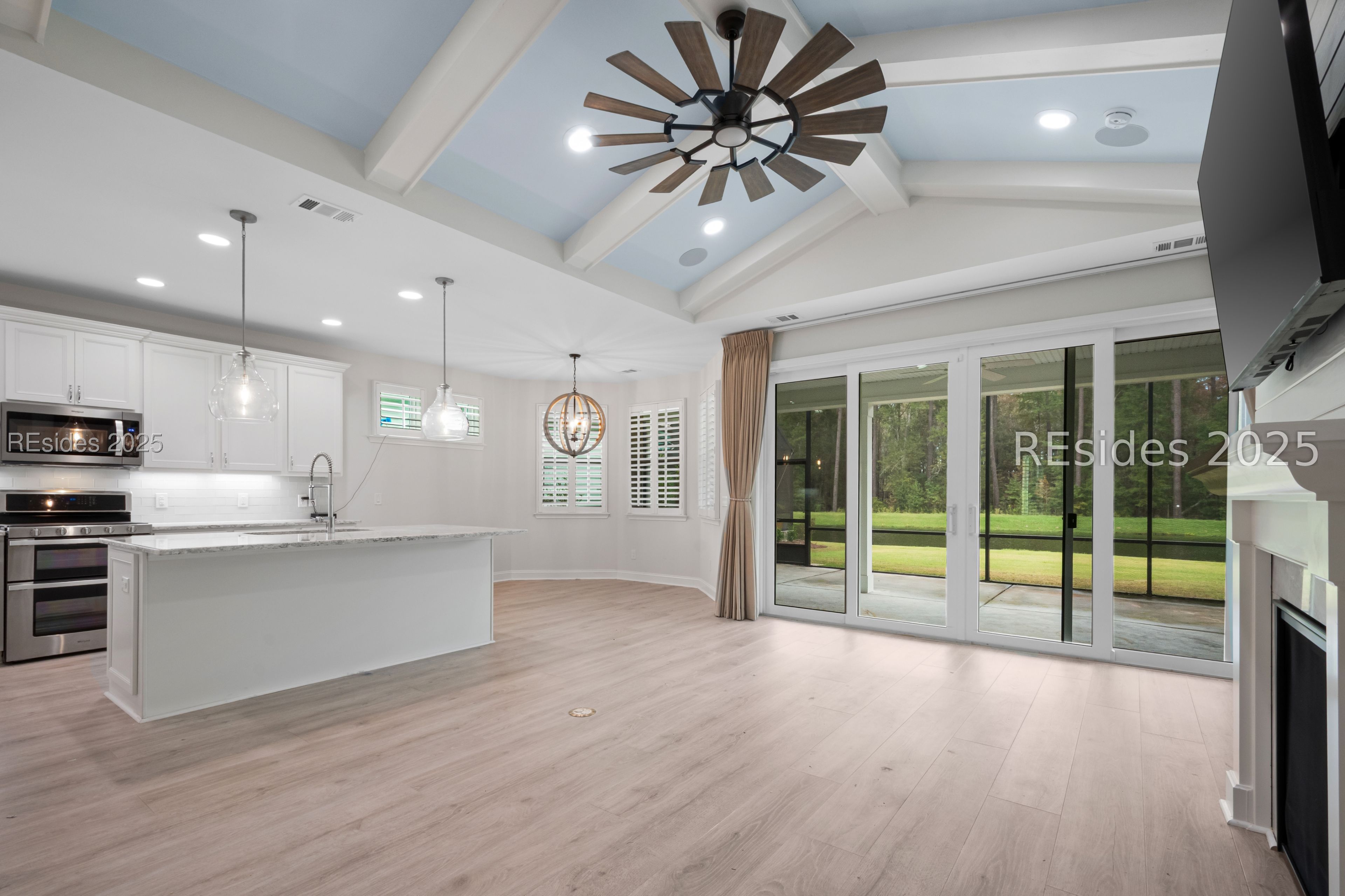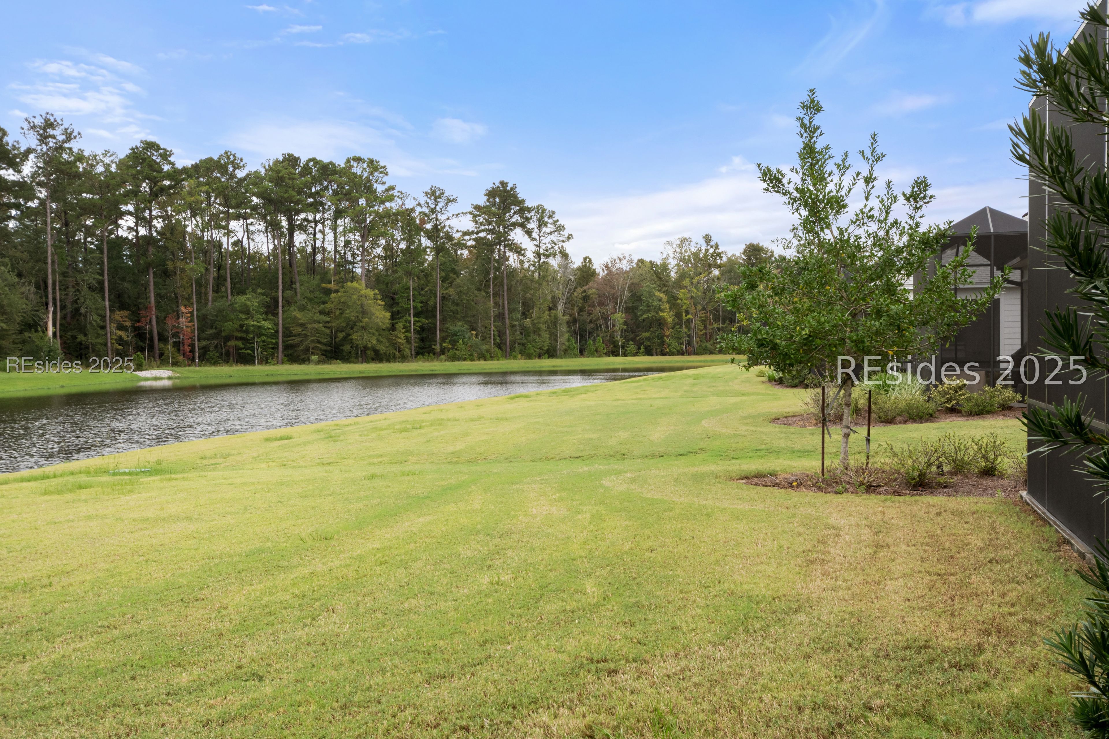 This magnificent view set back from the lagoon's edge with a bank of trees behind it will keep you mesmerized from the minute you see it. A beautiful home is included with the view. A clean, crisp, Coconut Model that is sunny and bright. Upgraded features: Built in Gas Fireplace, looming vaulted ceiling with Bead Board and Beams, Ship Lap walls and pale blue accents. The upgraded Quartz Countertops and backsplash accentuate the subtle coastal vibe. A large Island, spacious Dining Area with Bay Windows, and the soft colored LVP Flooring give it a quiet calmness. There is a separate Den with French Doors. The Primary Suite has not only a walk in shower but a wonderful soaking tub. The wall behind the bed is also a blue Ship Lap so bring on your crisp white bedding. Separate Guest Suite. Laundry Room. A huge Lanai is calling you to enjoy the outdoors so bring your grill and furniture and enjoy the wildlife...eagles, deer, turtles and more. A $6000 lighting package makes the front stand out from all the other houses.