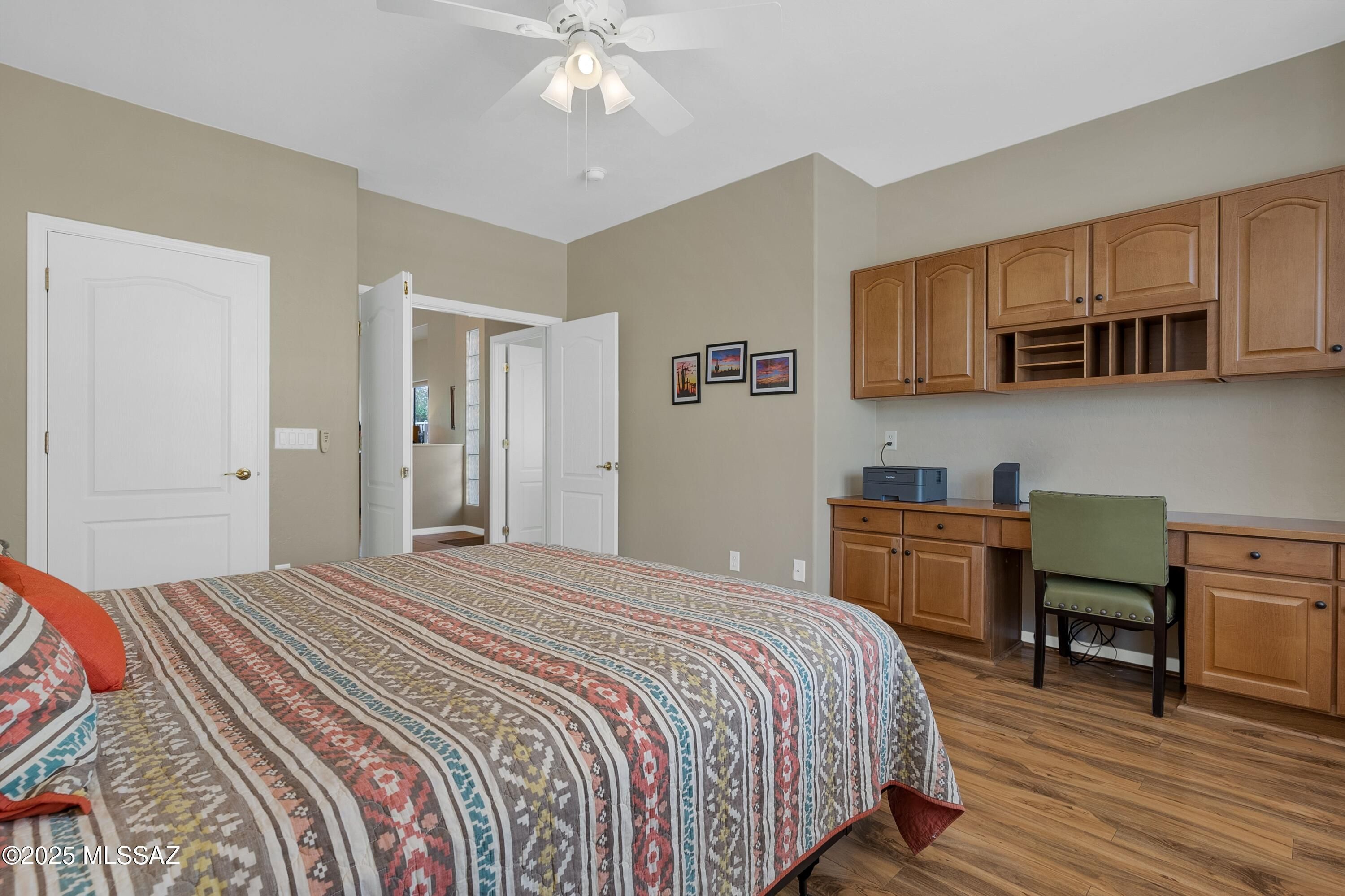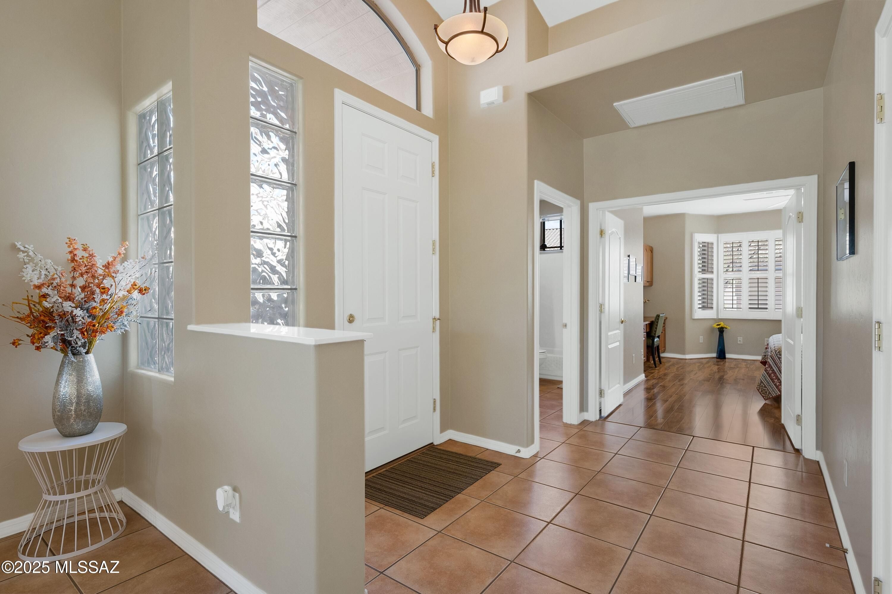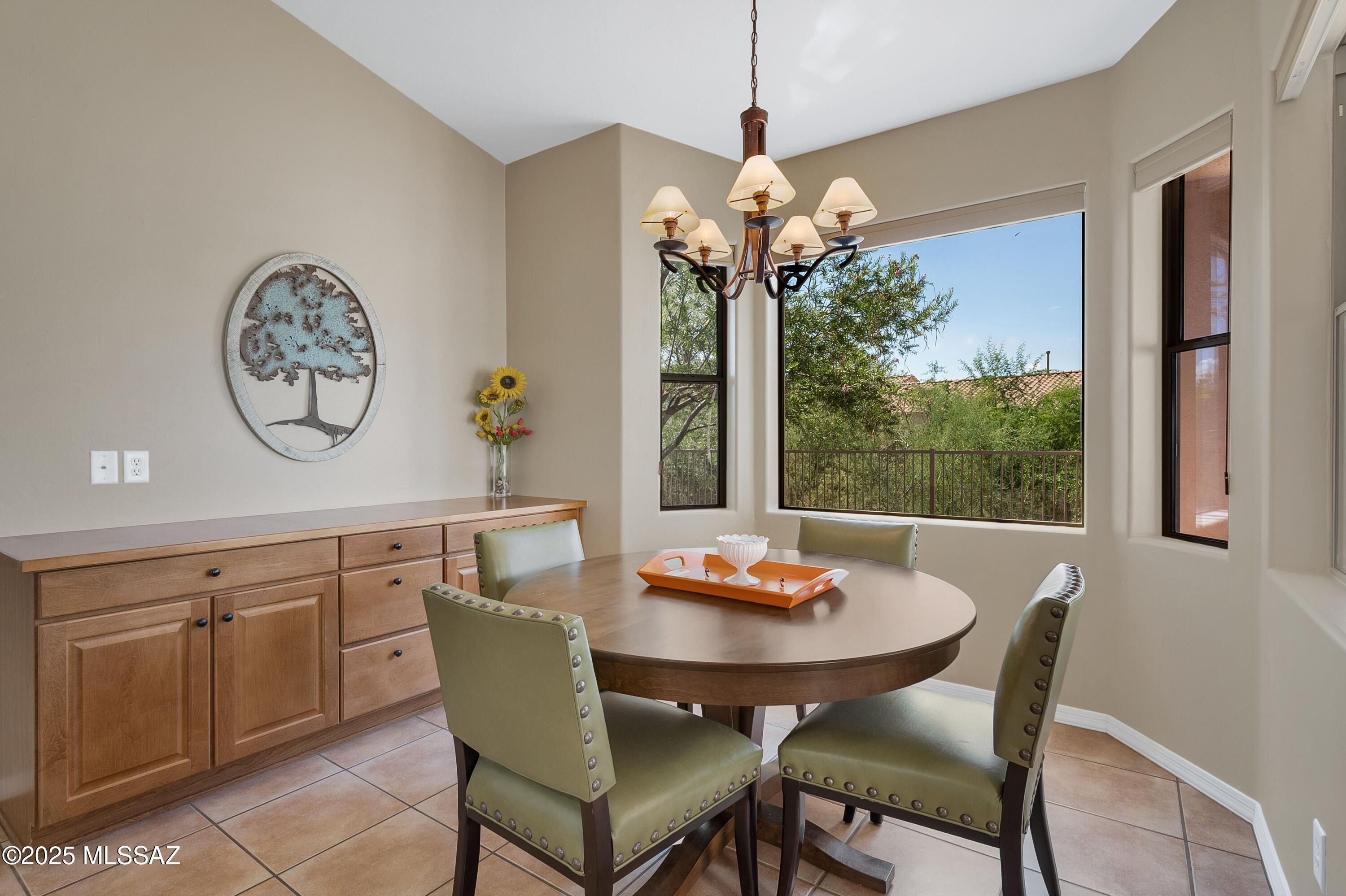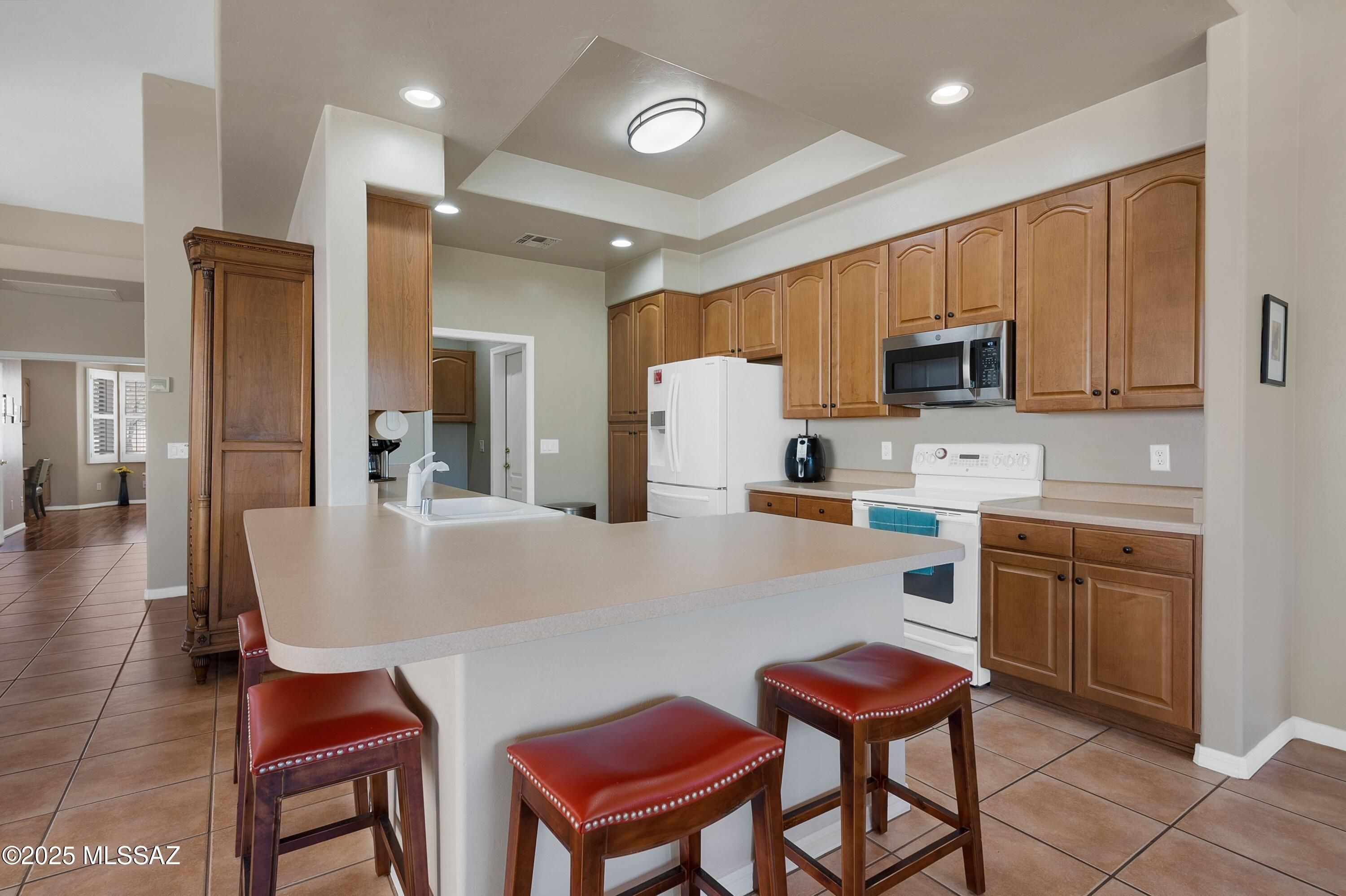 Welcome to this beautifully appointed patio home in a highly sought-after active adult community of Vistoso Village! With its thoughtful design and fantastic features, this home offers the perfect blend of comfort and style. Roof Replaced 5/25, HVAC 5/23. The spacious kitchen boasts 42-inch maple cabinets with convenient pull-out shelving and newer appliances, making meal prep a breeze. The adjacent dining area features a stunning built-in buffet, providing extra storage and elegance to meet your entertaining needs. The home features four bay windows, allowing natural light to flood the space and offering serene views of the surrounding area. The guest bedroom is outfitted with a built-in office desk, offering a quiet and functional workspace, while the primary bedroom is generously sized
