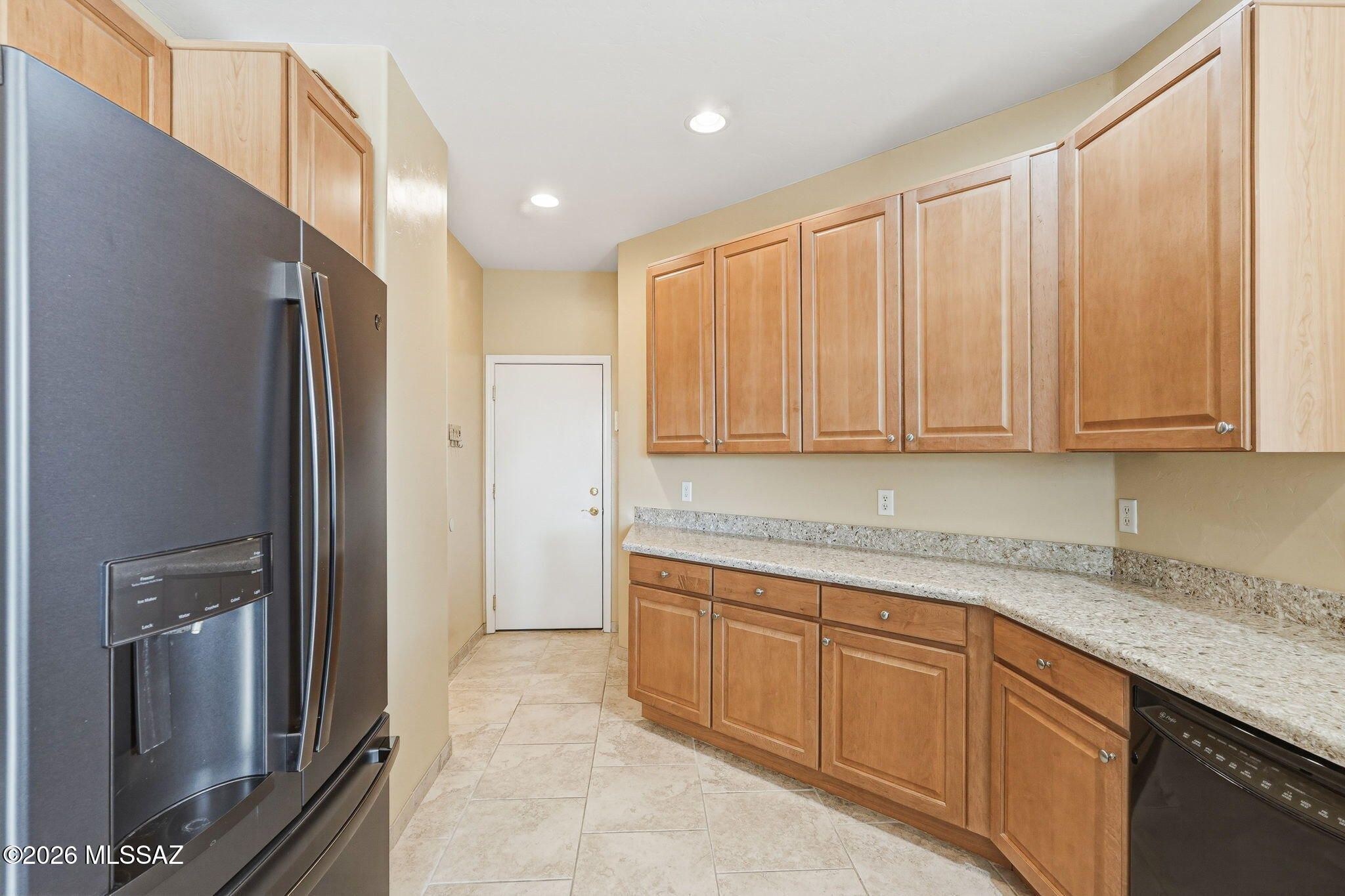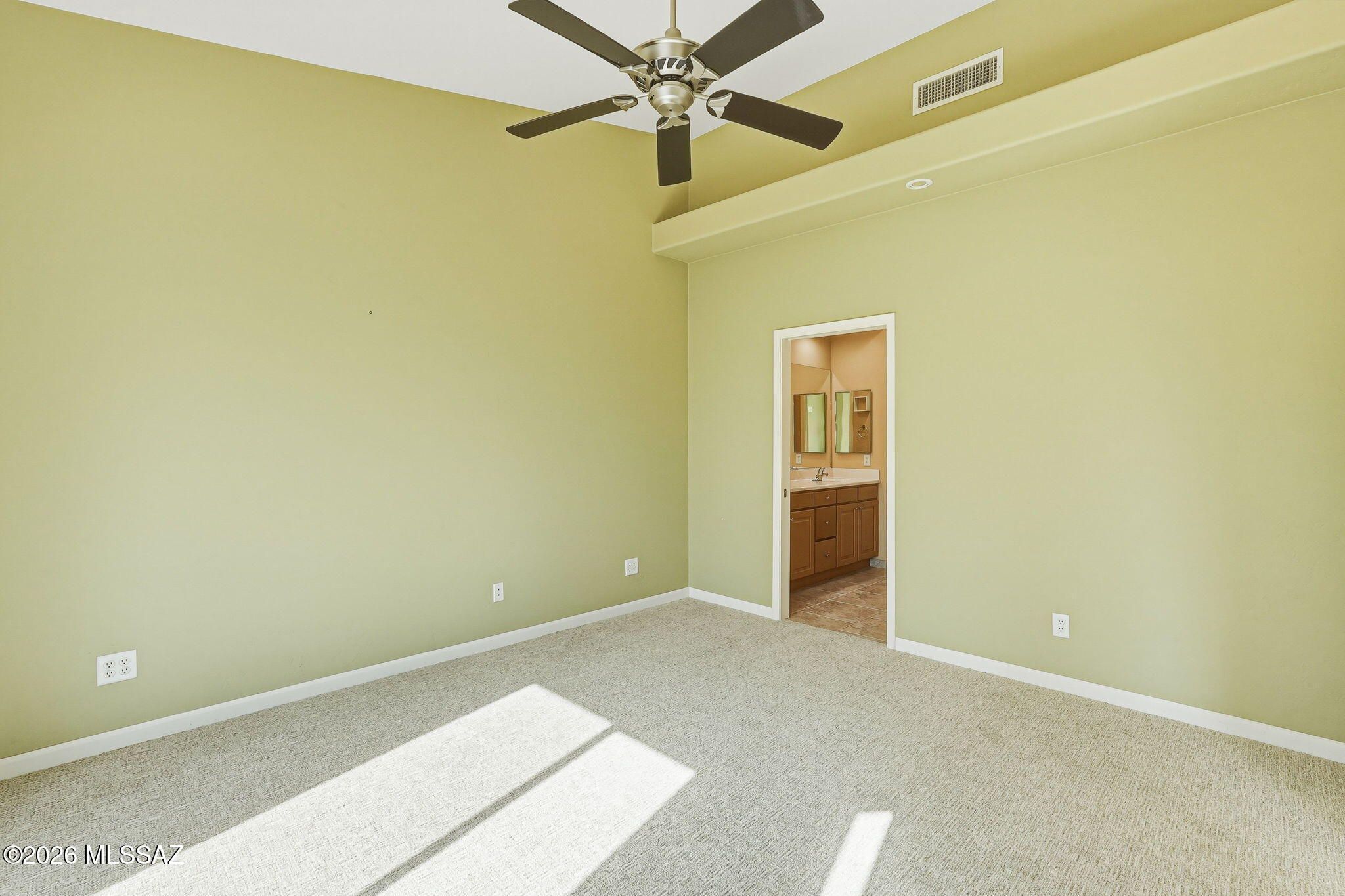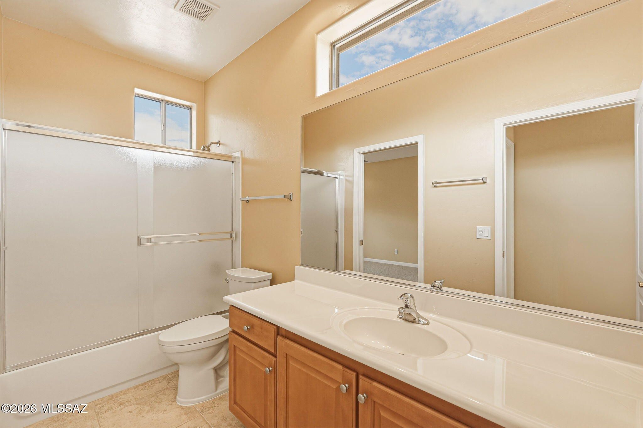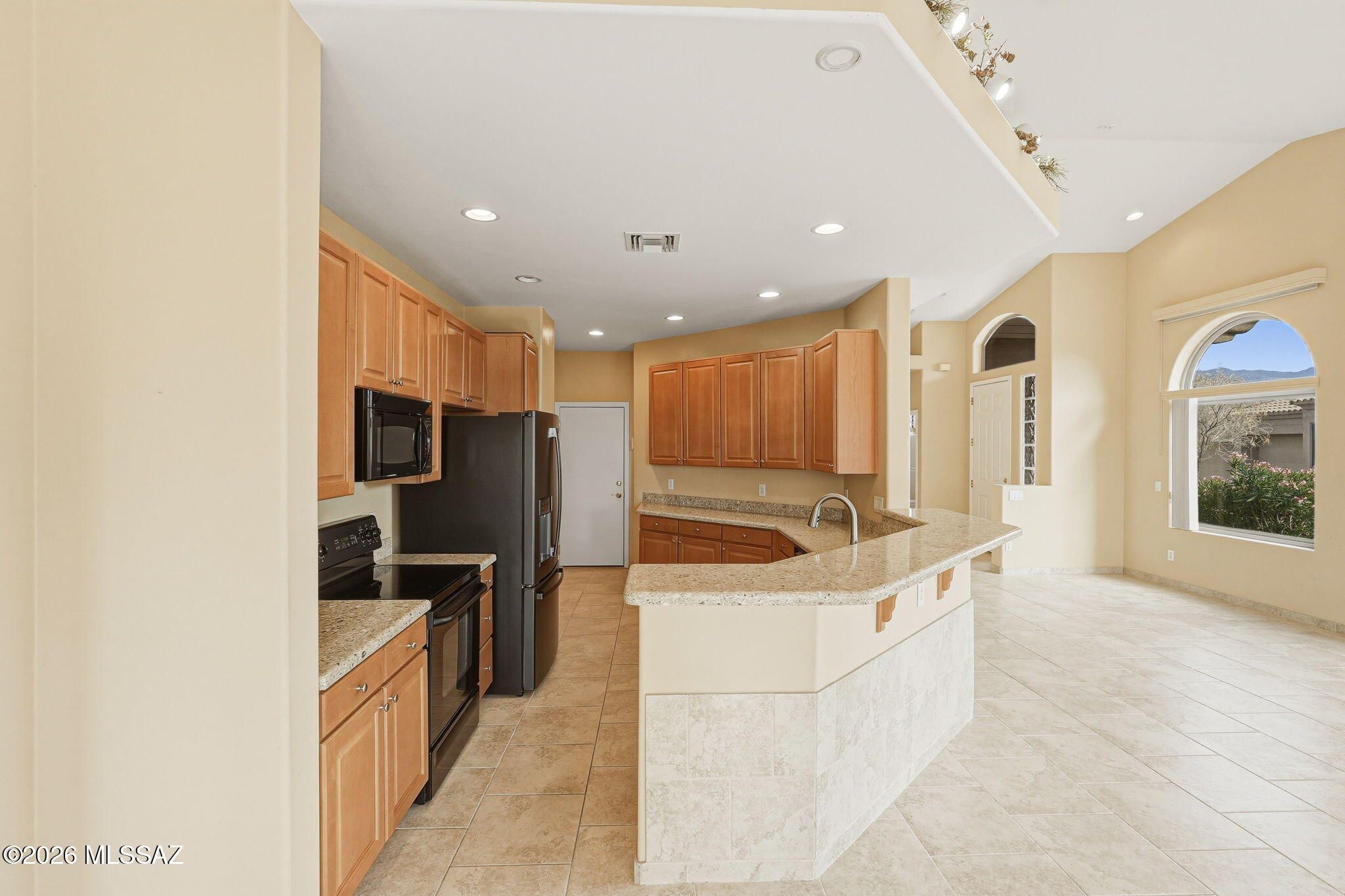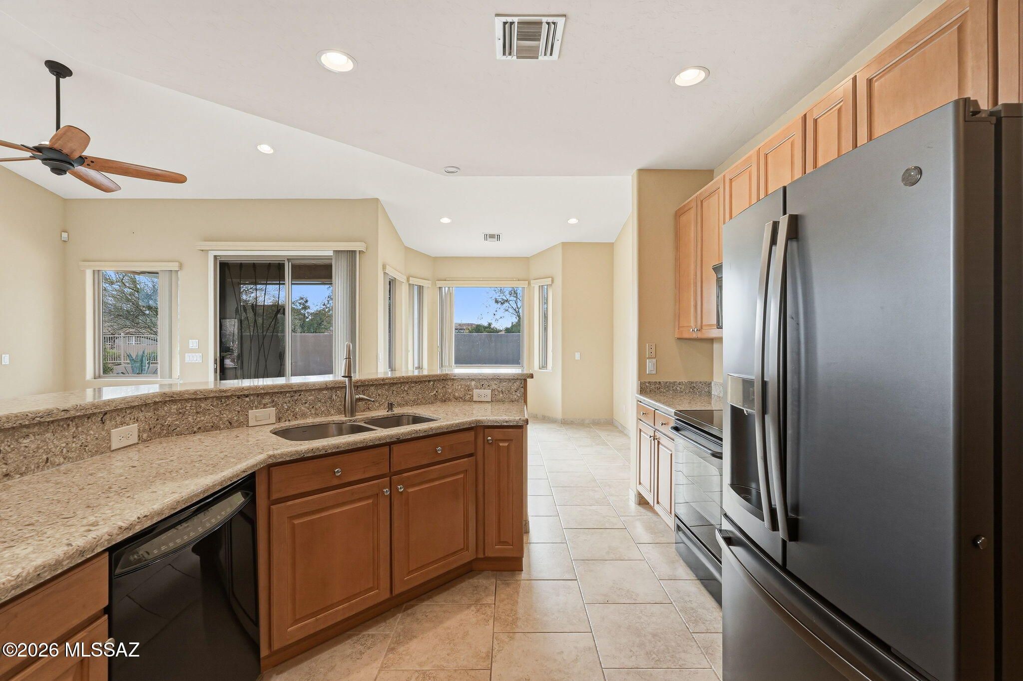 Located in the Vistoso Village 55+ gated community, this two-bedroom, two-bathroom end unit features an open floor plan with vaulted ceilings. The primary suite includes a bay window, double vanity, and walk-in shower, while the second bedroom offers an en-suite bath/shower. The kitchen features generous granite countertops, a pantry, and a breakfast bar. Recent upgrades include new windows, new carpet, new refrigerator, washer, and dryer, and epoxy floors in the garage. Community amenities include two pools, a spa, a fitness center, a library, and organized social activities. The HOA covers: cable or satellite, trash, roof repair/replacement, sewer, and water. At this price, it's a must-see!