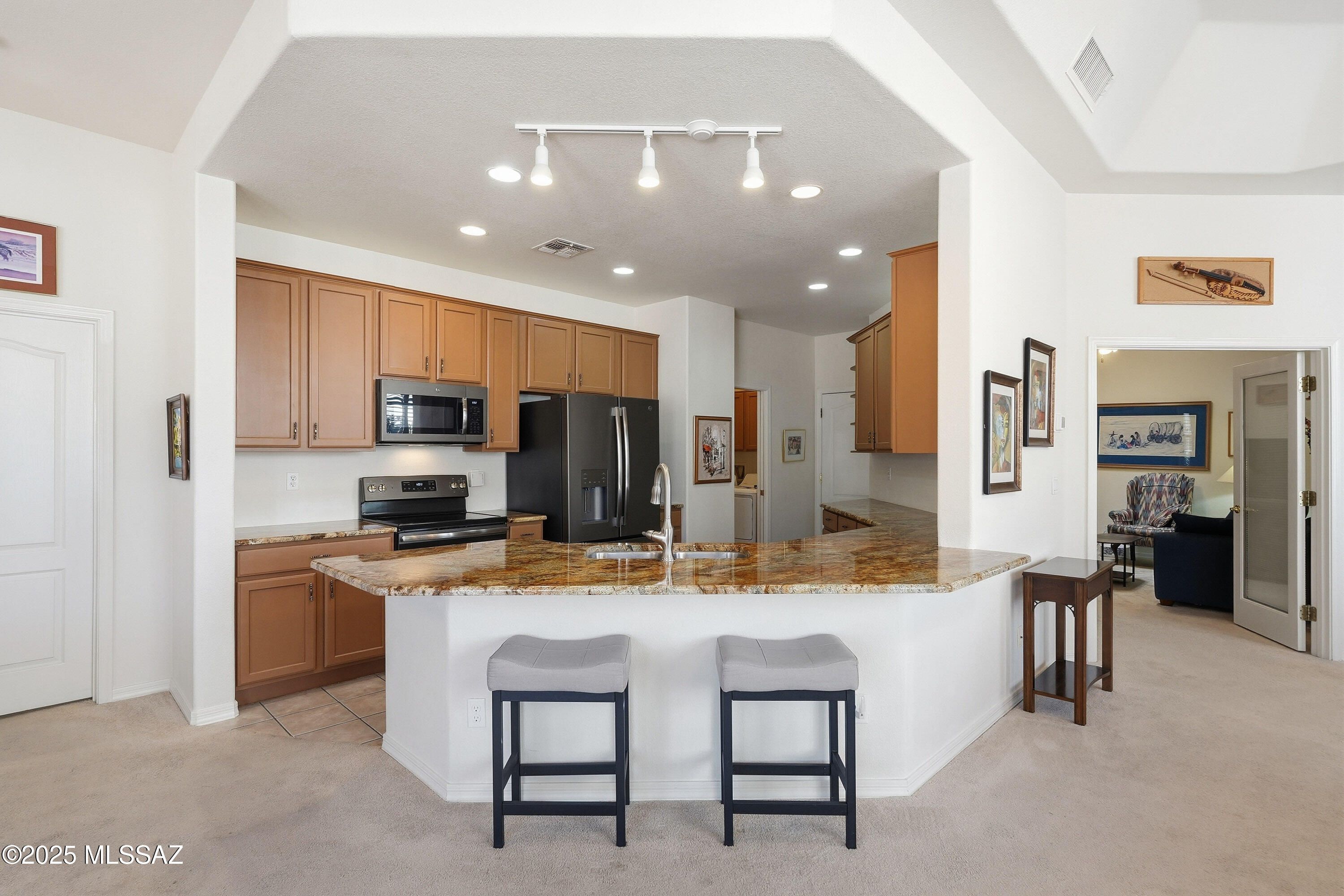 A delightful open-plan, light and bright townhome in the quiet over-55 community of Vistoso Village in desirable Rancho Vistoso is now available and ready to welcome new owners. This is a wonderful home, tucked away in a quiet location near the Community Clubhouse and pool/spa. It's a Chula Vista floorplan that includes 2 generous bedrooms, two baths and a large den/office. The kitchen was recently remodeled with handsome new granite counters and freshly painted cabinets, providing generous spaces for kitchen prep and storage. To make this kitchen even more accessible, there are pullout drawers in the lower cabinets. The primary bedroom/bath provides a generously sized walk-in closet. Four bay windows enhance the bountiful natural light found throughout this enjoyable home.
