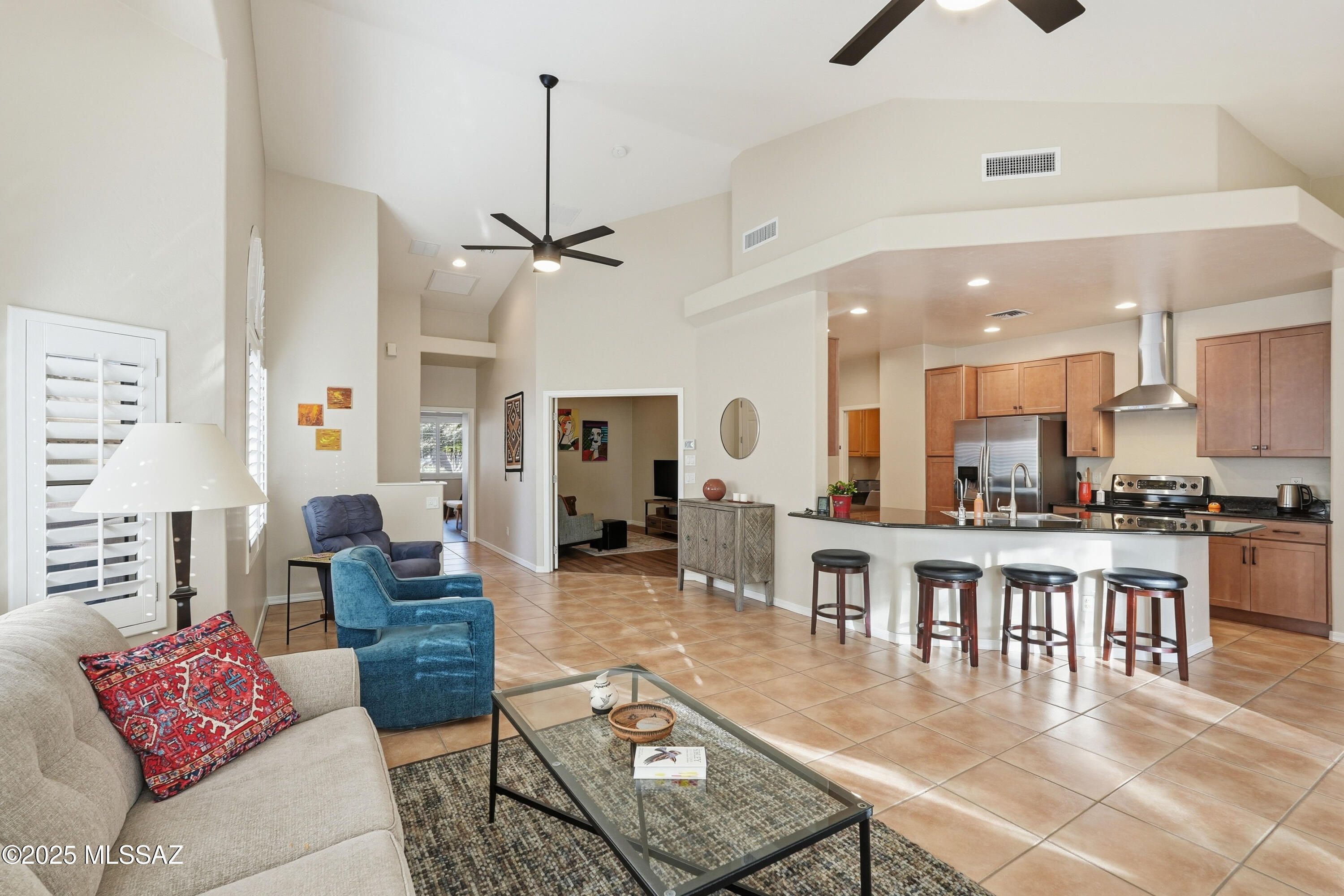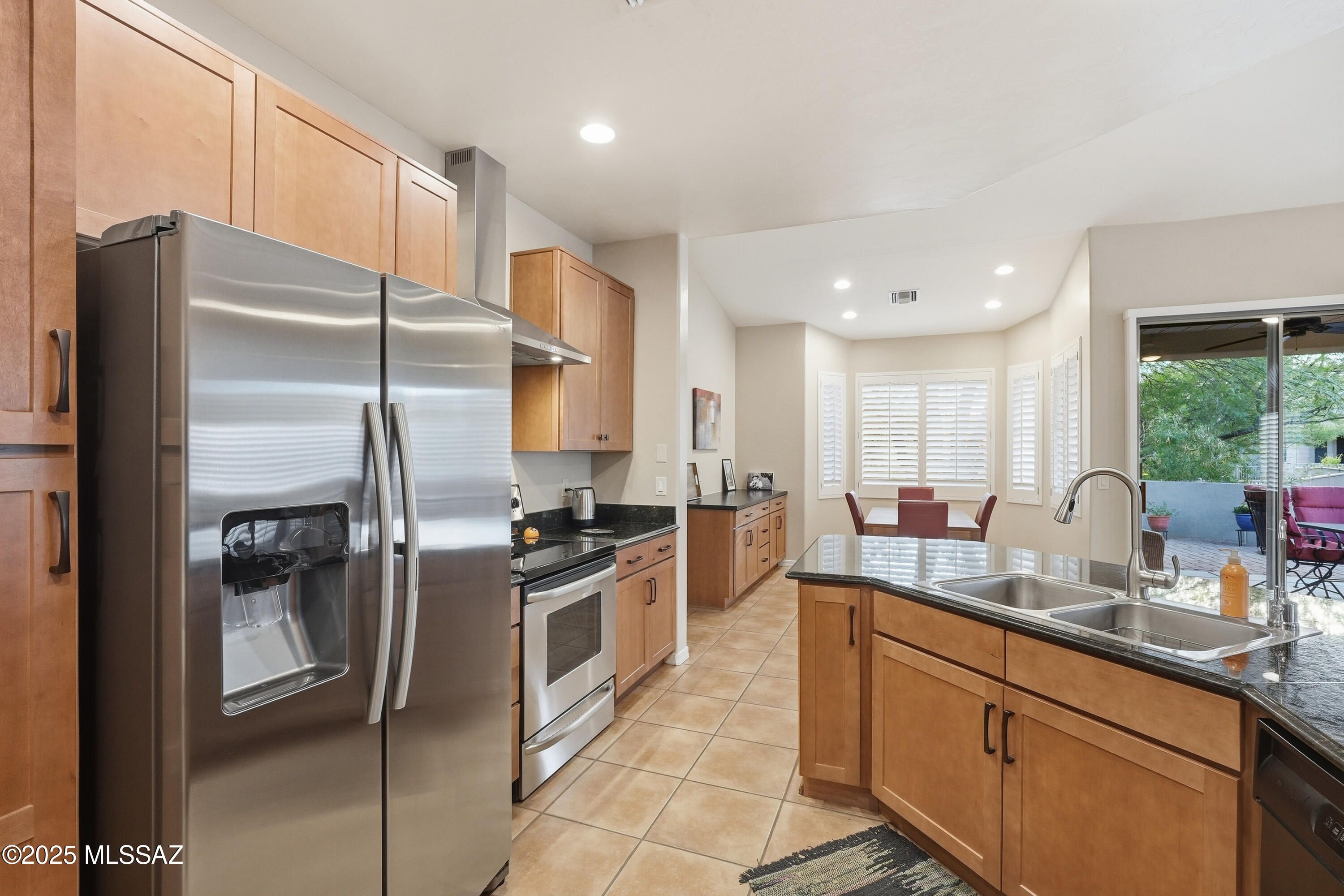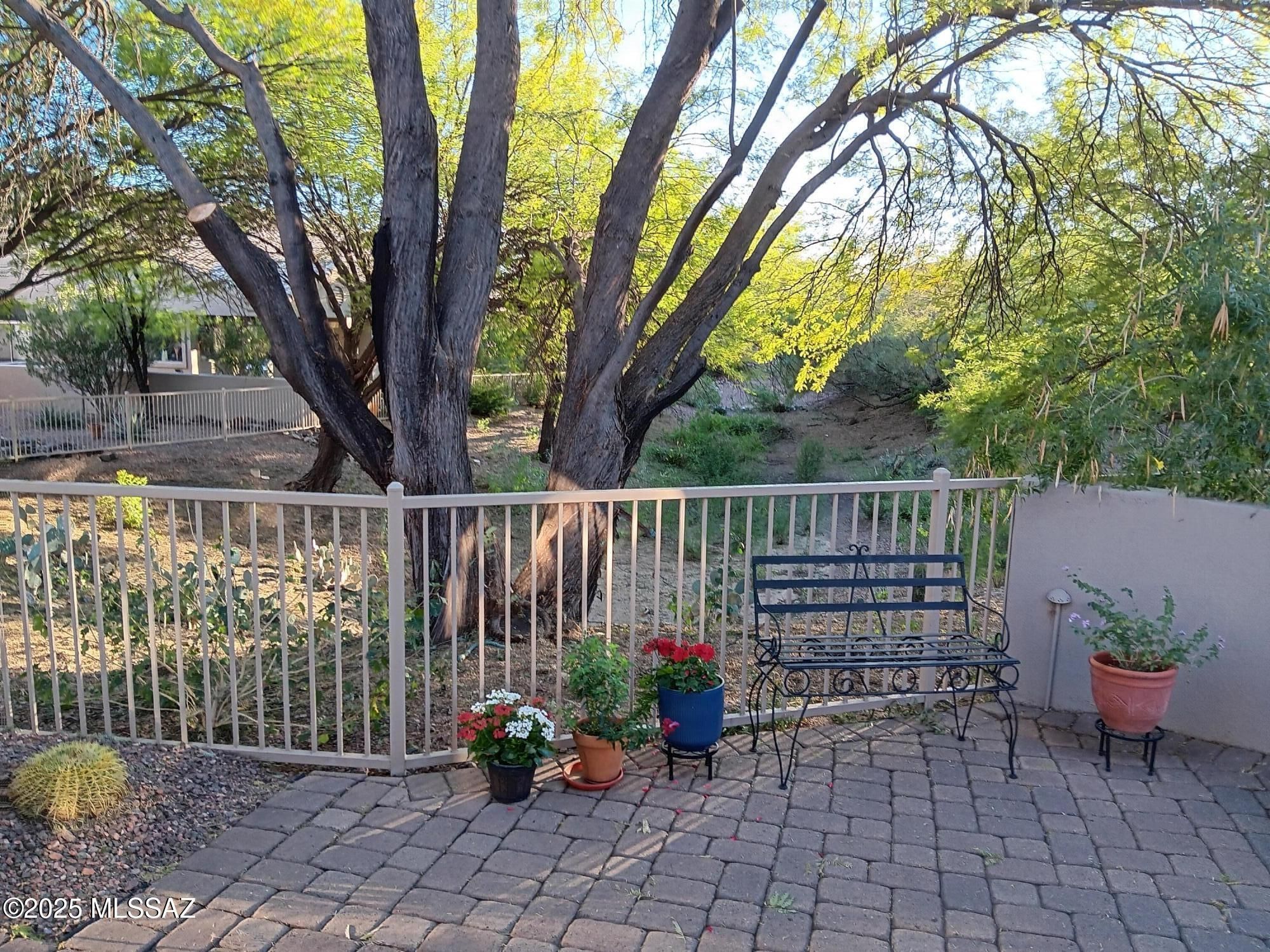 Southwest Kitchen & Bath did a beautiful job remodeling the kitchen & bathrooms in this lovely townhome, located in Vistoso Village, a sought after 55 plus community in beautiful Oro Valley, AZ. The spacious kitchen w granite countertops, pull out drawers for easy use, newer stainless refrigerator & updated cabinets make this kitchen a happy place to cook a meal. A small room off the kitchen is where the pantry, small desk, & microwave are located. A very convenient space! Gorgeous granite in both bathrooms, w/the primary bath boosting a custom walk-in shower, double vanities & a walk-in closet. Tile & luxury vinyl flooring, no carpet. This 1953 sq. ft. is ideal: 2 bedrooms/2 baths & a den. Large windows w/beautiful shutters, some w/sun shades, bring in natural light & showcase the green