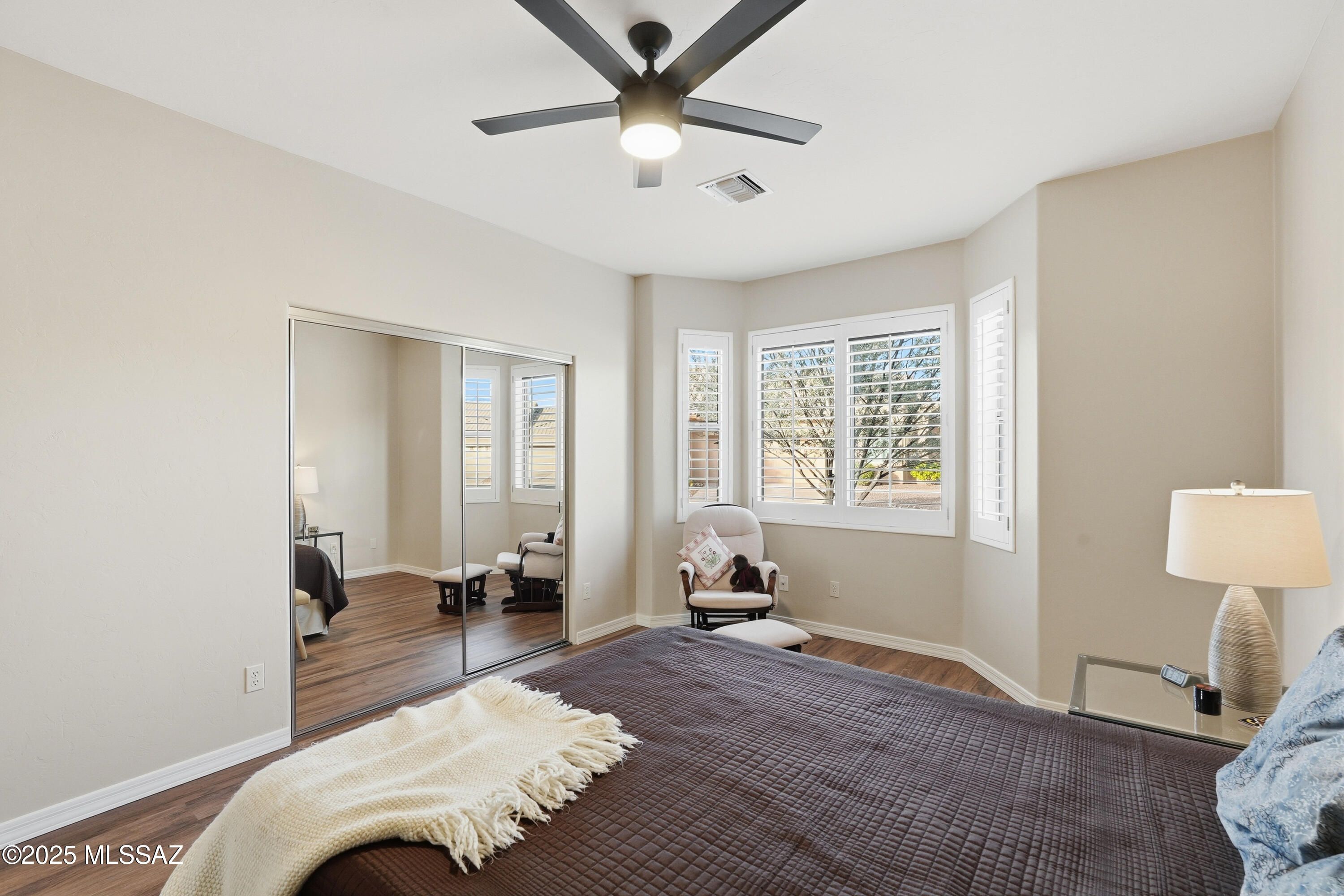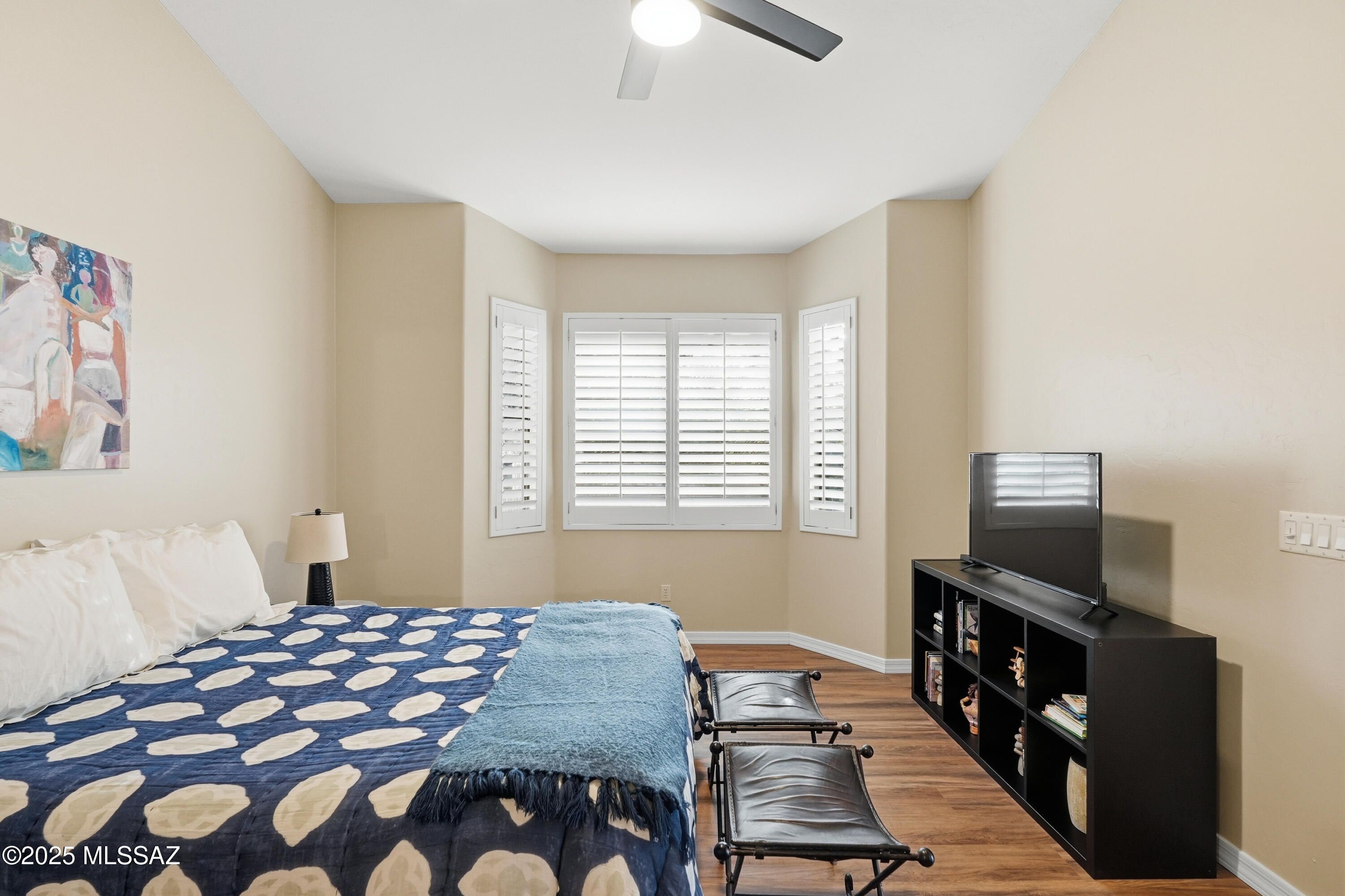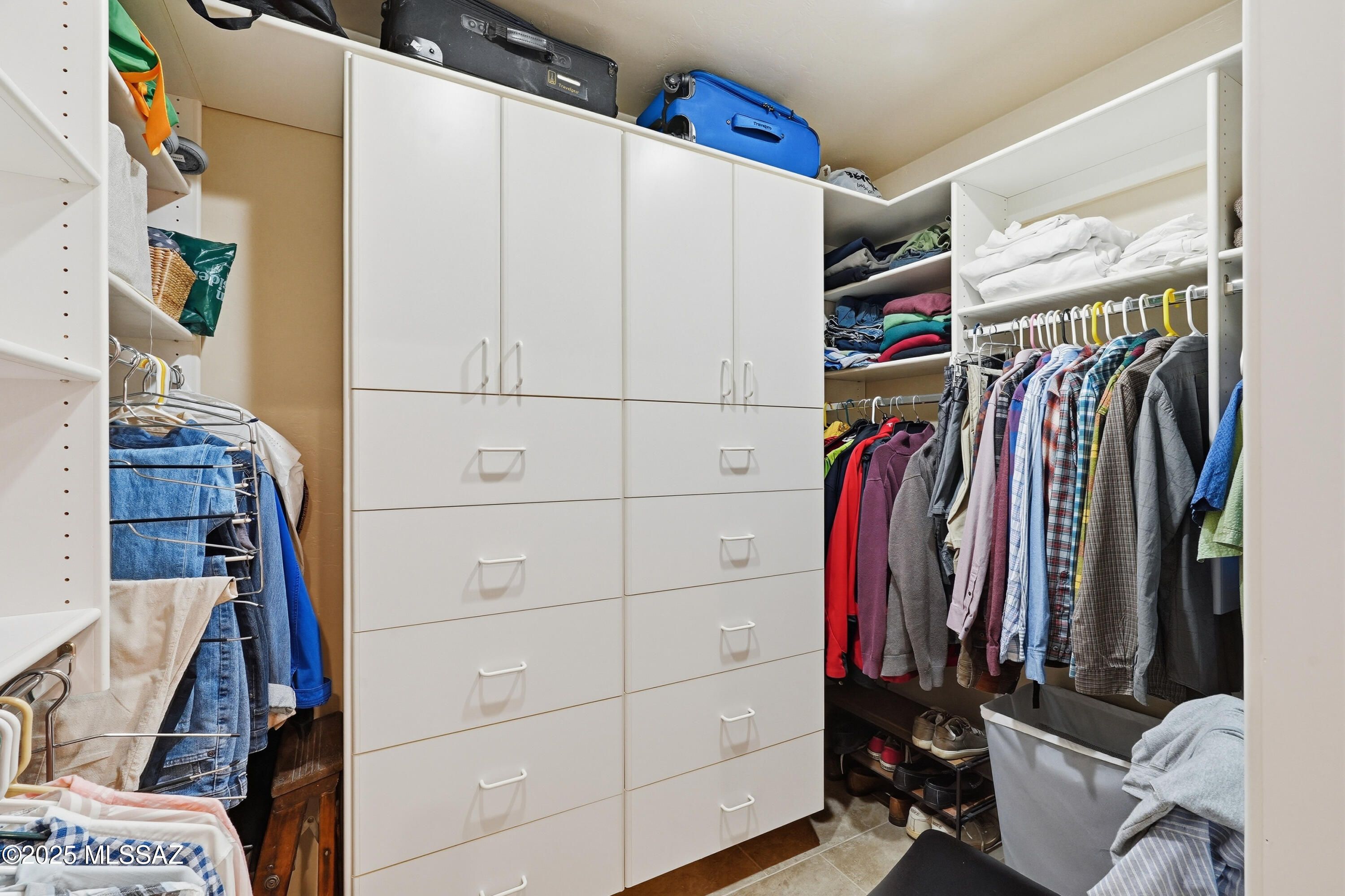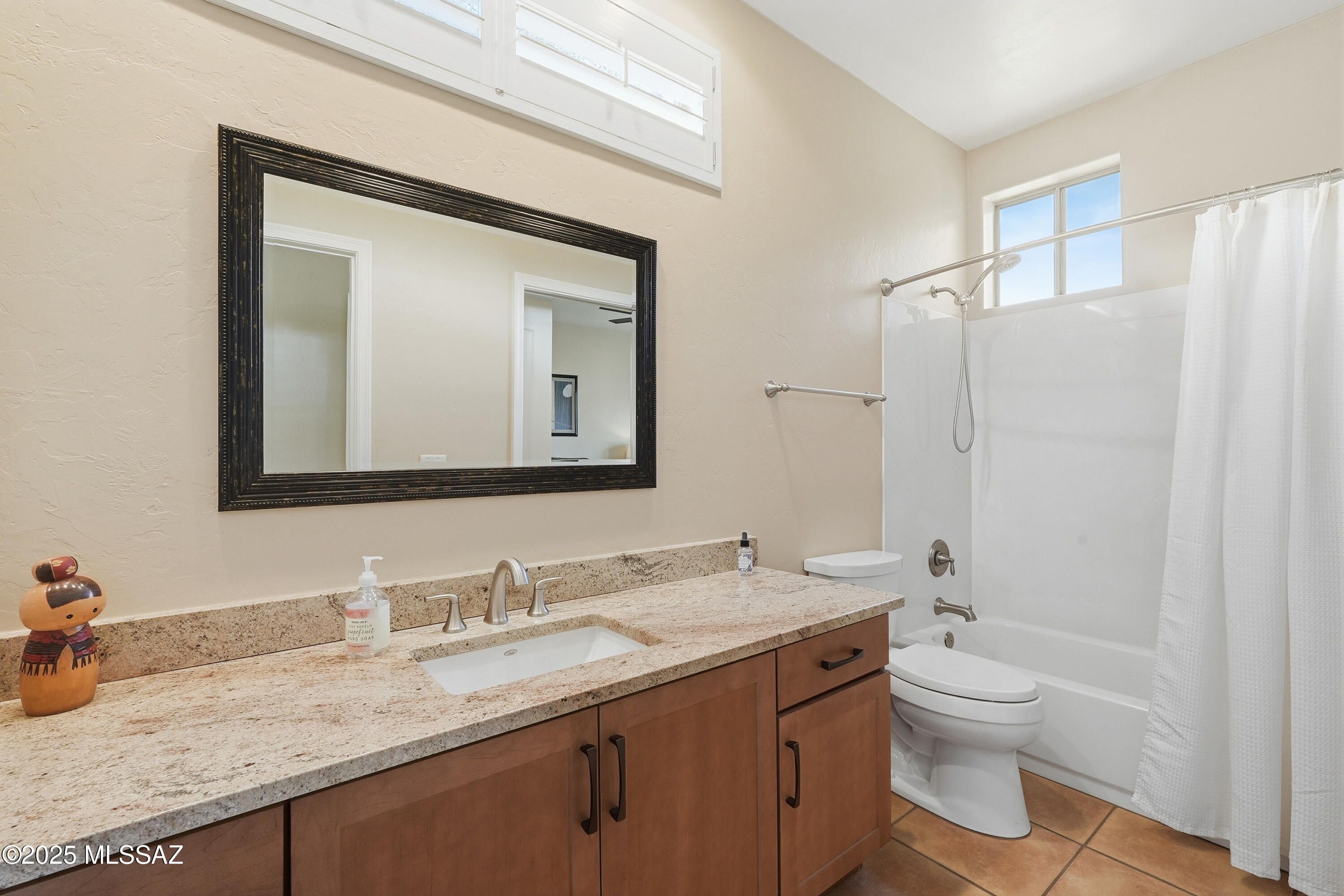 Southwest Kitchen & Bath did a beautiful job remodeling the kitchen & bathrooms in this lovely townhome, located in Vistoso Village, a sought after 55 plus community in beautiful Oro Valley, AZ. The spacious kitchen w granite countertops, pull out drawers for easy use, newer stainless refrigerator & updated cabinets make this kitchen a happy place to cook a meal. A small room off the kitchen is where the pantry, small desk, & microwave are located. A very convenient space! Gorgeous granite in both bathrooms, w/the primary bath boosting a custom walk-in shower, double vanities & a walk-in closet. Tile & luxury vinyl flooring, no carpet. This 1953 sq. ft. is ideal: 2 bedrooms/2 baths & a den. Large windows w/beautiful shutters, some w/sun shades, bring in natural light & showcase the green