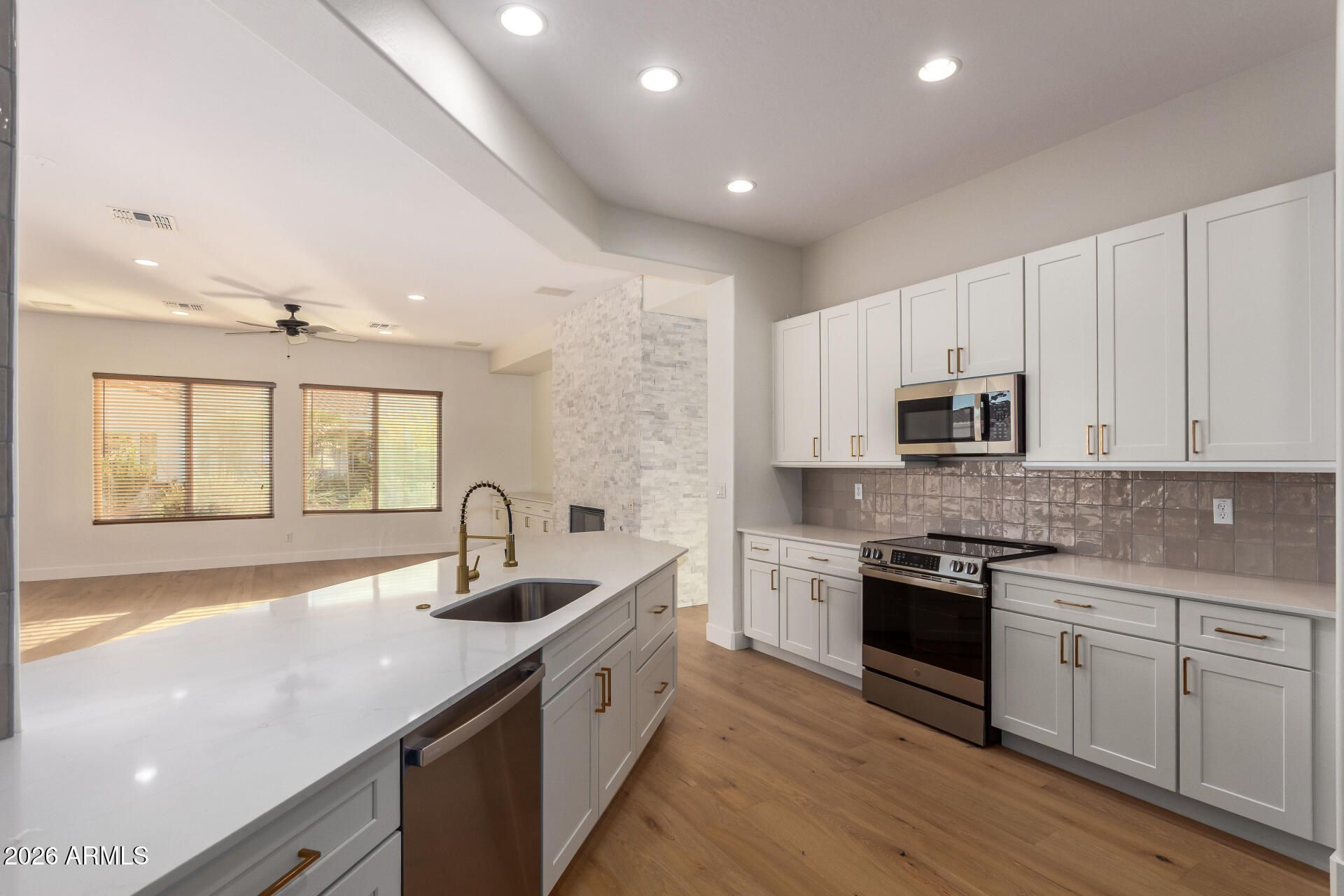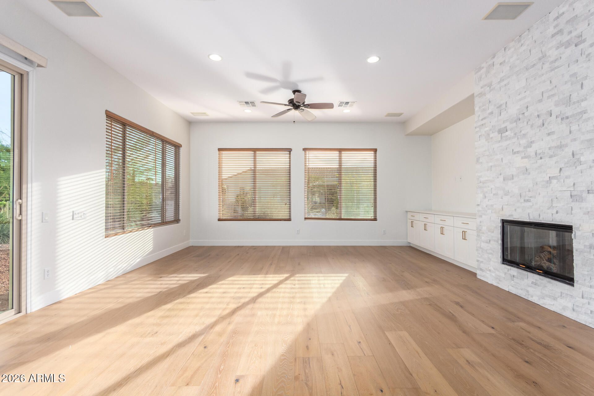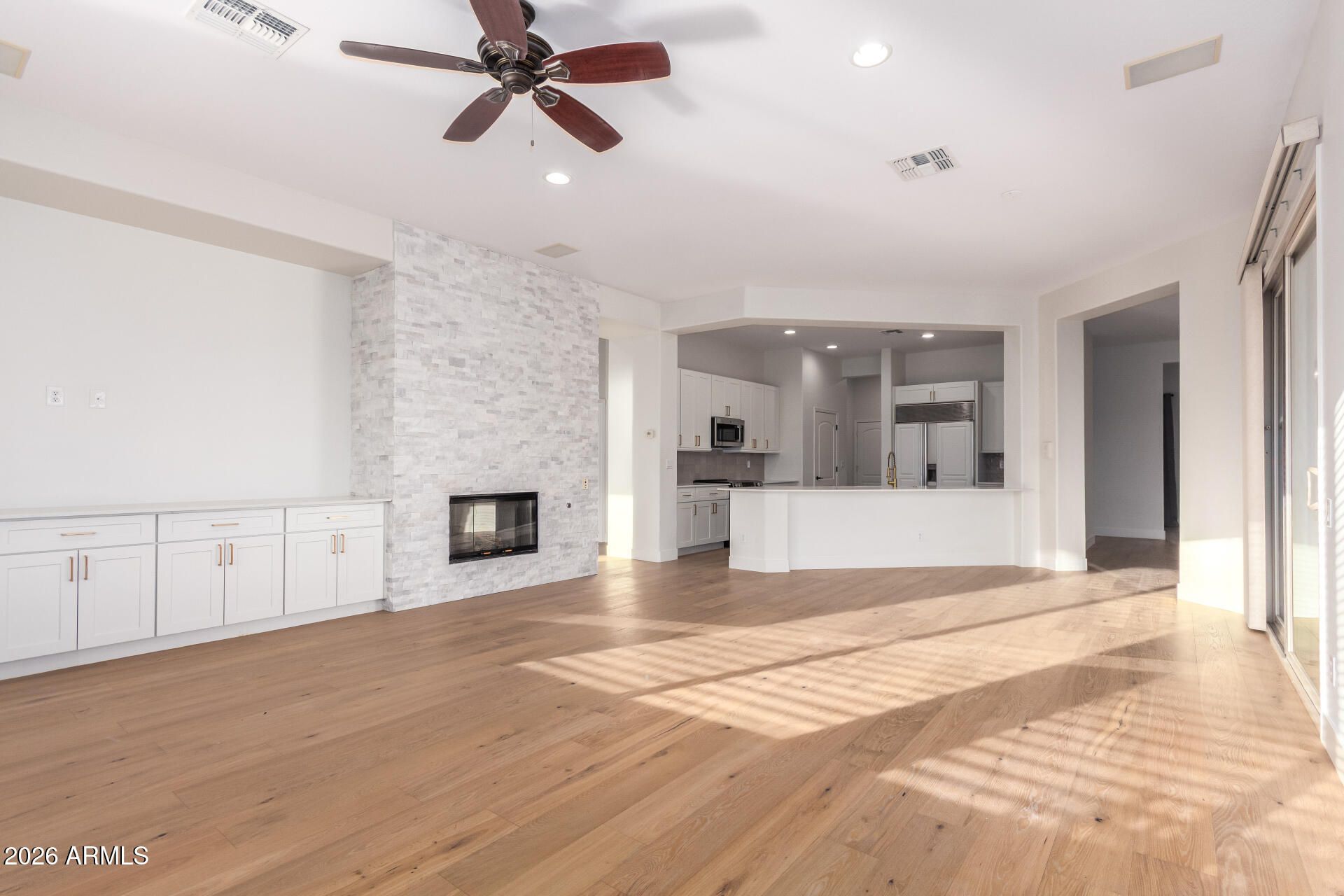 Step into a home that feels instantly calm and beautifully renewed. A custom tile and hardwood entry opens to warm, continuous hardwood floors and thoughtfully updated spaces. The redesigned kitchen offers new cabinetry, modern countertops, stainless appliances, and soft under‑cabinet lighting. The family room features a custom entertainment center and updated fireplace, while the front office provides a bright workspace. Guests enjoy two refreshed bedrooms and a remodeled bath. The primary suite is a true retreat with hardwood flooring, a spacious walk‑in closet, and a spa‑inspired bath with a new walk‑in shower and elegant finishes.
