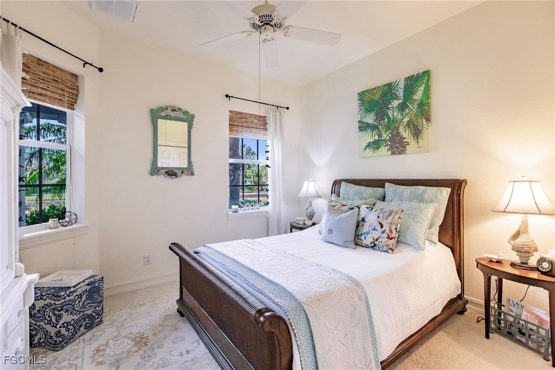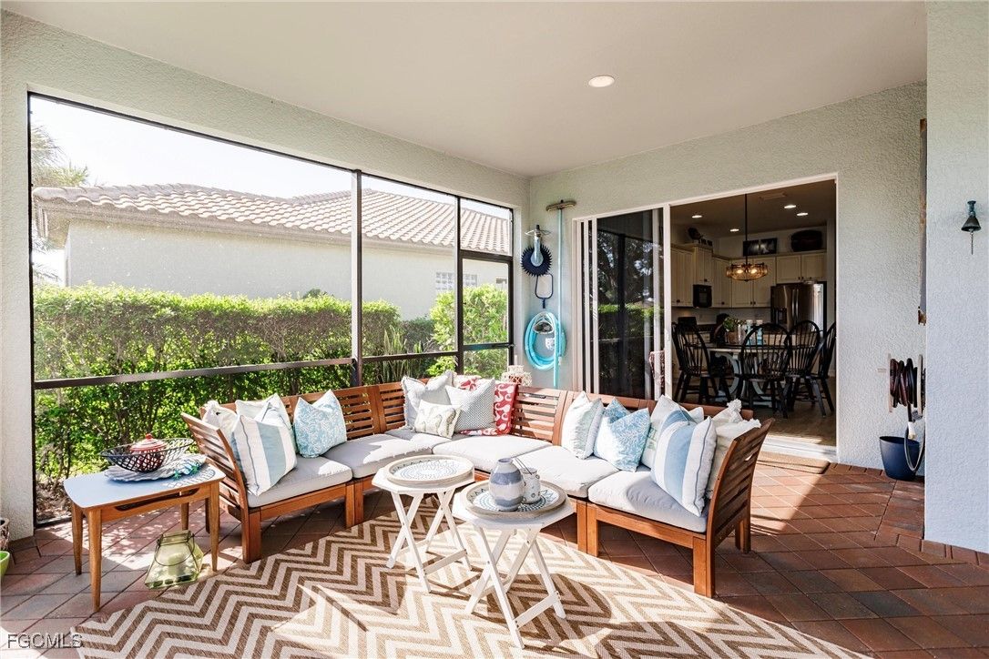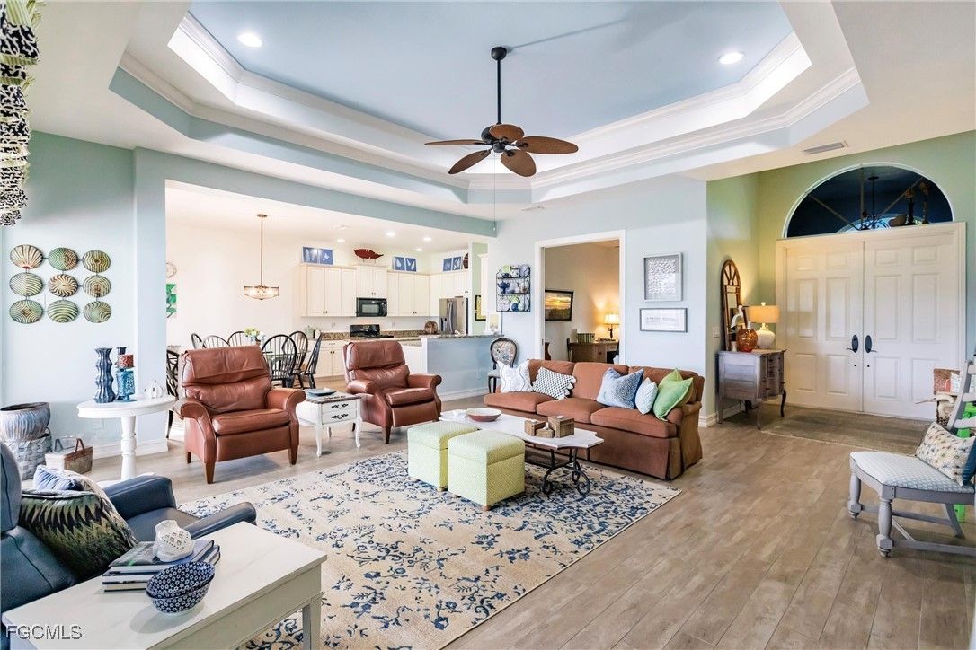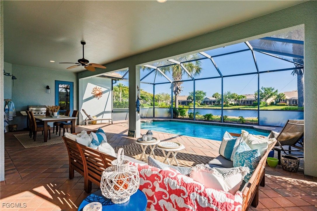 MOTIVATED SELLERS! HUGE PRICE REDUCTION! OFFERS WELCOMED! This stunning Wyman Stokes home in the gated Verandah community boasts a highly sought-after floor plan situated on a large corner lot. The home is turnkey and features 1835 sq. ft. of living space including 2 bedrooms + Den, 2 baths and an expansive Lanai with the largest under roof area for a home of this size. The property has been upgraded with fresh paint throughout, new flooring, a newer A/C, new water heater, new filter assembly for the pool's salt cell, newer pool pump, solar panels, newer heat pump. Brand new washer and dryer installed 2025. The kitchen offers plenty of cabinet space, a center island, a newer refrigerator, and a picturesque view of the lake. The floor plan creates an open and inviting atmosphere, with tray ceilings and crown molding throughout the home, as well as all tile flooring. The large great room seamlessly flows into the kitchen and dining area, leading out to a lanai space overlooking the lake. The den is spacious and versatile, serving as a flex room. The Outdoor Living Area is truly spectacular, offering one of the largest areas under roof with multiple seating areas for relaxation and entertaining. The private heated pool overlooks a large, beautiful lake. Verandah provides a wealth of amenities, including 2 championship golf courses designed by Jack Nicklaus and Bob Cupp, a tennis facility, pickleball courts, a resort-style pool, a state-of-the-art fitness center, bocce courts, kayaks, 9 miles of walking and biking paths, a dog park, playground, multiple restaurants, and a vibrant social calendar that will satisfy everyone's interest. NOTE: HOME HAS A GOLF MEMBERSHIP SO NO NEED TO BE ON THE WAITLIST. Don't miss the opportunity to secure your place in paradise now. This home is priced to sell quickly!