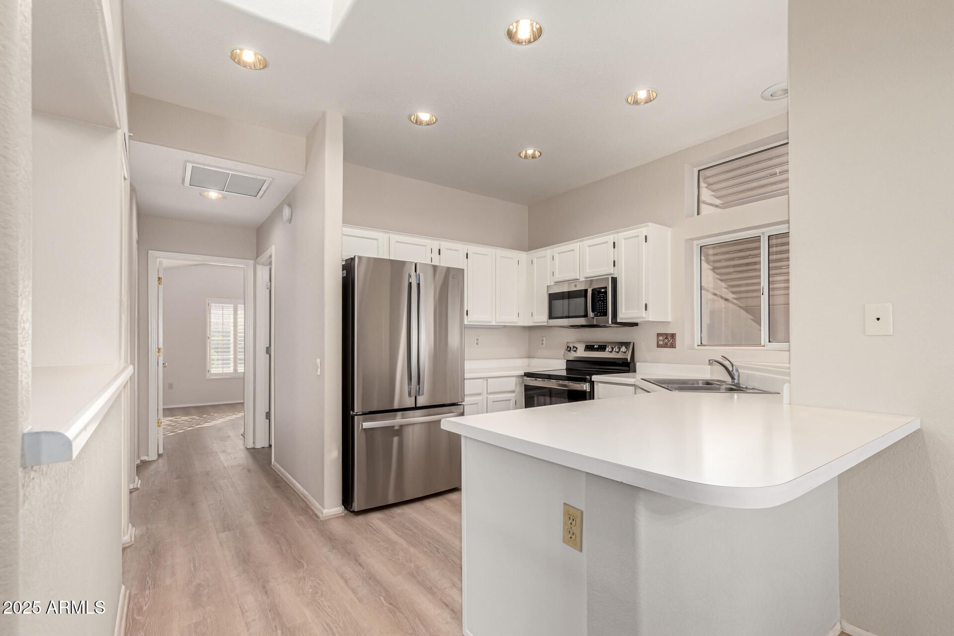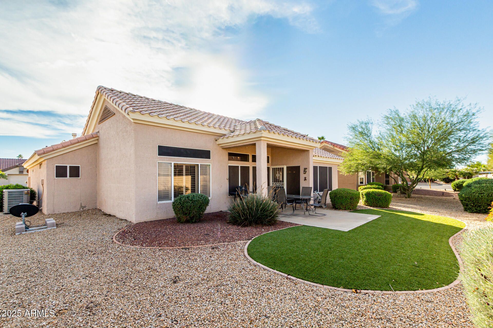 Beautifully maintained, this Sun City West gem offers over 1,300 sq.ft. of inviting living space designed for comfort and ease. This charming home features 2 bedrooms, 2 baths, and a bright, open great room enhanced by soaring vaulted ceilings, elegant window shutters, updated plank flooring and abundant natural light. The welcoming kitchen boasts new painted cabinetry, updated stainless steel appliances, a breakfast bar, and a cozy dining nook. The desirable split floor plan ensures privacy, while the spacious primary suite includes an en suite bath with dual vanities, a large shower, and a generous closet. Step outside to a relaxing covered patio with an extended concrete pad and low-maintenance artificial turf--perfect for enjoying Arizona's beautiful weather. All of this is located within the sought-after Sun City West community, where endless amenities and a vibrant social calendar await!