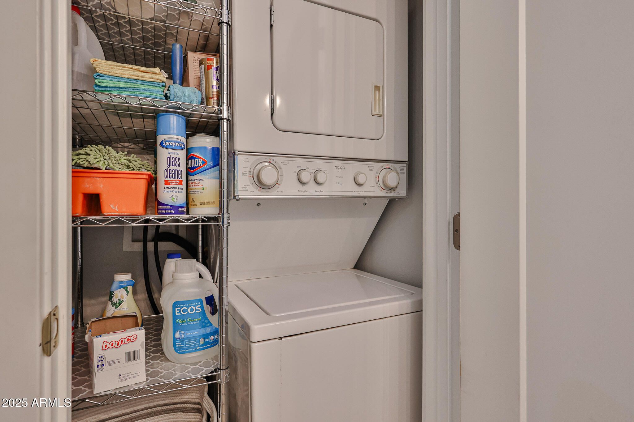 - Stacked Washer/Dryer, Dryer Included, Washer Included, Reverse Osmosis, Refrigerator, Dishwasher, Disposal, Built-In Electric Oven