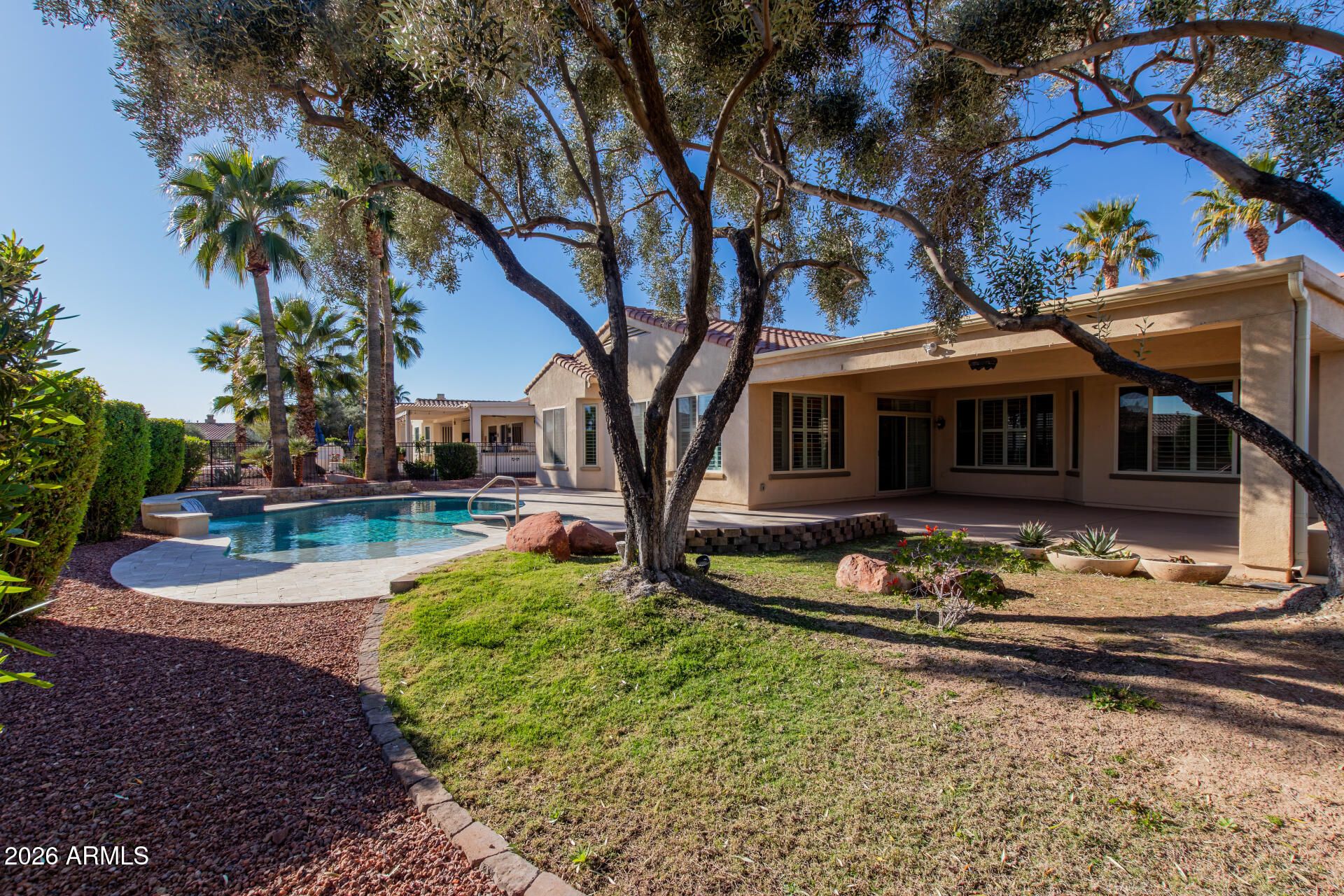Discover resort-style luxury in the prestigious, gated Corte Bella 55+ community—known as the ''Jewel of the West Valley''! This exquisite single-level home blends sophisticated comfort with effortless elegance, boasting 3 spacious bedrooms, 2 baths, and an open, light-filled great room perfect for relaxing or entertaining. The chef-inspired gourmet kitchen shines with sleek quartz countertops, abundant cabinetry featuring pull-out drawers, and a convenient breakfast bar—ideal for casual meals or hosting friends. Plantation shutters throughout enhance the bright, airy feel, while seamless indoor-outdoor flow opens to your private backyard paradise. Dive into your own heated pool and spa, misted by a commercial-grade system for ultimate comfort in the Arizona sun. Enjoy serene, unobstructed views of lush greenbelt thanks to view fencingno rear neighbors, just tranquility and nature. Corte Bella offers an elevated active-adult lifestyle with a championship 18-hole golf course, resort-style pools, a state-of-the-art fitness center and day spa, tennis/pickleball courts, social clubs, and endless opportunities to stay active and connectedall within this beautifully maintained, intimate enclave of just 1,650 homes. Live the dream in this turnkey oasisyour perfect Arizona retreat awaits!