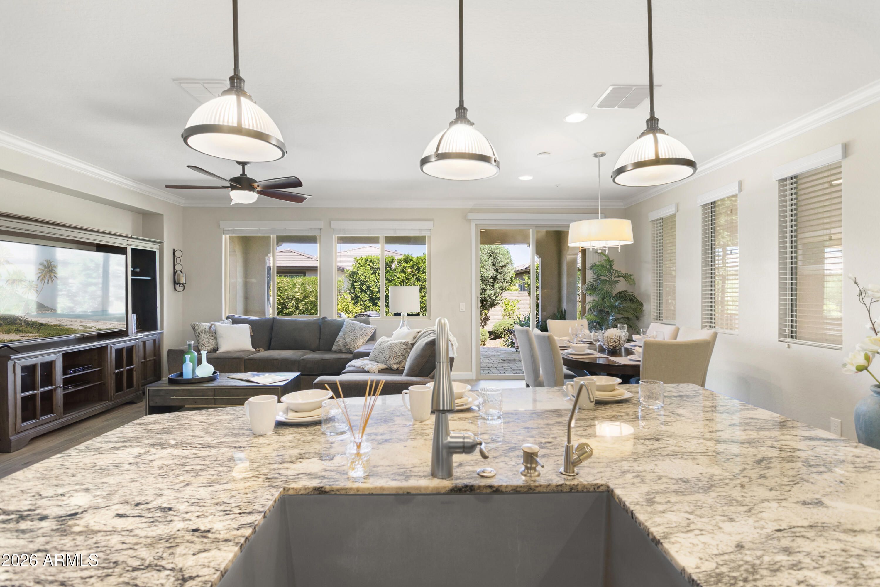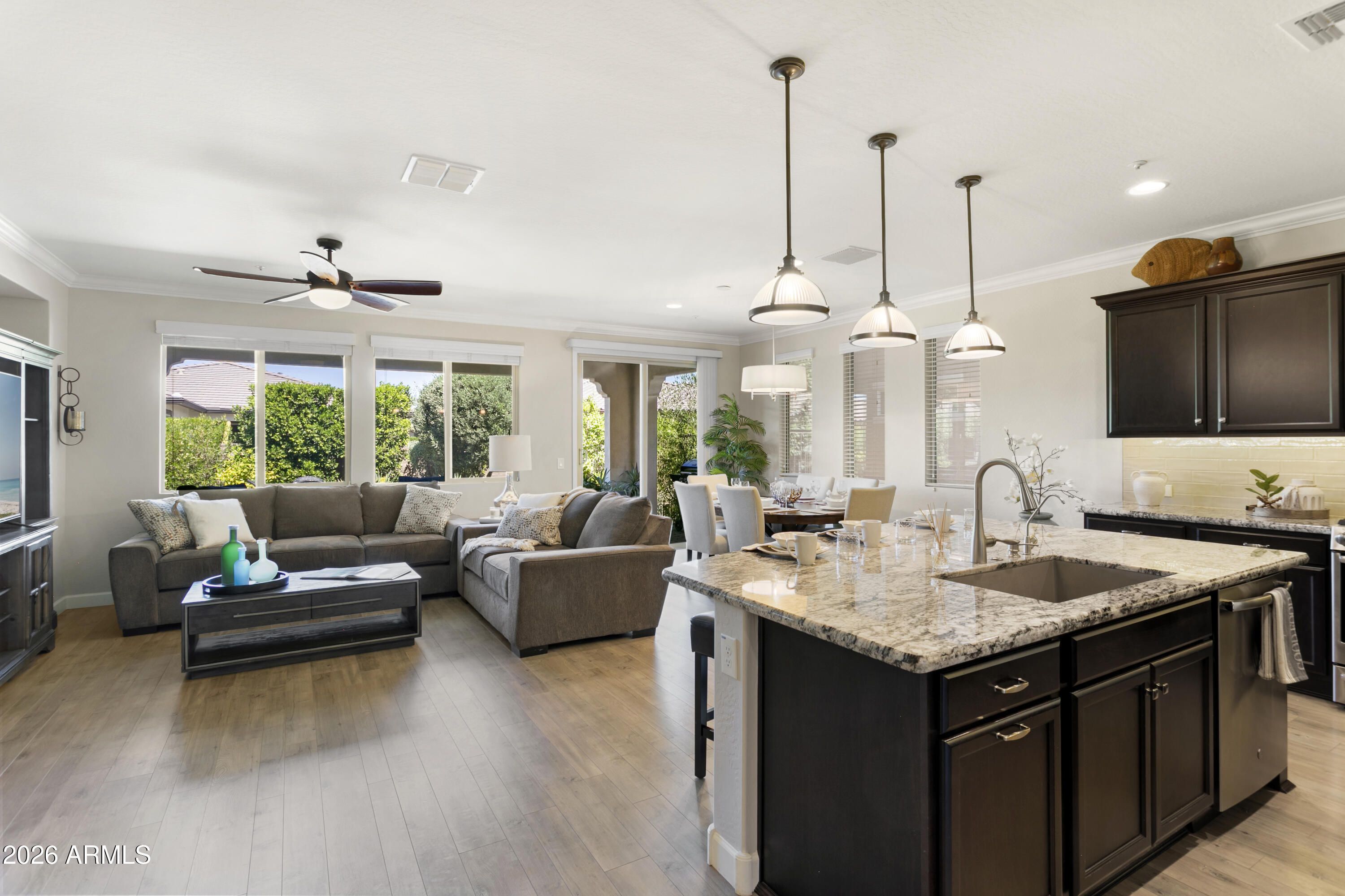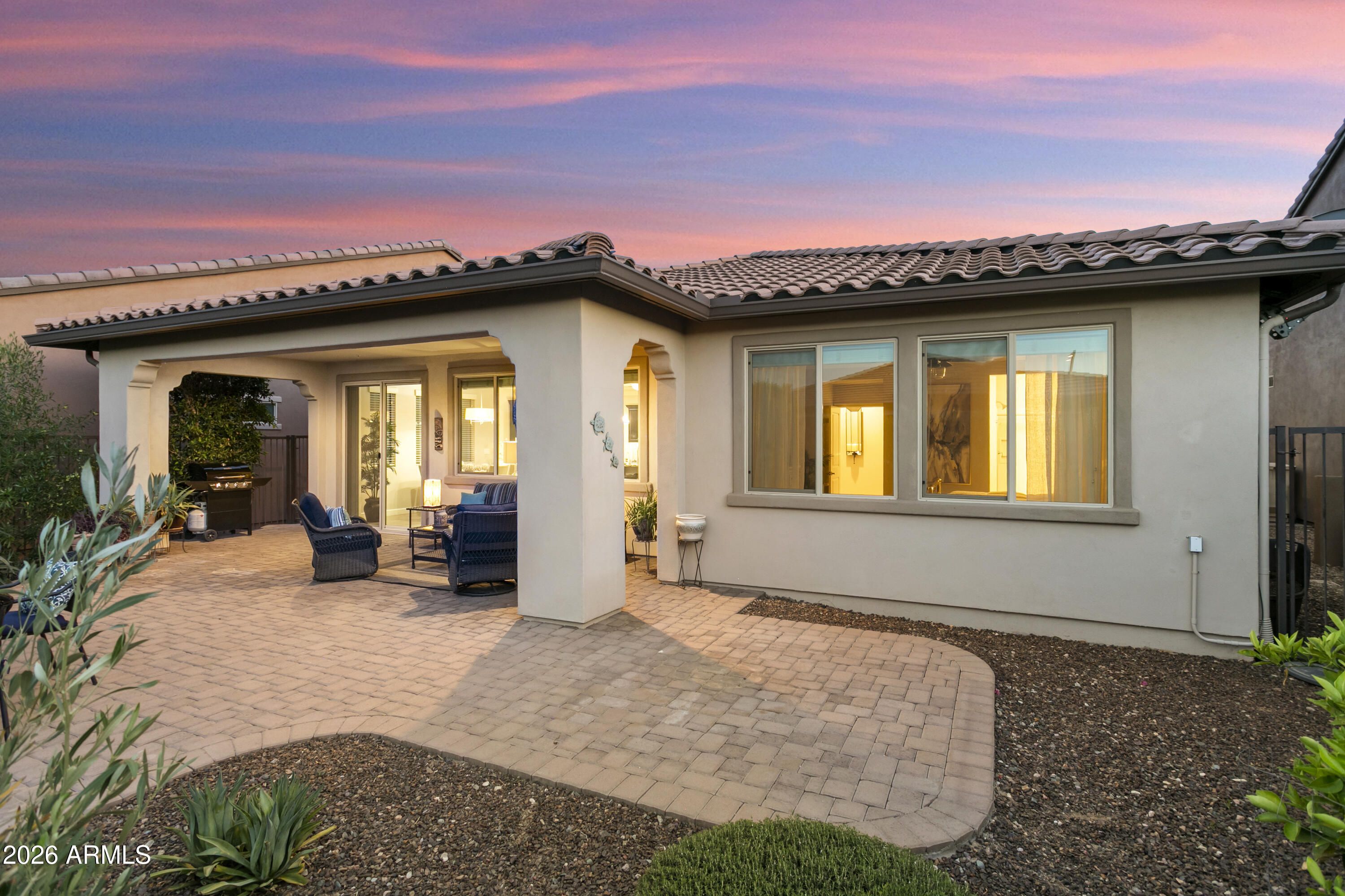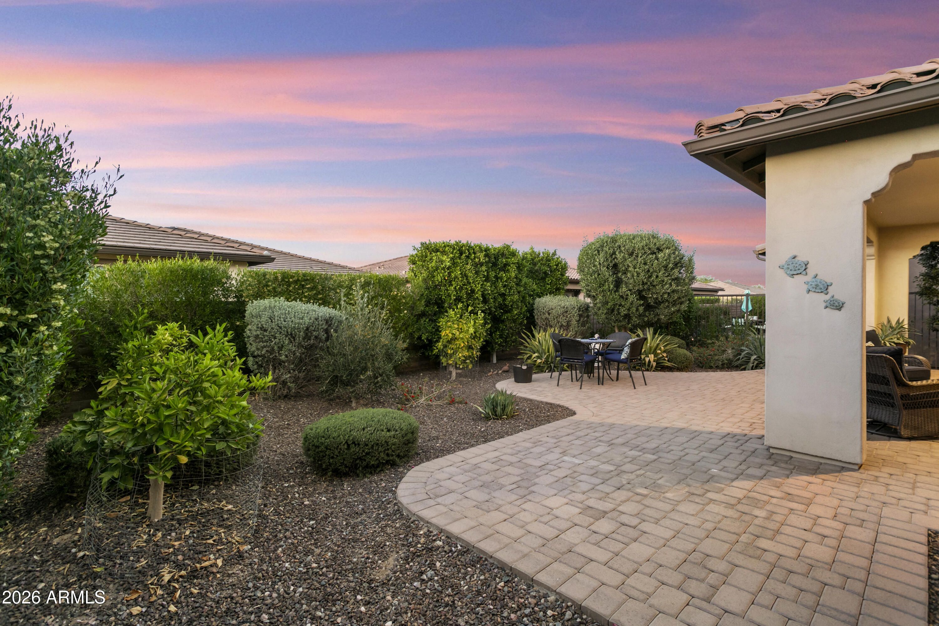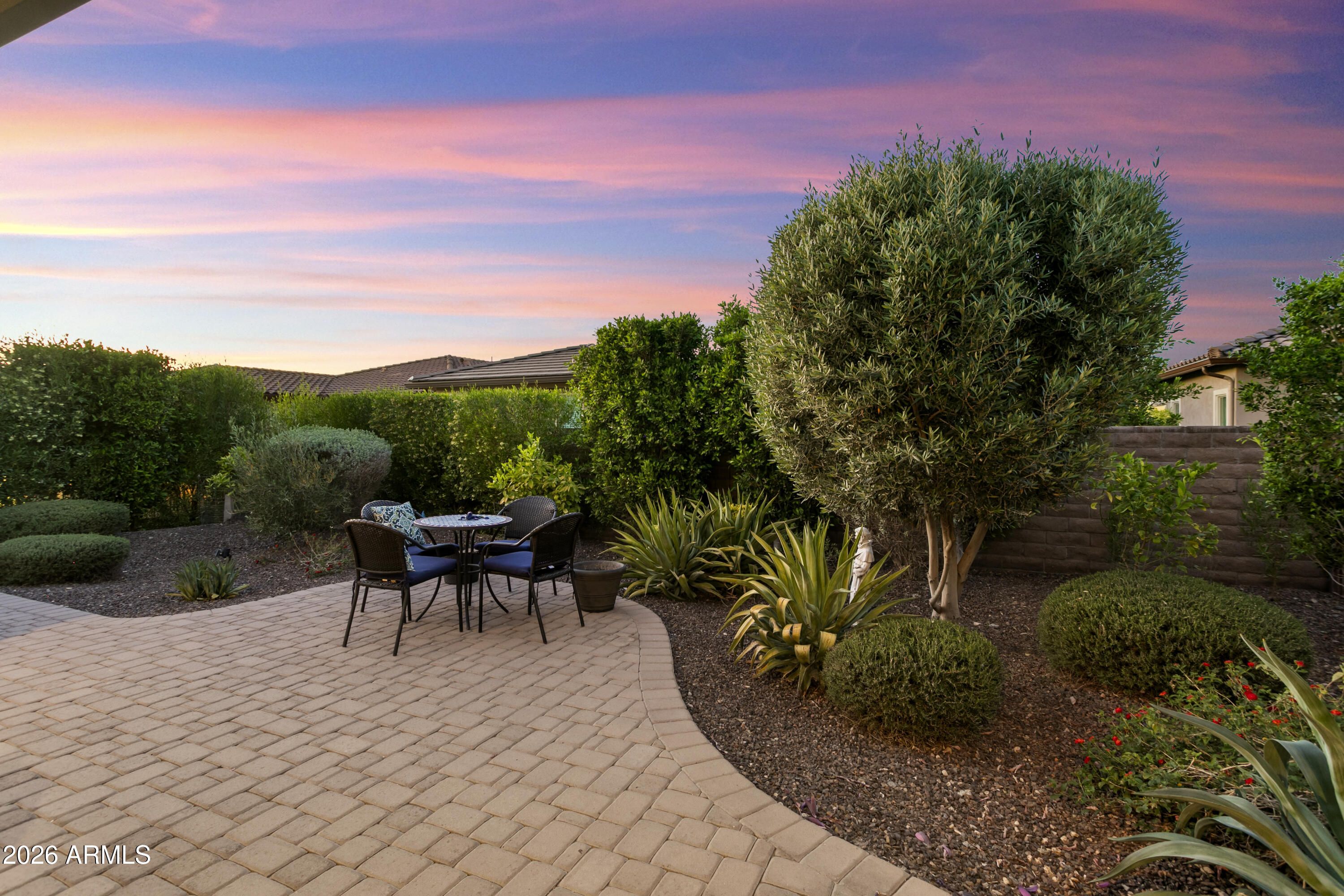 Beautifully appointed. Lightly lived-in TURNKEY home. This popular 'VIBRANT' model is offered FULLY FURNISHED & is move-in ready. Loaded with very TASTEFUL UPGRADES including luxury vinyl flooring throughout with premium tile floors in baths, and premium soft-close cabinetry throughout. The kitchen features attractive granite slab on countertops & island with breakfast bar, designer backsplash, GE Profile stainless appliances with gas stove, Blanco crushed granite sink, reverse osmosis, LED under-cabinet lighting and convenient rollout shelves. The open-concept floor plan is light and bright. Primary bath boasts 2 undermount Kohler sinks and beautiful granite slab countertops & framed mirrors. Guest bath also has granite slab countertops & framed mirrors. Additional highlights include guest bedroom, den, expansive SMART SPACE (TM) with GE frontload PREMIUM INDUSTRIAL WASHER AND DRYER, 2 built-in desks & file cabinets, drop-in sink, storage. Two-car garage with built-in cabinets. VeryPRIVATE FENCED backyard with lush landscape & beautiful custom-designed extended paver patio. Located in award-winning gated, 55+ Trilogy at Vistancia with 5-star-resort style amenities at the 35,000 SF Kiva Club with indoor & outdoor pools, fitness center, day spa, cafe, billiards, meeting rooms, library, tennis courts, pickle ball, bocce ball, events & a plethora of activities to choose from. Outstanding Gary Panks-designed golf course is woven throughout the neighborhood. The Mita Club has additional community amenities. Easy access from Trilogy to the 303, shopping, restaurants, entertainment, Lake Pleasant & Paloma Park.