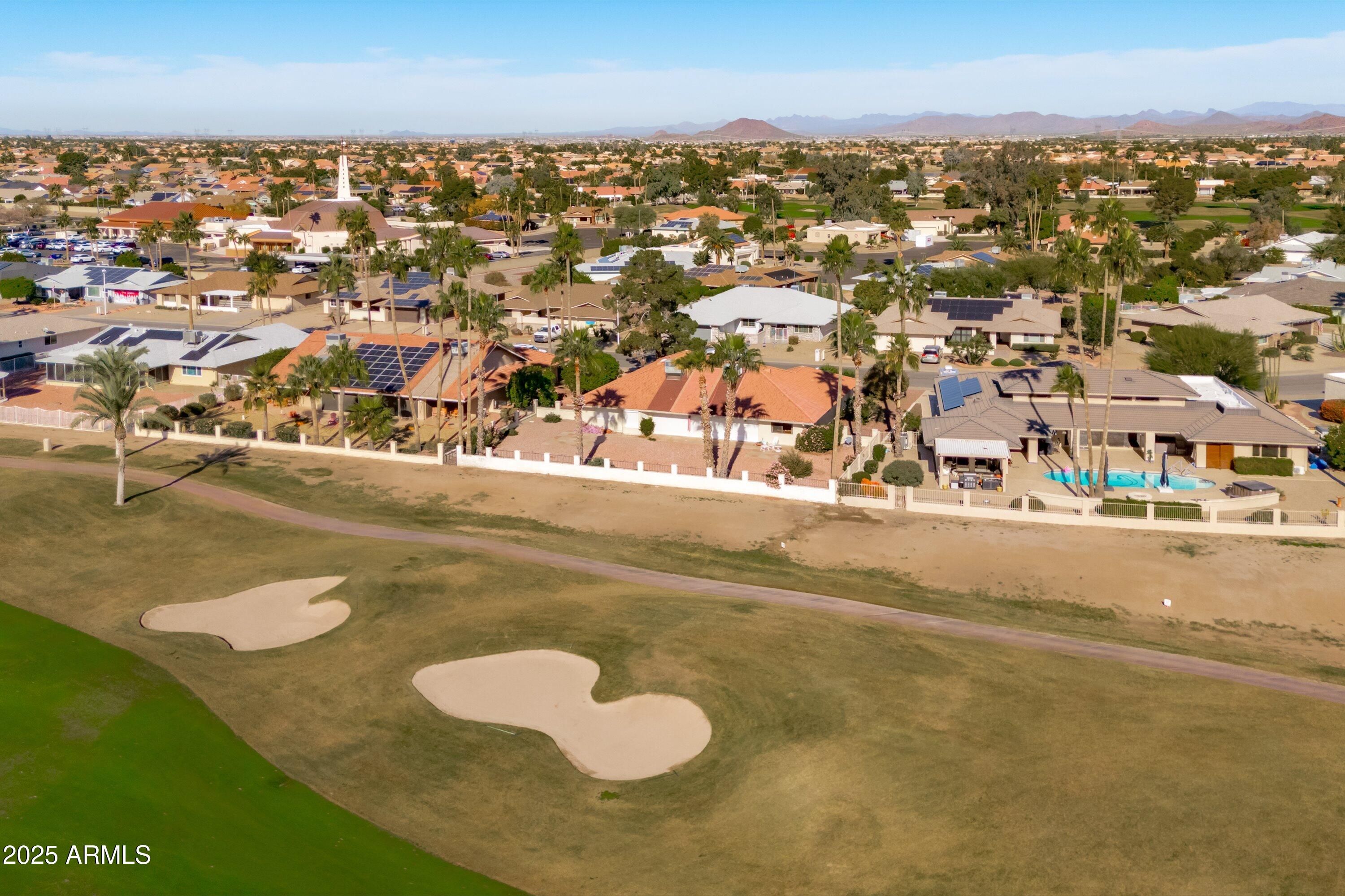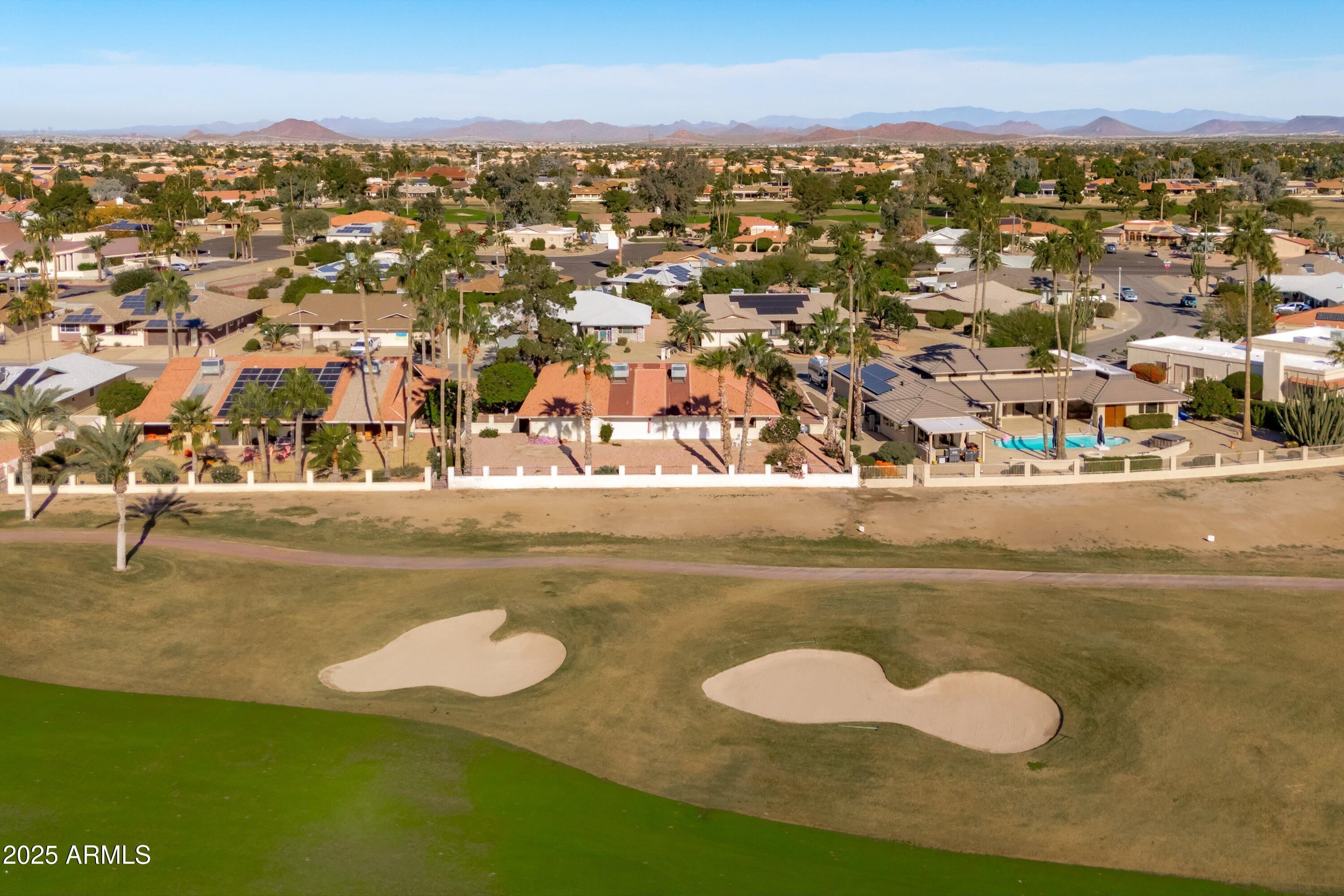 Golf course living at its finest in the Sun City West active adult community. This home sits on a premium golf course lot with desirable north-south exposure and mountain views. Features include laminate wood flooring, a split primary bedroom floor plan, walk-in closets in all bedrooms, mechanical shades, wet bar, and a breakfast nook with bay window. Enjoy a huge laundry room and a spacious extended patio perfect for relaxing or entertaining. The 2.5-car garage includes a golf cart bay and built-in cabinets. Major updates include a new roof in 2024 and newer A/C units installed in 2023. Enjoy all that Sun City West has to offer with golf, recreation centers, and endless activities.