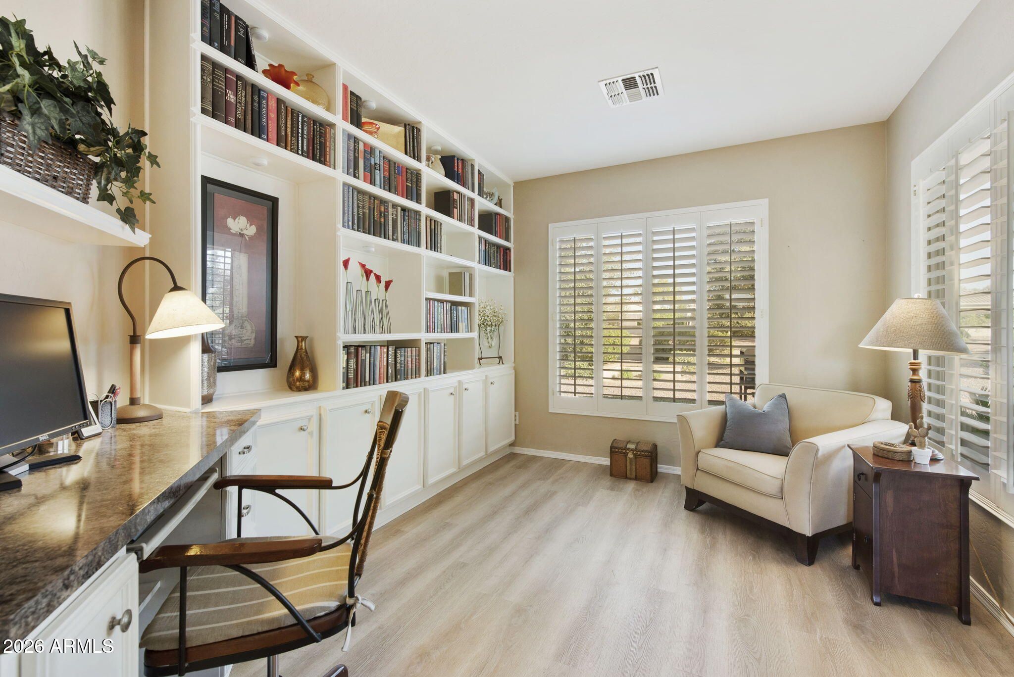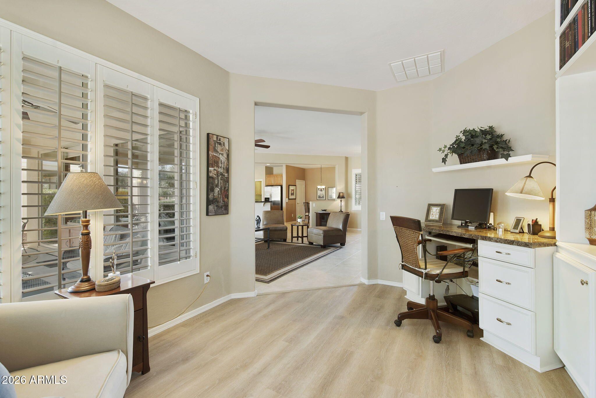 Located on an interior cul-de-sac street within the prestigious Corte Bella Country Club, this San Ysidro offers exceptional value, privacy, and a highly desirable location within walking distance to the Recreation Center, pickleball courts, and community pool. A charming 4' gated courtyard and front sitting area create a warm welcome into this light, bright, and move-in-ready home. This spacious great room floorplan is designed for comfortable Arizona living, with immediate views through large living room windows to an expansive backyard that backs to a wide easement, offering added openness and no homes directly behind. The living room features a custom media wall with built-in TV space and shelving, while shutters throughout the home add style and function. The den is located at the rear of the home to enjoy backyard views and includes custom office built-ins, shelving, shutters, and luxury flooring--ideal for a home office, hobby room, or flex space. Smooth surface tile enhances the main living areas. The kitchen offers an eat-in nook, breakfast bar, pantry, abundant cabinetry, and generous counter space. The laundry room is conveniently located just off the kitchen with direct access to the garage. The garage includes built-in cabinets and a service door to the side yard. Recent care includes HVAC service and a roof tune-up, adding peace of mind. Enjoy the lifestyle and amenities that make Corte Bella Country Club one of the Northwest Valley's premier active adult communities.