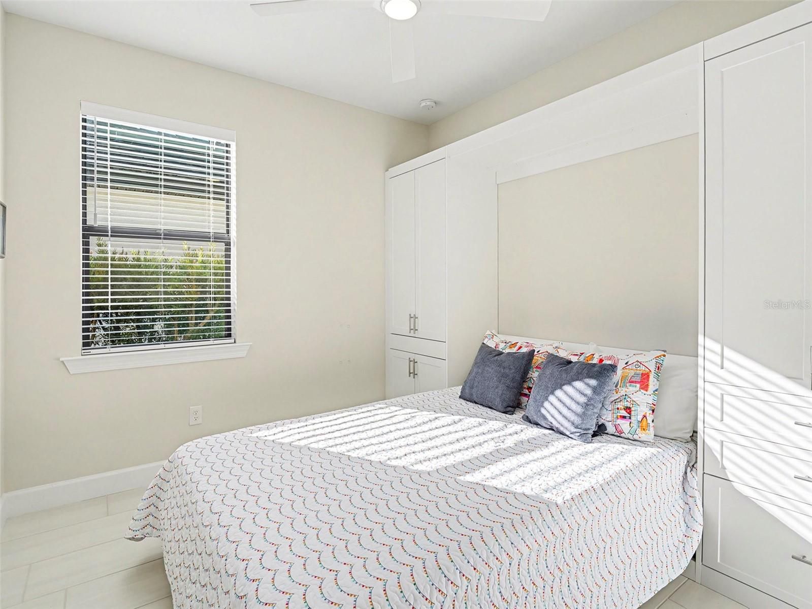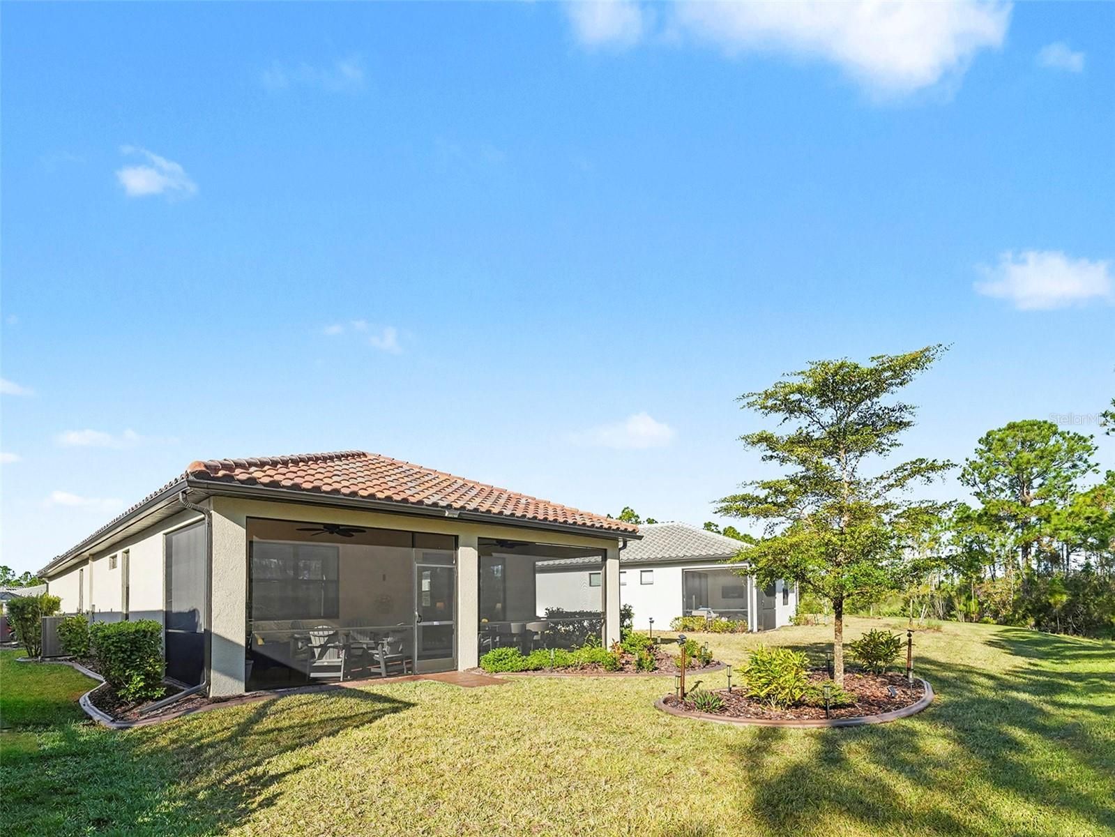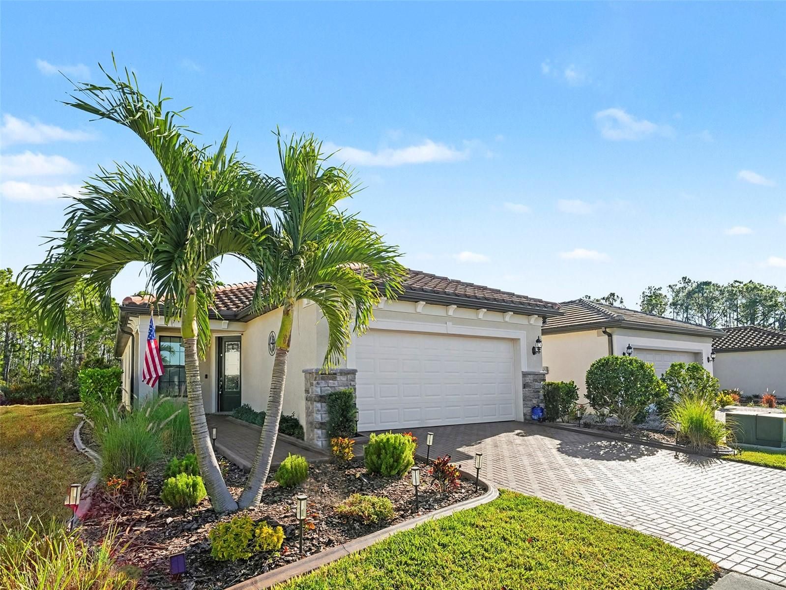 This bright and inviting home is a must-see, offering tranquil views of a serene wooded preserve from the large covered rear lanai and a peaceful pond view from the front. Located at 1344 Raspberry Drive in North Port, Florida, this beautifully upgraded residence combines comfort, style, and resort-style living. The kitchen is a standout, featuring quartz countertops, a tiled backsplash, upgraded white 42" cabinets with crown molding, upgraded stainless steel appliances, and a JennAir refrigerator. The spacious primary suite includes a walk-in closet and a spa-like bath with quartz counters and a floor-to-ceiling tiled shower. The guest bathroom features a tub with tile extending to the ceiling. The second bedroom offers exceptional flexibility with a Murphy bed and built-in storage, making it ideal for guests, hobbies, or crafts. An added flex room with French doors is generously sized to accommodate a queen bed or serve as a den or home office. Notable upgrades include Hurricane Blocker roof vent protection, Hunter Douglas blinds, ceiling fans, landscape curbing, and a sealed driveway and lanai. The extended 4-foot garage (20x24) features epoxy flooring, a screen garage door, and overhead storage racks. No flood insurance is required—this home sits 27 feet above sea level in the highly desirable 55+ Del Webb community. Residents enjoy resort-style amenities including pools, fitness center, pickleball, bocce, craft rooms, and a full calendar of social activities. Turn-key furnished, with golf cart negotiable—this is Florida living at its best.