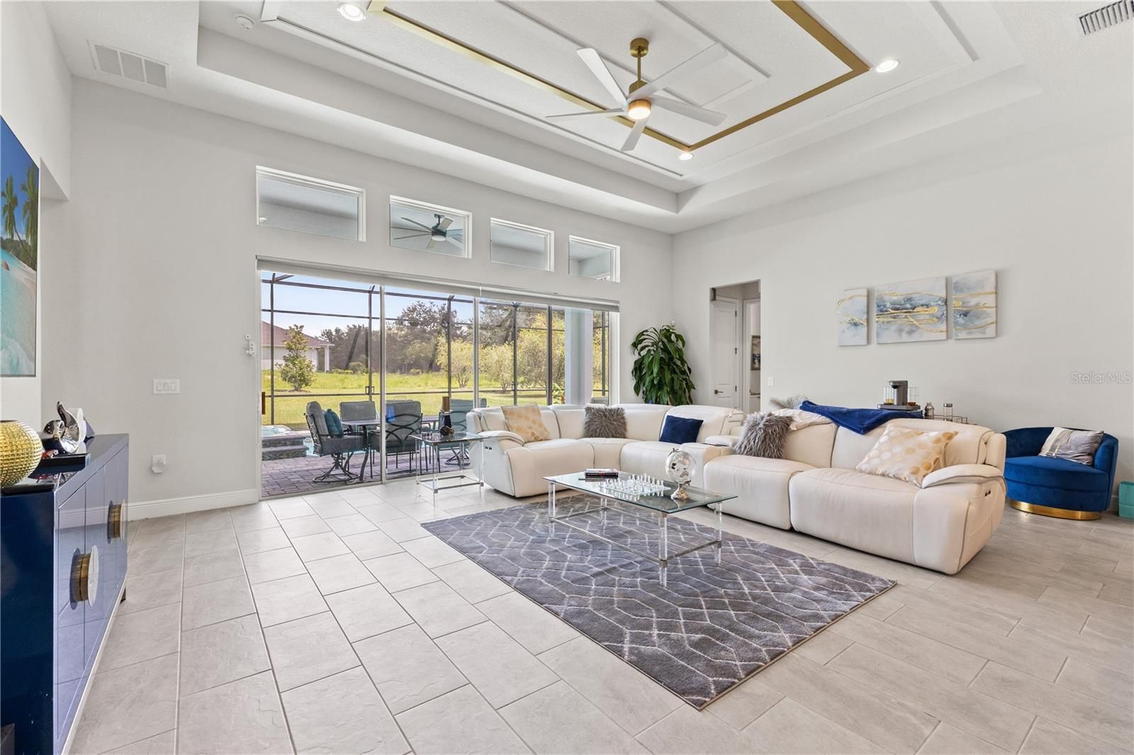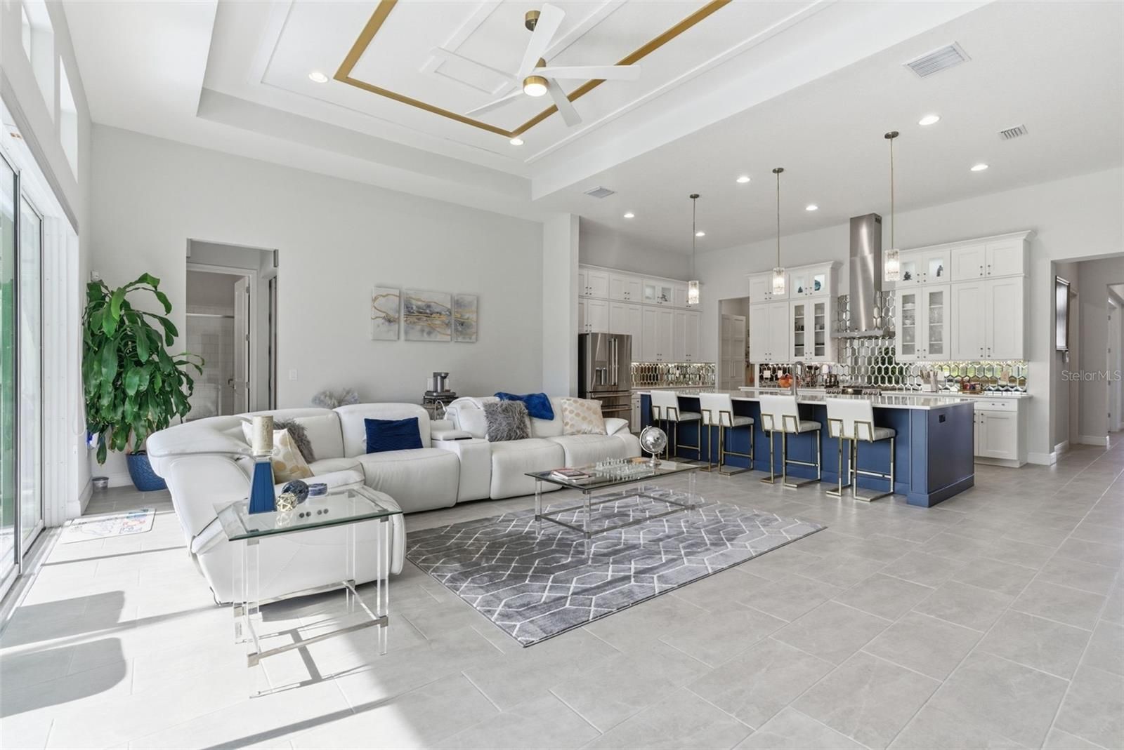 - Ceiling Fan(s), Coffered Ceiling(s), Crown Molding, Eat-in Kitchen, High Ceilings, Kitchen/Family Room Combo, Living/Dining Room, Open Floorplan, Main Level Primary, Solid Surface Counters, Thermostat, Tray Ceiling(s), Walk-In Closet(s), Window Treatments
