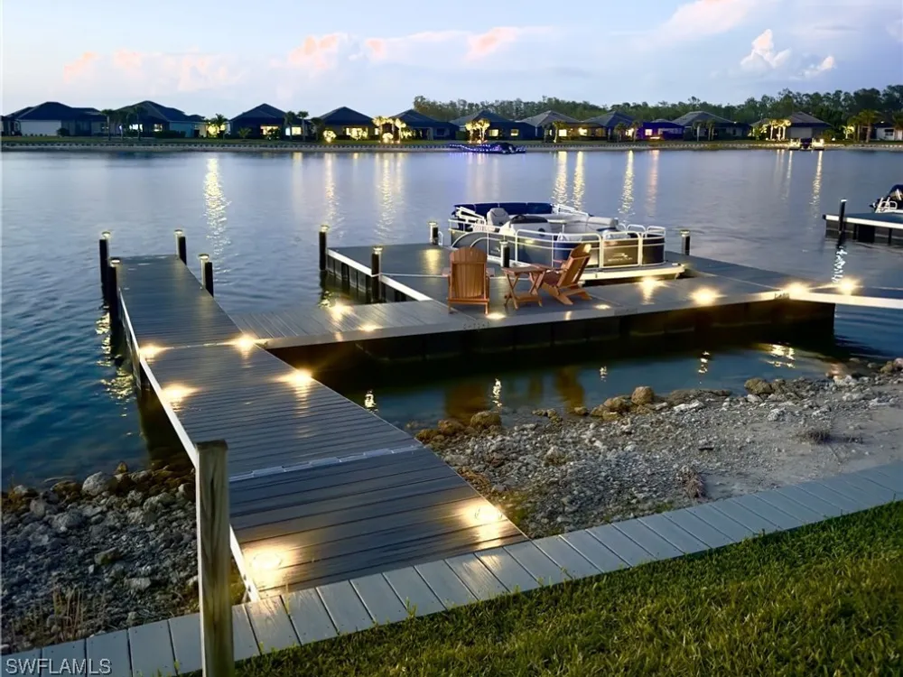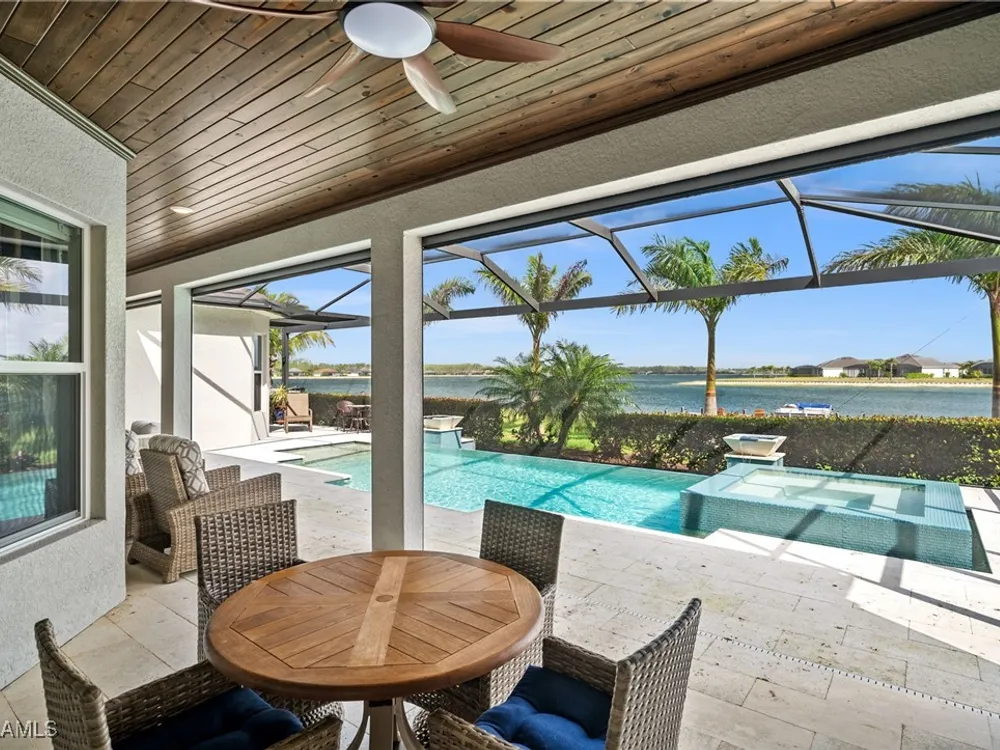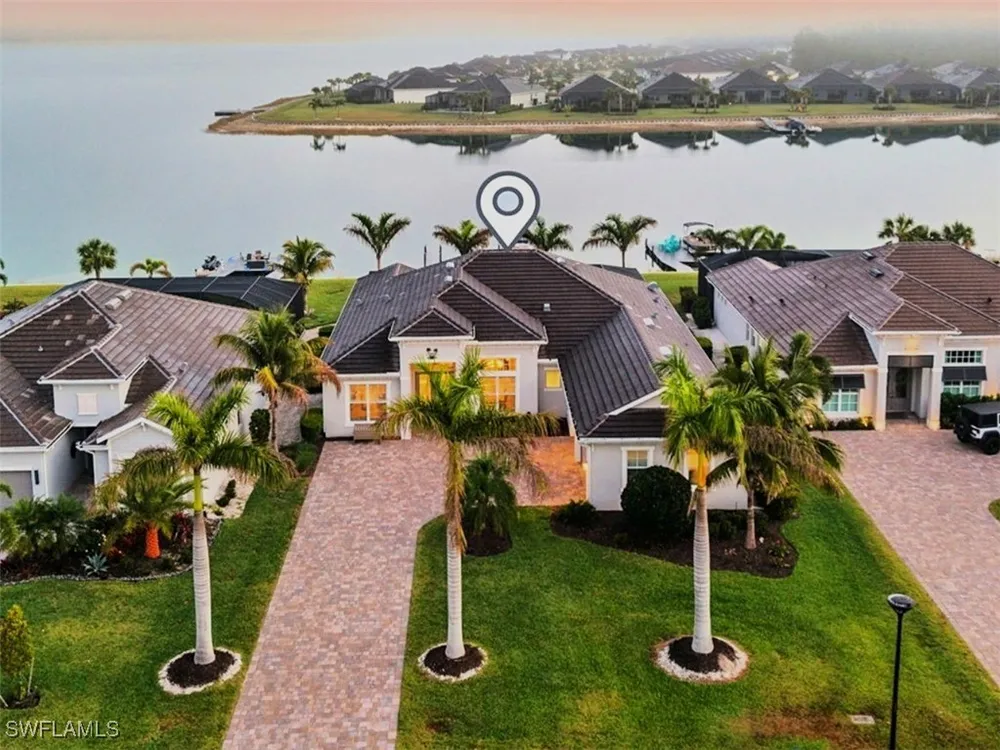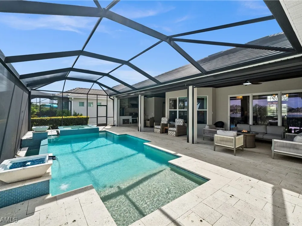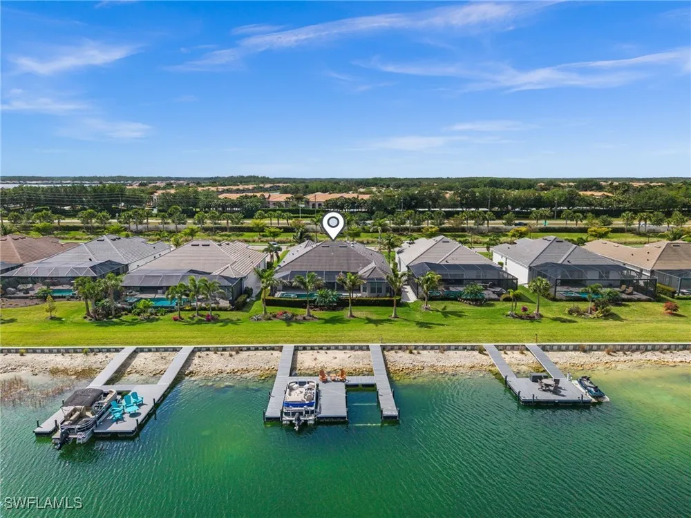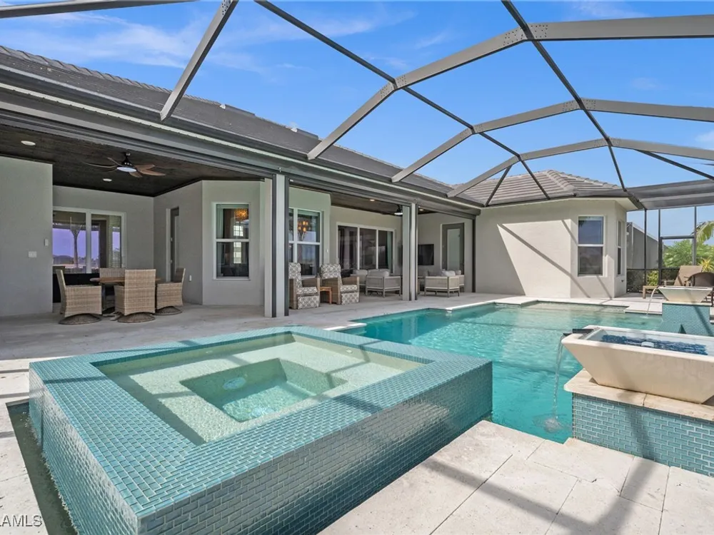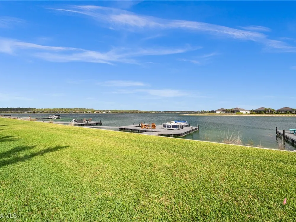 The LARGEST PREVIOUS SHOWCASE MODEL - the “Bougainvillea Model” Estate Home – a true Masterpiece - is now for sale! This home offers it all – nothing is missing! Enjoy a DOUBLE BOAT DOCK and the HIGHEST AMOUNT OF BUILDER UPGRADES available! The owners elevated this waterfront estate into a complete CUSTOM-DESIGNED residence, with upgrades totaling over $549,000, featuring designer furnishings and structural enhancements far beyond comparable homes. This turnkey residence highlights exquisite glossy tile flooring with bespoke elements. This is a RARE MASTERPIECE and a must-see! The highly desirable floor plan offers 4 bedrooms, 3 bathrooms, an air-conditioned and insulated 3-car garage, a heated pool with spa, summer kitchen, and an extraordinary DOUBLE BOAT DOCK – delivering the ultimate in outdoor living and boating luxury. EXCEPTIONAL UPGRADES added after purchase include top-tier luxury furniture and new outdoor patio sets (approx. $150,000) and spectacular flooring throughout. The striking Italian Reves Blue Glossy Porcelain Tile (24” x 48”), accented by custom marble insets, flows elegantly through the entrance, living room, kitchen, formal dining, hallway, powder bath, laundry, and office. A dramatic marble inlay at the entrance is mirrored by a second marble feature at the fireplace, both adding striking architectural detail. All 3 baths have been completely renovated, including new tile, shower floors, and frameless glass enclosures. Additional improvements include new baseboards, fresh paint, Hunter Douglas blinds, and matching Louver Hunter Douglas shutters in the dining room and office. Other luxury features include a central vac system, 3 AC units, a Kinetico water softener, and high-end appliances – including a GE refrigerator with built-in coffee maker. Exterior highlights include a DOUBLE BOAT DOCK with solar lighting, enhancing the evening ambiance. Professionally designed landscaping showcases 3 majestic 28-foot King Palms and lush greenery in both front and back. Outdoors is a true oasis – complete with a new firepit, exclusive outdoor furniture, and a 65" outdoor swivel TV – perfect for entertaining or relaxing in style. The ADT security system features 4 exterior cameras and a doorbell camera. The insulated garage includes steel ceiling-mounted storage racks for added functionality. WORLD-CLASS AMENITIES and a vibrant lifestyle await! With over 800 acres of freshwater lakes, WildBlue welcomes boaters and water sports enthusiasts, complemented by a 20-acre amenity campus including a fitness club, lap pool, day spa, pickleball, tennis, basketball, and more. The Clubhouse features a resort-style pool, restaurant, poolside bar, private sand beach, and cabanas. Conveniently located near Gulf Coast Town Center, Coconut Point Mall, and RSW International Airport. ULTIMATE LUXURY. UNRIVALED LOCATION. Welcome to your dream home!