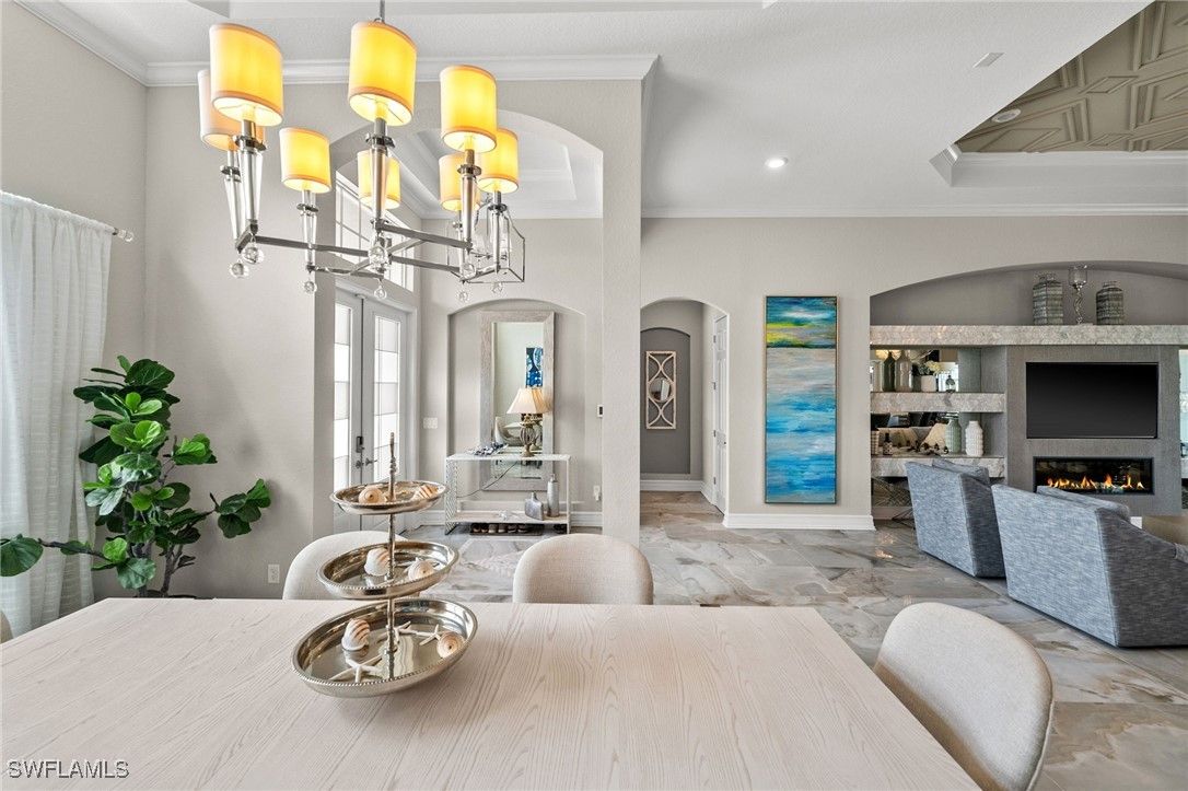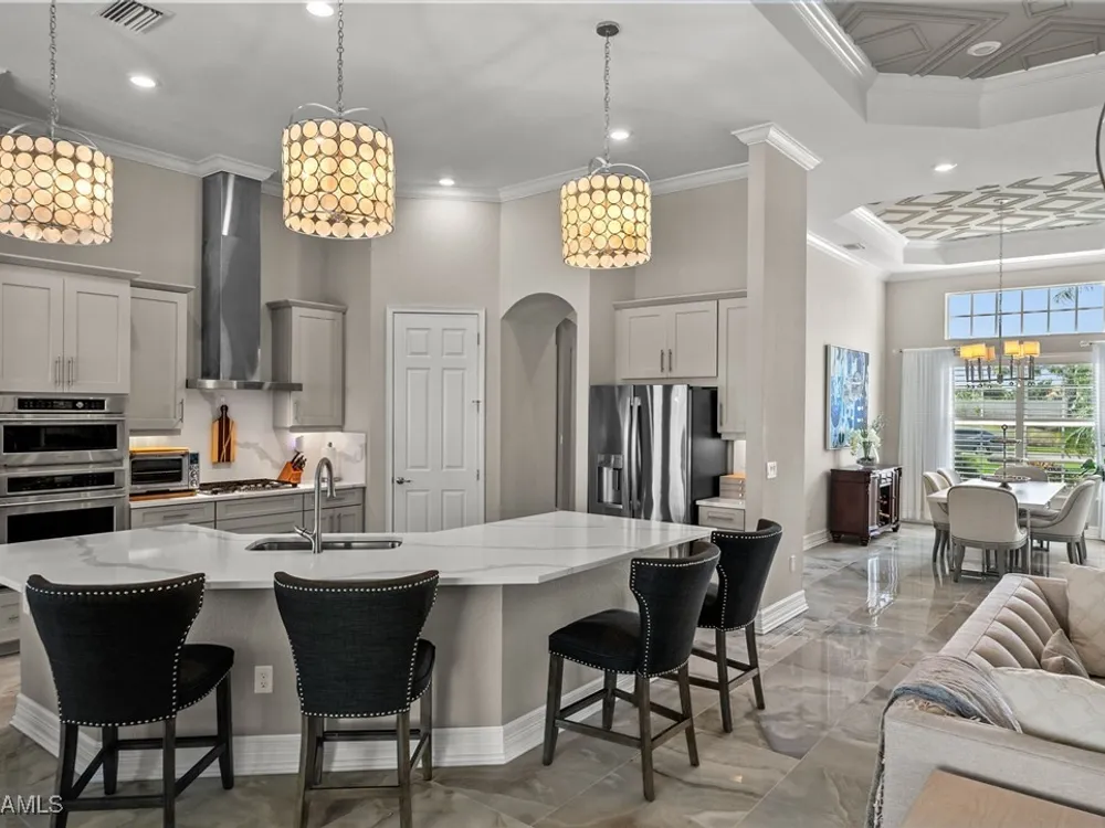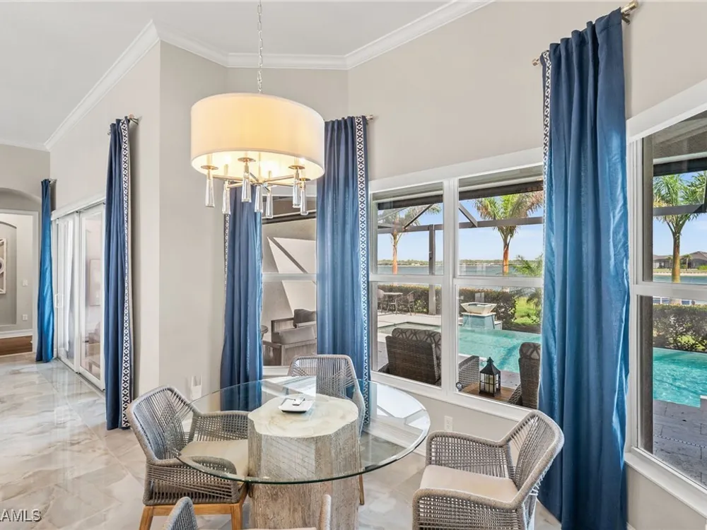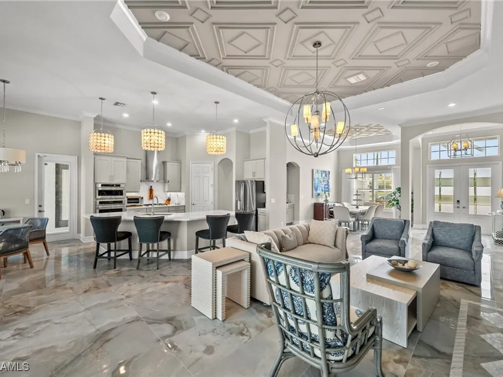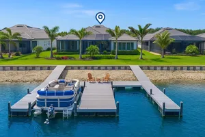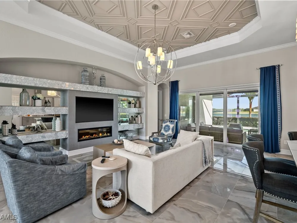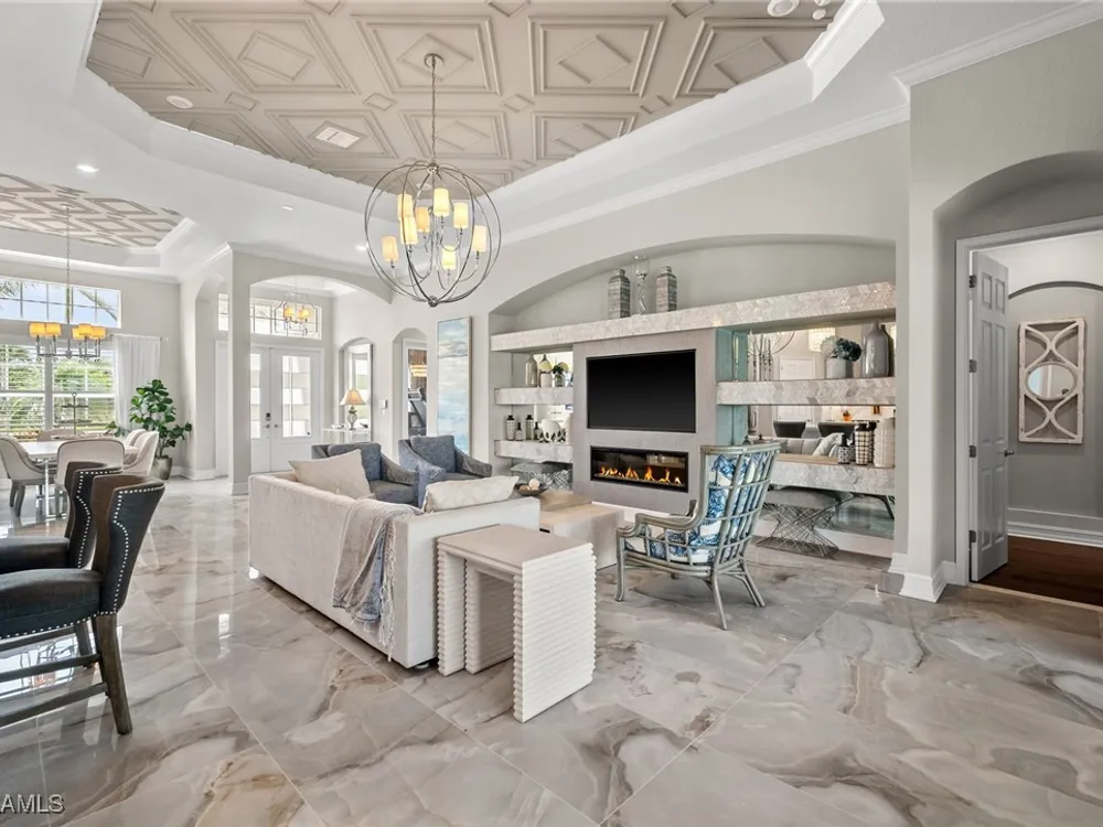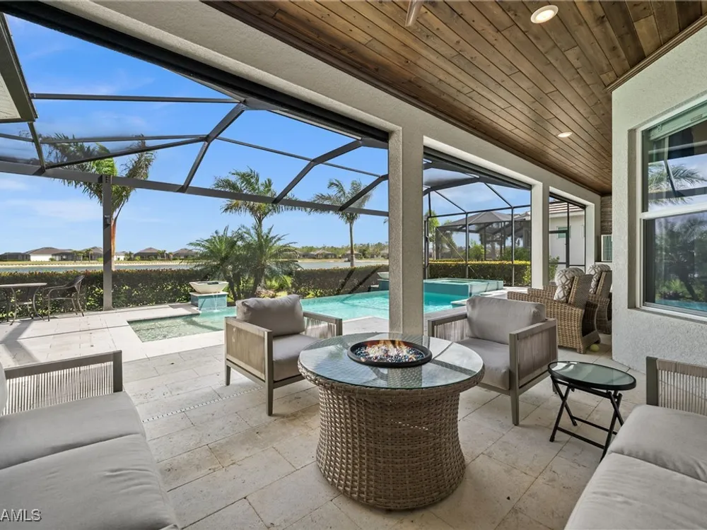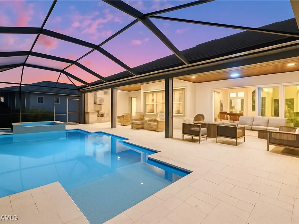 The LARGEST PREVIOUS SHOWCASE MODEL - the “Bougainvillea Model” Estate Home – a true Masterpiece - is now for sale! This home offers it all – nothing is missing! Enjoy a DOUBLE BOAT DOCK and the HIGHEST AMOUNT OF BUILDER UPGRADES available! The owners elevated this waterfront estate into a complete CUSTOM-DESIGNED residence, with upgrades totaling over $549,000, featuring designer furnishings and structural enhancements far beyond comparable homes. This turnkey residence highlights exquisite glossy tile flooring with bespoke elements. This is a RARE MASTERPIECE and a must-see! The highly desirable floor plan offers 4 bedrooms, 3 bathrooms, an air-conditioned and insulated 3-car garage, a heated pool with spa, summer kitchen, and an extraordinary DOUBLE BOAT DOCK – delivering the ultimate in outdoor living and boating luxury. EXCEPTIONAL UPGRADES added after purchase include top-tier luxury furniture and new outdoor patio sets (approx. $150,000) and spectacular flooring throughout. The striking Italian Reves Blue Glossy Porcelain Tile (24” x 48”), accented by custom marble insets, flows elegantly through the entrance, living room, kitchen, formal dining, hallway, powder bath, laundry, and office. A dramatic marble inlay at the entrance is mirrored by a second marble feature at the fireplace, both adding striking architectural detail. All 3 baths have been completely renovated, including new tile, shower floors, and frameless glass enclosures. Additional improvements include new baseboards, fresh paint, Hunter Douglas blinds, and matching Louver Hunter Douglas shutters in the dining room and office. Other luxury features include a central vac system, 3 AC units, a Kinetico water softener, and high-end appliances – including a GE refrigerator with built-in coffee maker. Exterior highlights include a DOUBLE BOAT DOCK with solar lighting, enhancing the evening ambiance. Professionally designed landscaping showcases 3 majestic 28-foot King Palms and lush greenery in both front and back. Outdoors is a true oasis – complete with a new firepit, exclusive outdoor furniture, and a 65" outdoor swivel TV – perfect for entertaining or relaxing in style. The ADT security system features 4 exterior cameras and a doorbell camera. The insulated garage includes steel ceiling-mounted storage racks for added functionality. WORLD-CLASS AMENITIES and a vibrant lifestyle await! With over 800 acres of freshwater lakes, WildBlue welcomes boaters and water sports enthusiasts, complemented by a 20-acre amenity campus including a fitness club, lap pool, day spa, pickleball, tennis, basketball, and more. The Clubhouse features a resort-style pool, restaurant, poolside bar, private sand beach, and cabanas. Conveniently located near Gulf Coast Town Center, Coconut Point Mall, and RSW International Airport. ULTIMATE LUXURY. UNRIVALED LOCATION. Welcome to your dream home!