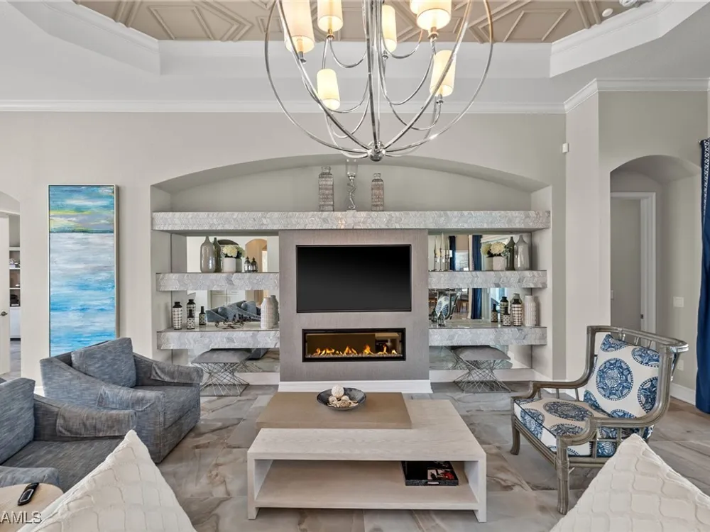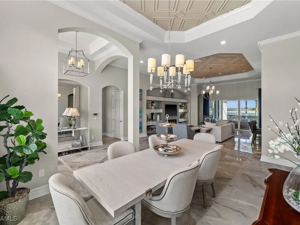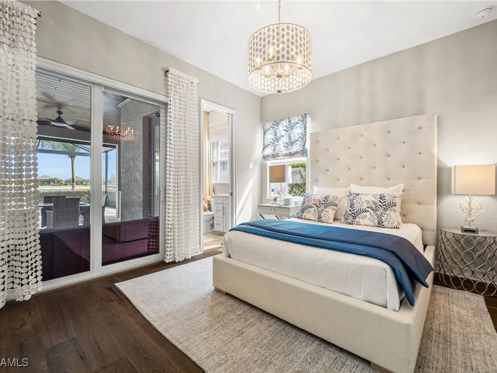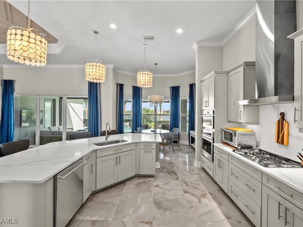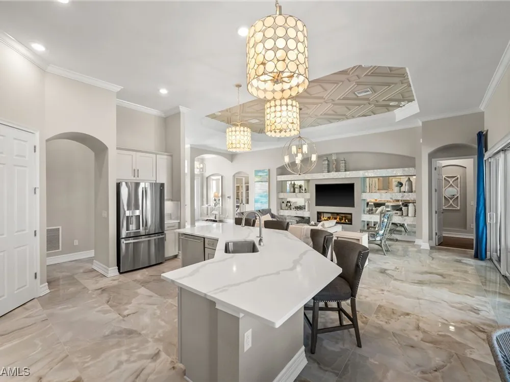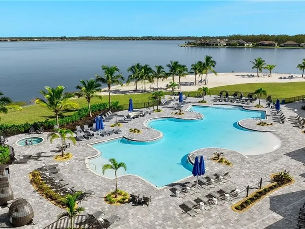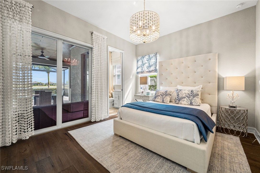 The LARGEST PREVIOUS SHOWCASE MODEL - the “Bougainvillea Model” Estate Home – a true Masterpiece - is now for sale! This home offers it all – nothing is missing! Enjoy a DOUBLE BOAT DOCK and the HIGHEST AMOUNT OF BUILDER UPGRADES available! The owners elevated this waterfront estate into a complete CUSTOM-DESIGNED residence, with upgrades totaling over $549,000, featuring designer furnishings and structural enhancements far beyond comparable homes. This turnkey residence highlights exquisite glossy tile flooring with bespoke elements. This is a RARE MASTERPIECE and a must-see! The highly desirable floor plan offers 4 bedrooms, 3 bathrooms, an air-conditioned and insulated 3-car garage, a heated pool with spa, summer kitchen, and an extraordinary DOUBLE BOAT DOCK – delivering the ultimate in outdoor living and boating luxury. EXCEPTIONAL UPGRADES added after purchase include top-tier luxury furniture and new outdoor patio sets (approx. $150,000) and spectacular flooring throughout. The striking Italian Reves Blue Glossy Porcelain Tile (24” x 48”), accented by custom marble insets, flows elegantly through the entrance, living room, kitchen, formal dining, hallway, powder bath, laundry, and office. A dramatic marble inlay at the entrance is mirrored by a second marble feature at the fireplace, both adding striking architectural detail. All 3 baths have been completely renovated, including new tile, shower floors, and frameless glass enclosures. Additional improvements include new baseboards, fresh paint, Hunter Douglas blinds, and matching Louver Hunter Douglas shutters in the dining room and office. Other luxury features include a central vac system, 3 AC units, a Kinetico water softener, and high-end appliances – including a GE refrigerator with built-in coffee maker. Exterior highlights include a DOUBLE BOAT DOCK with solar lighting, enhancing the evening ambiance. Professionally designed landscaping showcases 3 majestic 28-foot King Palms and lush greenery in both front and back. Outdoors is a true oasis – complete with a new firepit, exclusive outdoor furniture, and a 65" outdoor swivel TV – perfect for entertaining or relaxing in style. The ADT security system features 4 exterior cameras and a doorbell camera. The insulated garage includes steel ceiling-mounted storage racks for added functionality. WORLD-CLASS AMENITIES and a vibrant lifestyle await! With over 800 acres of freshwater lakes, WildBlue welcomes boaters and water sports enthusiasts, complemented by a 20-acre amenity campus including a fitness club, lap pool, day spa, pickleball, tennis, basketball, and more. The Clubhouse features a resort-style pool, restaurant, poolside bar, private sand beach, and cabanas. Conveniently located near Gulf Coast Town Center, Coconut Point Mall, and RSW International Airport. ULTIMATE LUXURY. UNRIVALED LOCATION. Welcome to your dream home!
