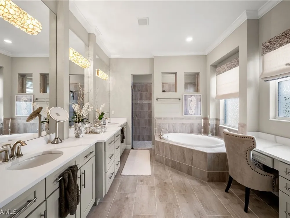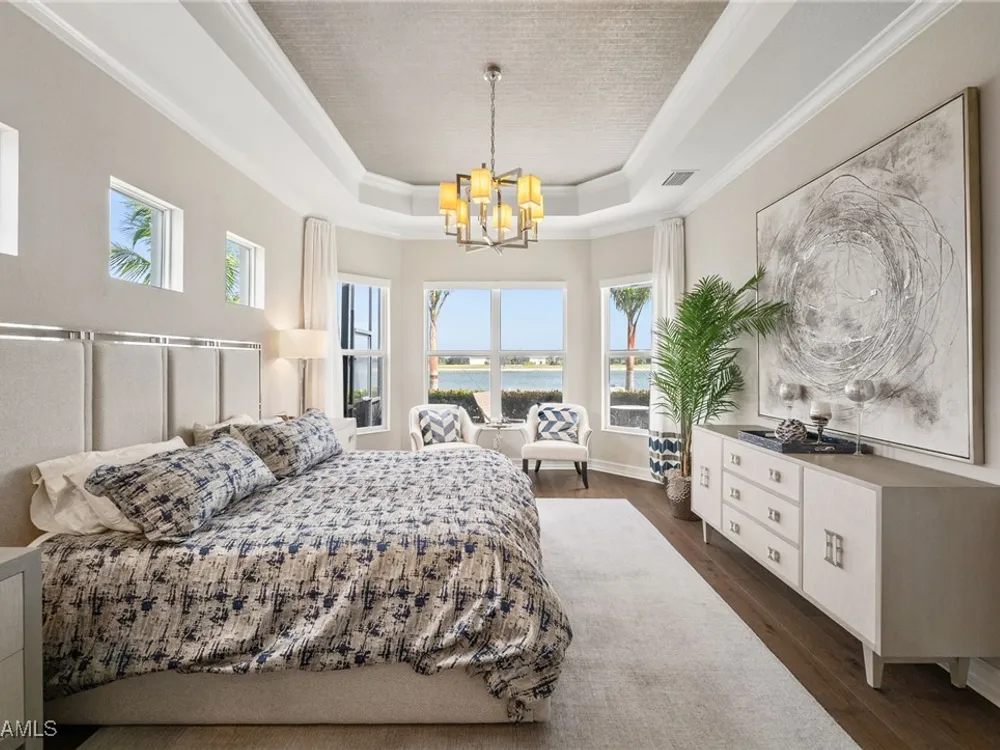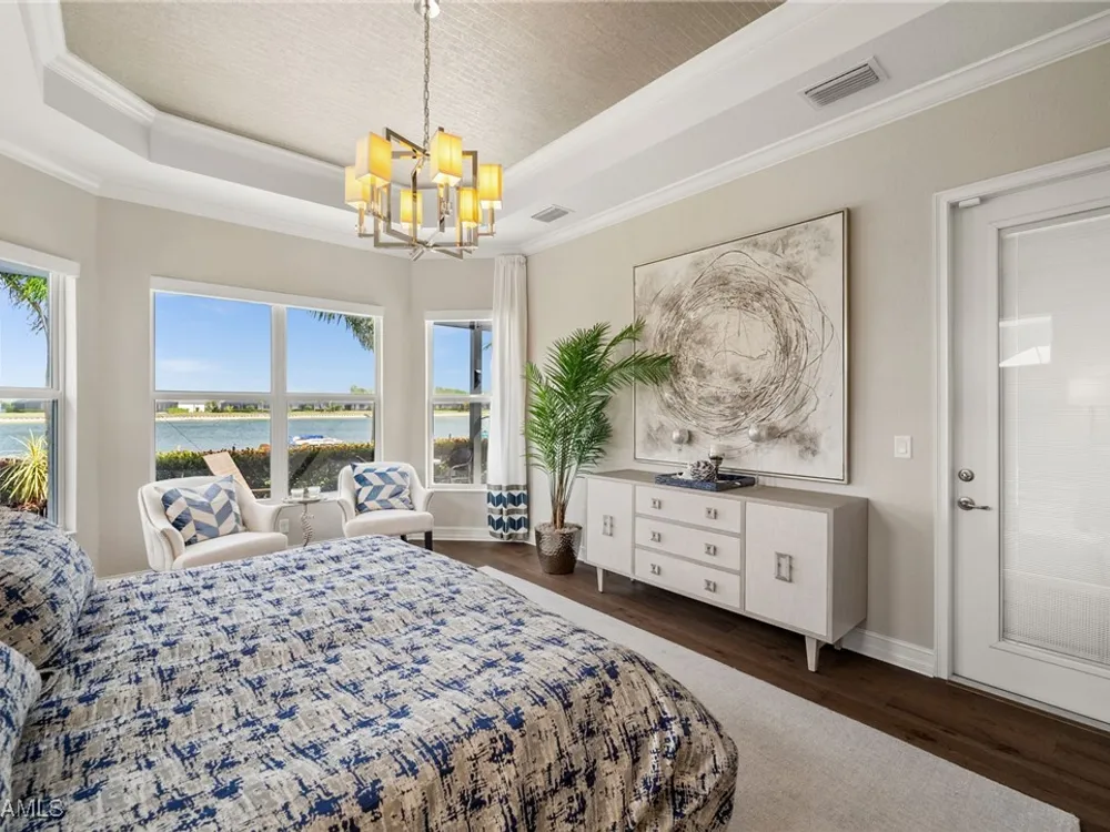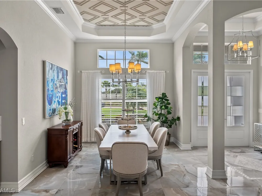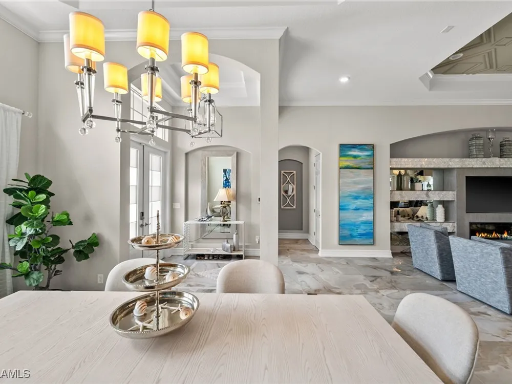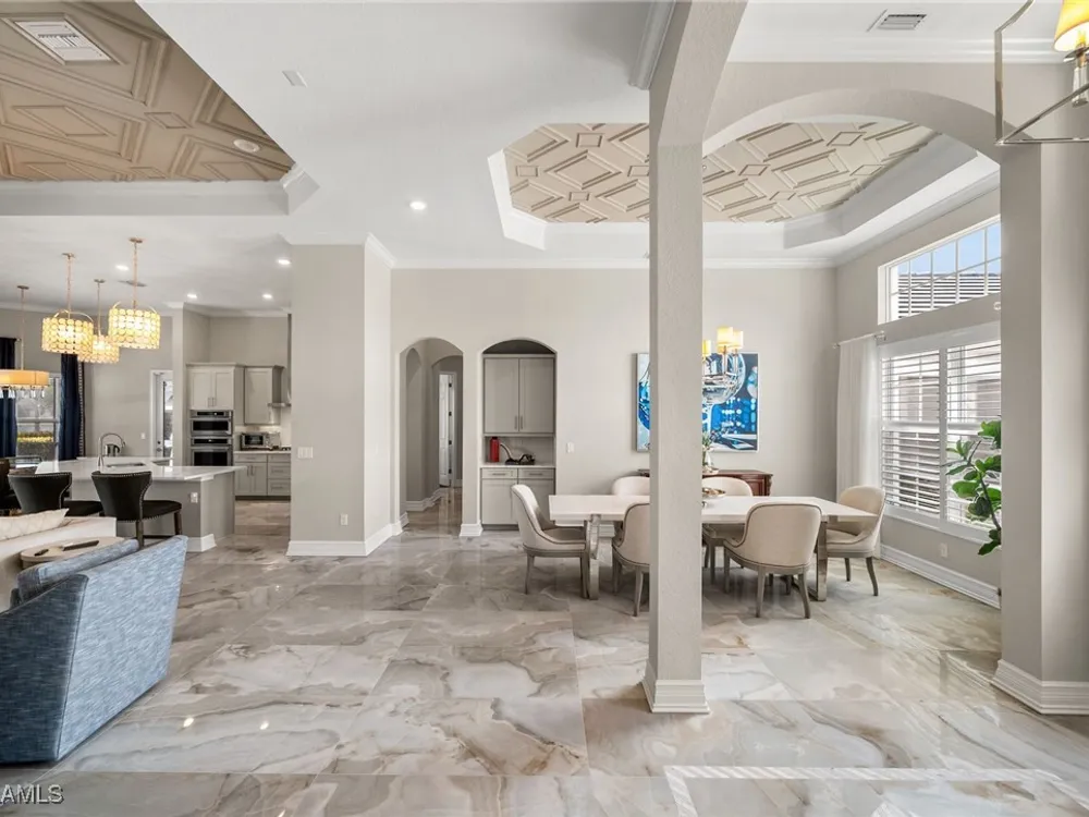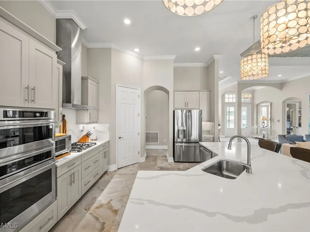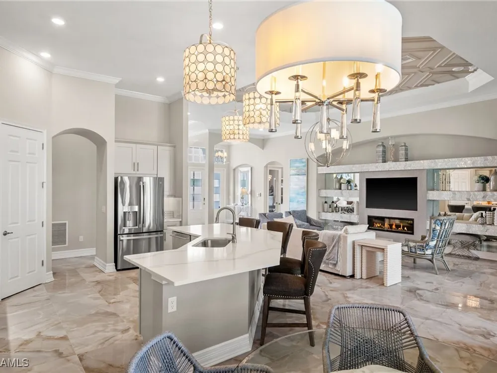 The LARGEST PREVIOUS SHOWCASE MODEL - the “Bougainvillea Model” Estate Home – a true Masterpiece - is now for sale! This home offers it all – nothing is missing! Enjoy a DOUBLE BOAT DOCK and the HIGHEST AMOUNT OF BUILDER UPGRADES available! The owners elevated this waterfront estate into a complete CUSTOM-DESIGNED residence, with upgrades totaling over $549,000, featuring designer furnishings and structural enhancements far beyond comparable homes. This turnkey residence highlights exquisite glossy tile flooring with bespoke elements. This is a RARE MASTERPIECE and a must-see! The highly desirable floor plan offers 4 bedrooms, 3 bathrooms, an air-conditioned and insulated 3-car garage, a heated pool with spa, summer kitchen, and an extraordinary DOUBLE BOAT DOCK – delivering the ultimate in outdoor living and boating luxury. EXCEPTIONAL UPGRADES added after purchase include top-tier luxury furniture and new outdoor patio sets (approx. $150,000) and spectacular flooring throughout. The striking Italian Reves Blue Glossy Porcelain Tile (24” x 48”), accented by custom marble insets, flows elegantly through the entrance, living room, kitchen, formal dining, hallway, powder bath, laundry, and office. A dramatic marble inlay at the entrance is mirrored by a second marble feature at the fireplace, both adding striking architectural detail. All 3 baths have been completely renovated, including new tile, shower floors, and frameless glass enclosures. Additional improvements include new baseboards, fresh paint, Hunter Douglas blinds, and matching Louver Hunter Douglas shutters in the dining room and office. Other luxury features include a central vac system, 3 AC units, a Kinetico water softener, and high-end appliances – including a GE refrigerator with built-in coffee maker. Exterior highlights include a DOUBLE BOAT DOCK with solar lighting, enhancing the evening ambiance. Professionally designed landscaping showcases 3 majestic 28-foot King Palms and lush greenery in both front and back. Outdoors is a true oasis – complete with a new firepit, exclusive outdoor furniture, and a 65" outdoor swivel TV – perfect for entertaining or relaxing in style. The ADT security system features 4 exterior cameras and a doorbell camera. The insulated garage includes steel ceiling-mounted storage racks for added functionality. WORLD-CLASS AMENITIES and a vibrant lifestyle await! With over 800 acres of freshwater lakes, WildBlue welcomes boaters and water sports enthusiasts, complemented by a 20-acre amenity campus including a fitness club, lap pool, day spa, pickleball, tennis, basketball, and more. The Clubhouse features a resort-style pool, restaurant, poolside bar, private sand beach, and cabanas. Conveniently located near Gulf Coast Town Center, Coconut Point Mall, and RSW International Airport. ULTIMATE LUXURY. UNRIVALED LOCATION. Welcome to your dream home!