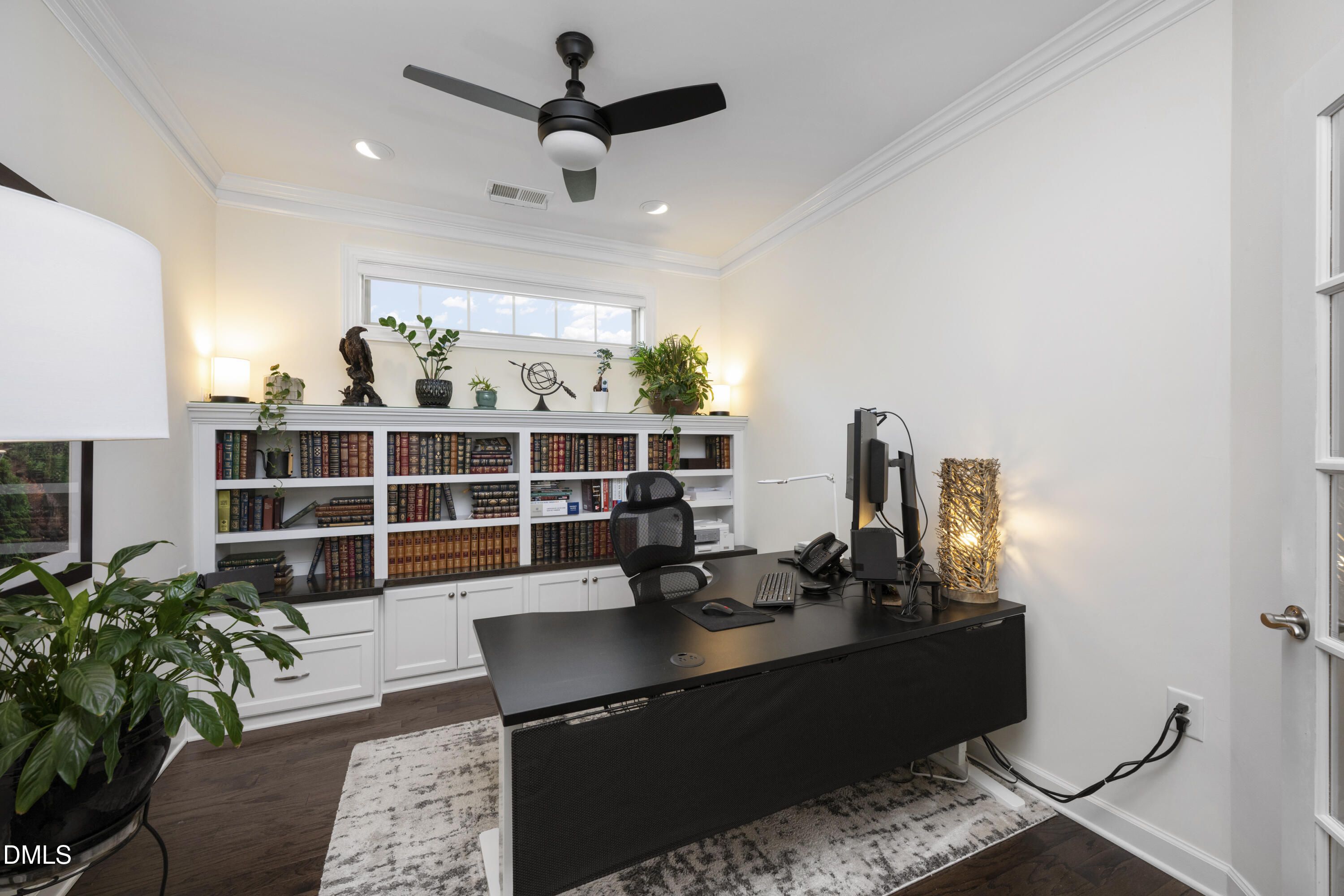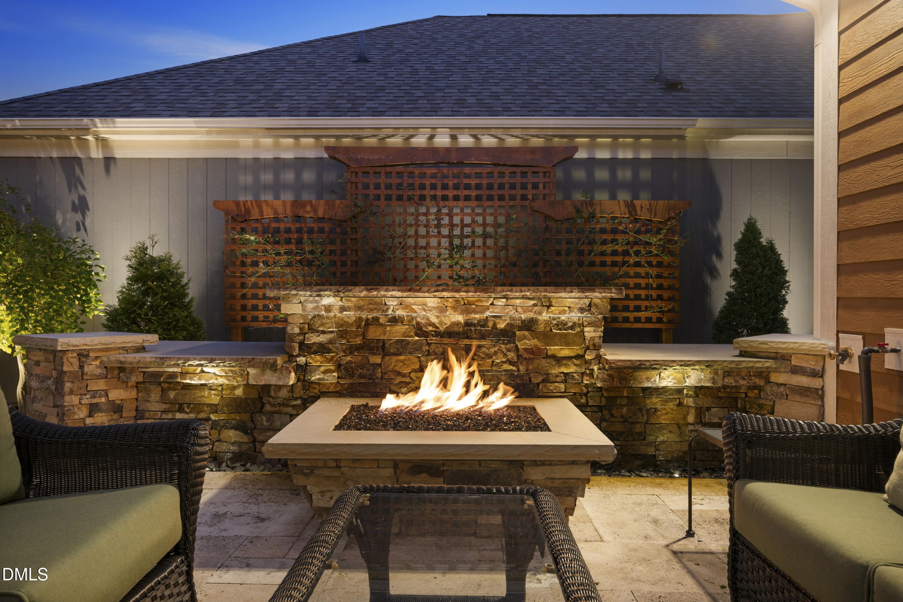 Stunning Ranch style home in The Courtyards at Heritage Grove! This exceptional property truly does not disappoint. The HOA makes this home very low maintenance! Step inside to find beautiful hardwood floors, elegant custom crown molding, and a welcoming foyer featuring new wallpaper and designer panel molding on the walls. The living room offers custom built-ins and a cozy gas fireplace, while the dining area features tray ceilings and a custom built-in bar perfect for entertaining. The kitchen is a chef's dream with custom soft-close cabinets and pull-out drawers, quartz countertops, stainless steel appliances, a gas cooktop, convection wall oven plus a second full wall oven, and a large island with a sleek stainless steel sink. The laundry room includes granite countertops and a built-in sink for added convenience. The spacious primary suite offers a spa-like retreat with a beautifully designed bathroom featuring double sinks and a large shower with a rain head and an additional wall-mounted shower head. The office features French doors, custom built-in shelving, and custom cabinets, and the main-level guest bedroom includes its own full bath with a shower/tub combo. Upstairs, you'll find an additional bedroom with a full bath and walk-in shower, plus a large bonus room with more custom built-ins. The garage includes a built-in mudroom area, adding extra functionality and organization. Outdoor living is just as impressive, with a custom waterfall feature, a fire pit, a hardscaped patio, and a beautifully landscaped backyard complete with a custom fence and flowering plants throughout. Shows like a model home- full of upgrades and thoughtful custom touches throughout! You do not want to miss this one!