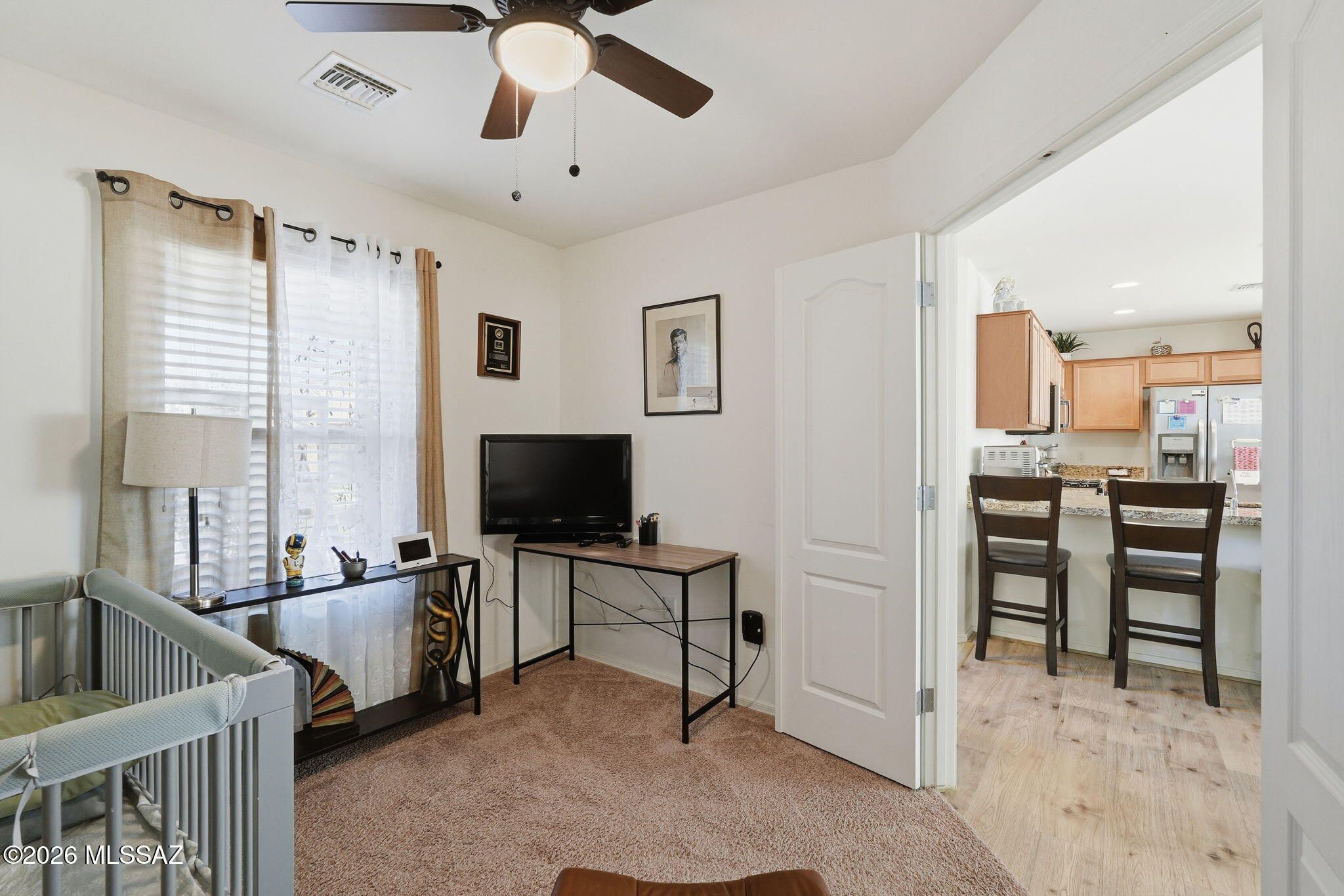 Welcome to effortless desert living in the highly active 55+ gated community of Rancho Resort. This beautifully maintained 2018 Southwestern home offers a bright & open great room layout designed for comfort, connection & easy everyday living. This thoughtful design creates a warm and inviting atmosphere from the moment you step inside. The kitchen serves as the heart of the home, gorgeous granite countertops, birch cabinetry & a pantry closet. It is ideal for preparing simple meals, hosting friends, or enjoying quiet evenings at home. Whether you are cooking for one or entertaining a group, this open concept floorplan supports it all with style & functionality.The versatile den, gives you the flexibility you need for a home office, craft room, fitness nook, or guest overflow. The