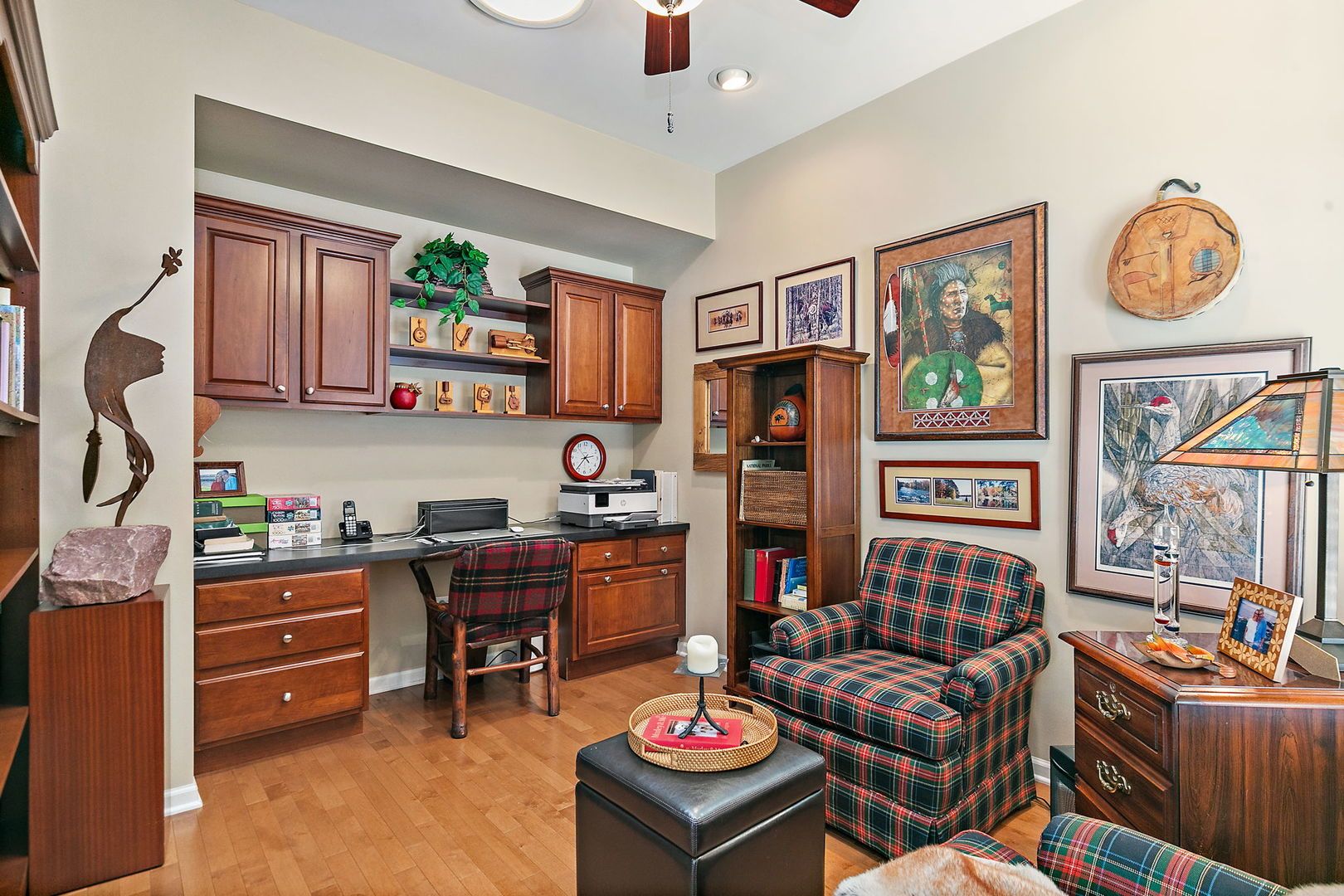 - Solar Tube(s), Bedroom on Main Level, Full Bathroom, Walk-In Closet(s), Bookcases, High Ceilings, Coffered Ceiling(s), Open Floorplan, Pantry, Quartz Counters, Den, Dual Sinks, Family/Dining Room