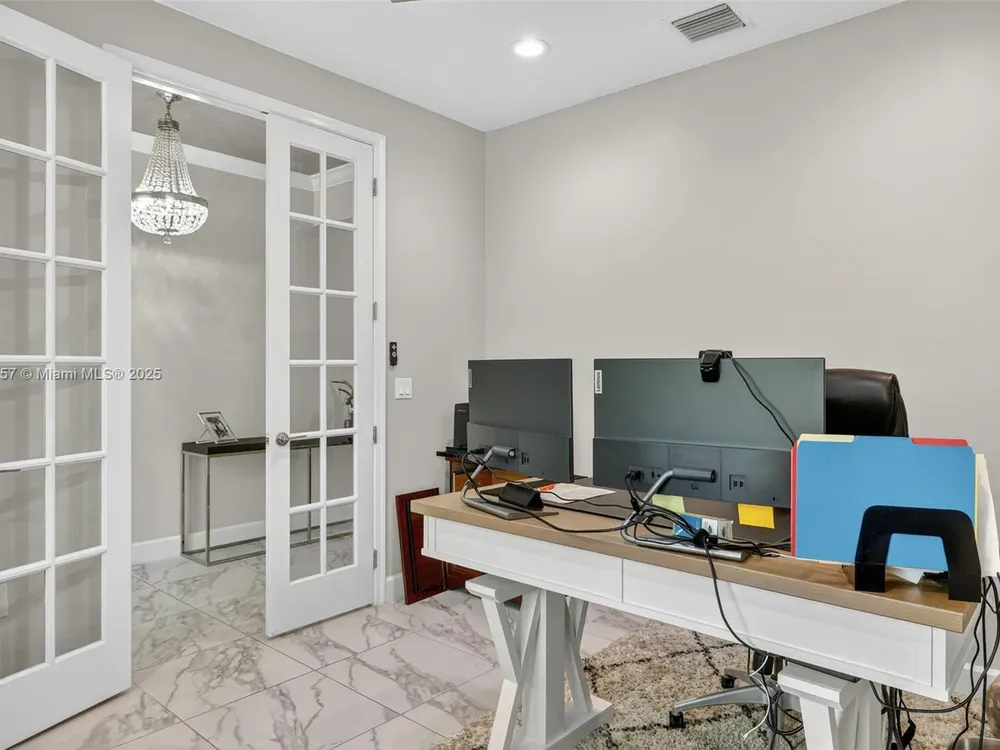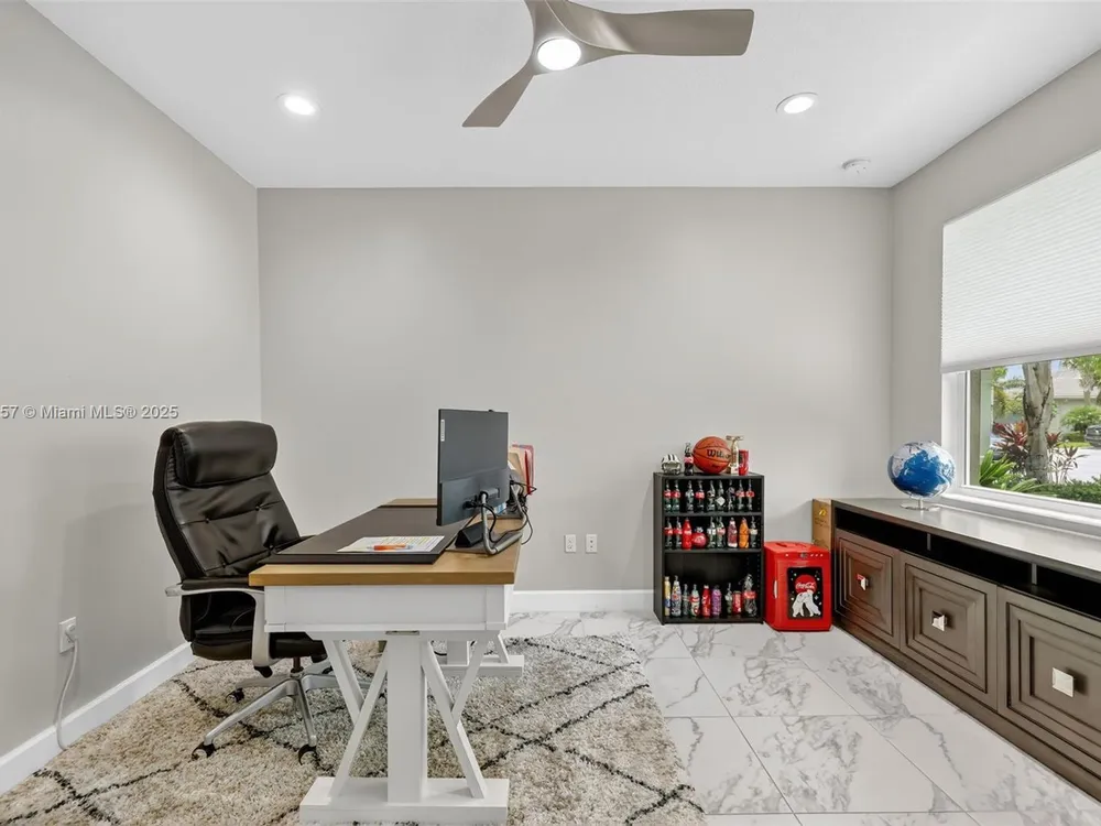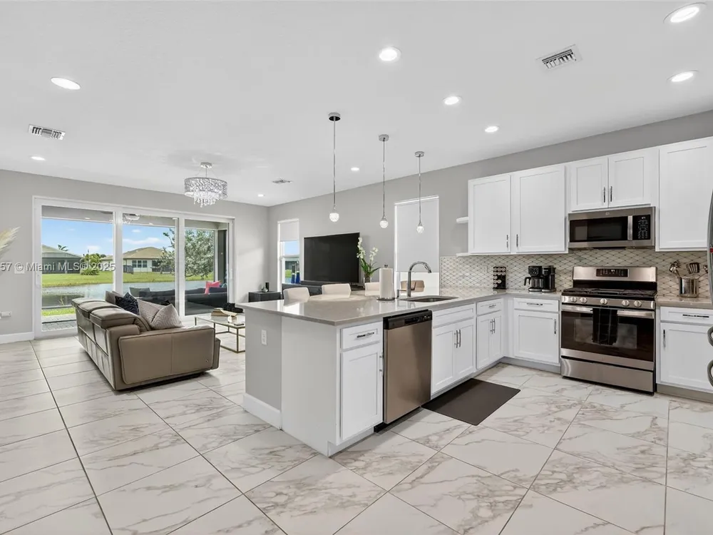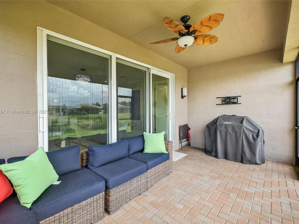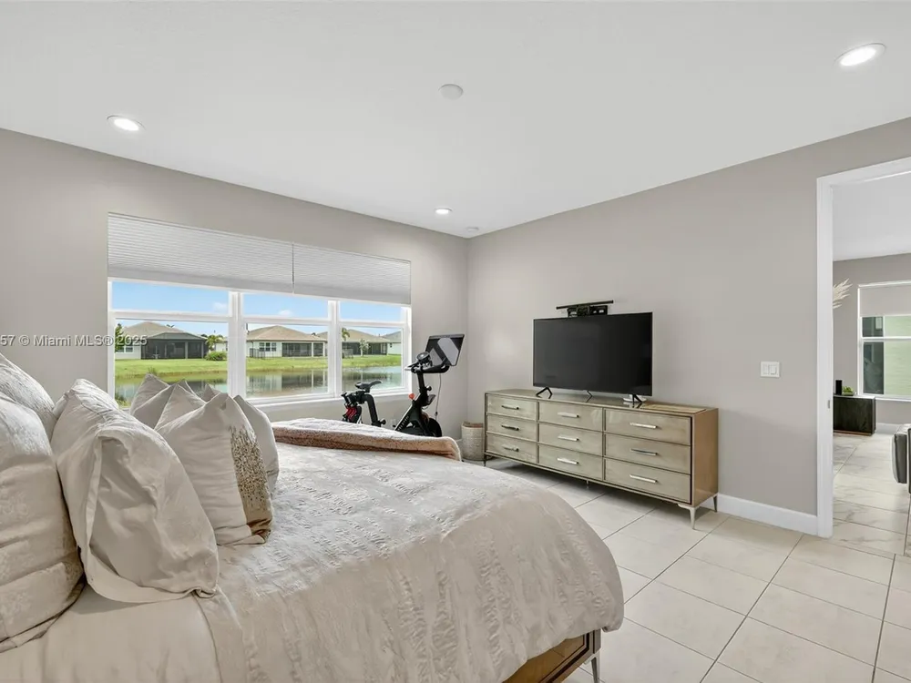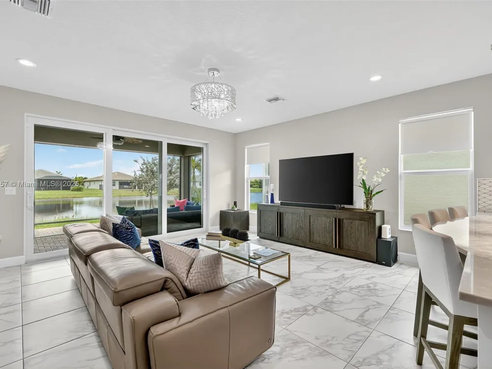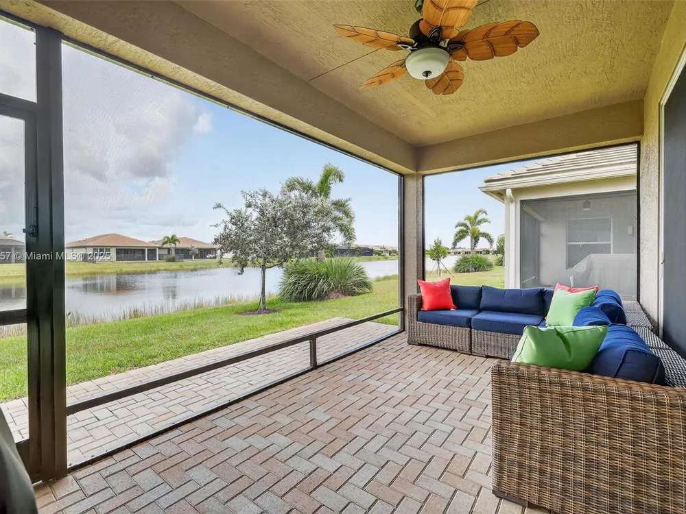 Stunning water view Marsala model filled with natural light! This home features crown molding, custom window treatments, designer wallpaper, and upgraded porcelain tile throughout- no carpet. The bright, white kitchen boasts a built-in pantry and upgraded finishes. Both bathrooms are beautifully enhanced, with decorator-inspired lighting and designer touches carried throughout the living spaces. French doors lead to the office, while large windows frame the serene water view, creating a bright, elegant, and inviting home. Added bonuses include a huge storage room and a versatile flex room. Come tour this gorgeous home and make it yours today! It is time to enjoy the Riverland Lifestyle!