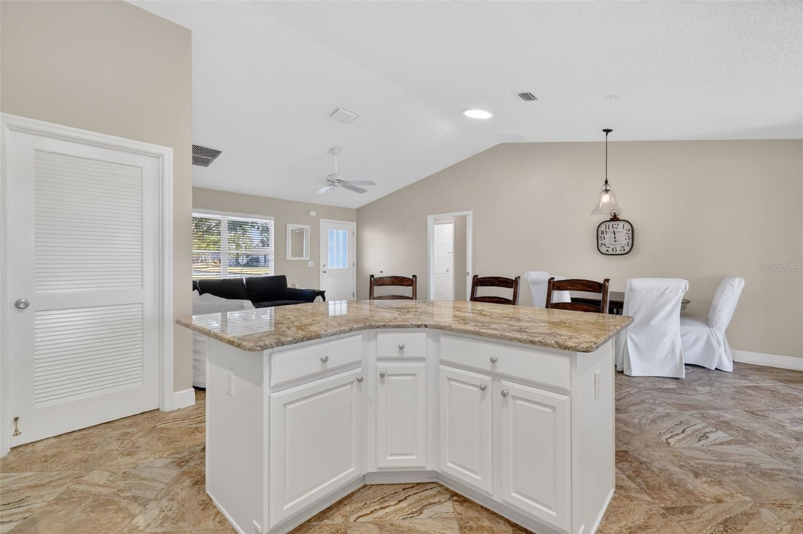 - Ceiling Fan(s), Eat-in Kitchen, High Ceilings, Living/Dining Room, Open Floorplan, Main Level Primary, Split Bedrooms, Stone Counters, Thermostat