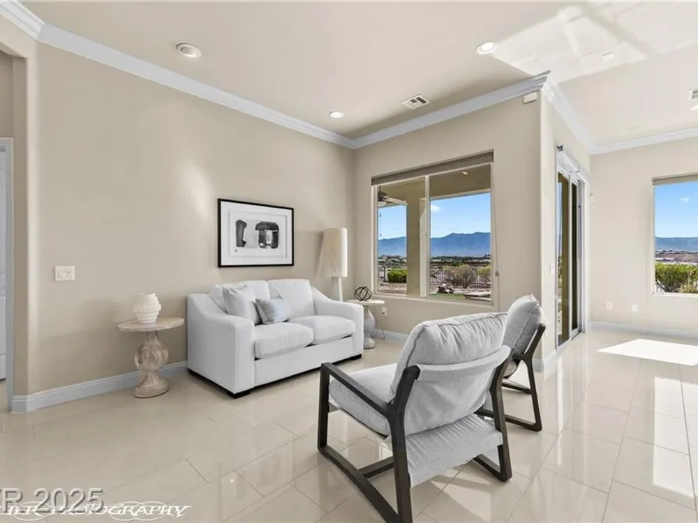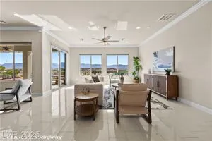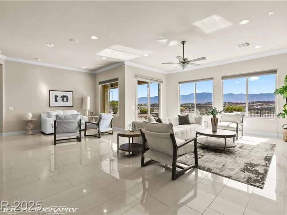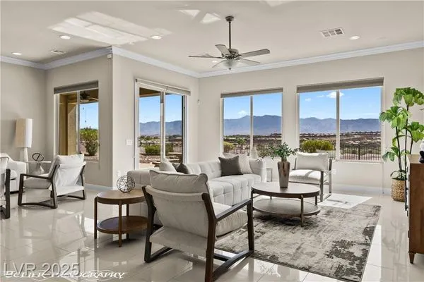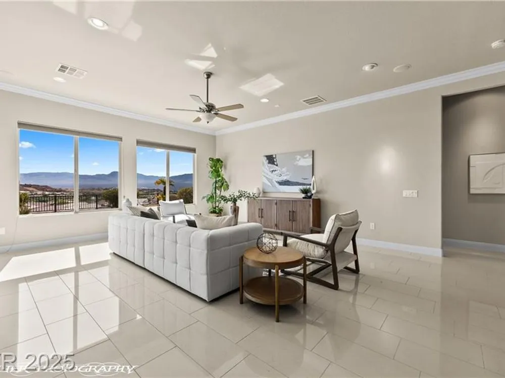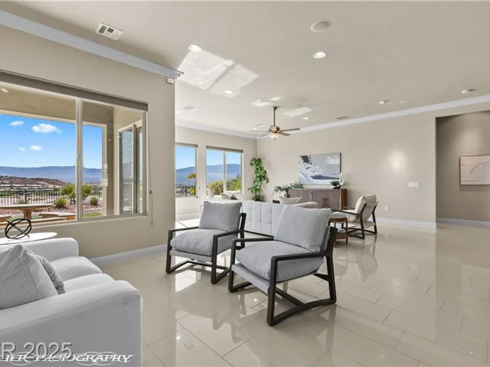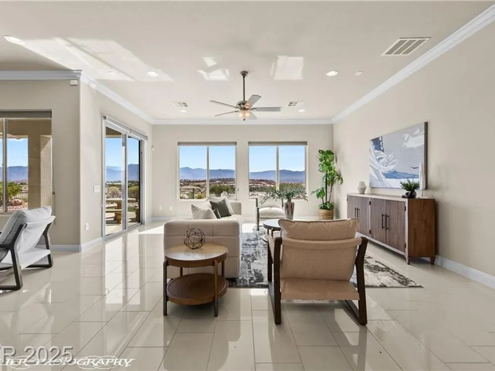 Welcome to 1348 Basin View, a stunning home in the prestigious Prominence subdivision of Sun City Mesquite. With over 2,400 sq ft of refined living space, this 3-bed, 2.5-bath residence blends elegance with modern comfort. The open floor plan features seamless porcelain tile, custom lighting, crown molding, and warm neutral tones for a sophisticated yet inviting feel. Set on a .25-acre elevated lot, enjoy breathtaking tri-state mountain views—an ideal backdrop for both relaxation and entertaining. Thoughtfully designed for luxurious, versatile living, every detail adds to the home's upscale appeal. Don’t miss your chance to experience exceptional desert living. Schedule your private tour today!