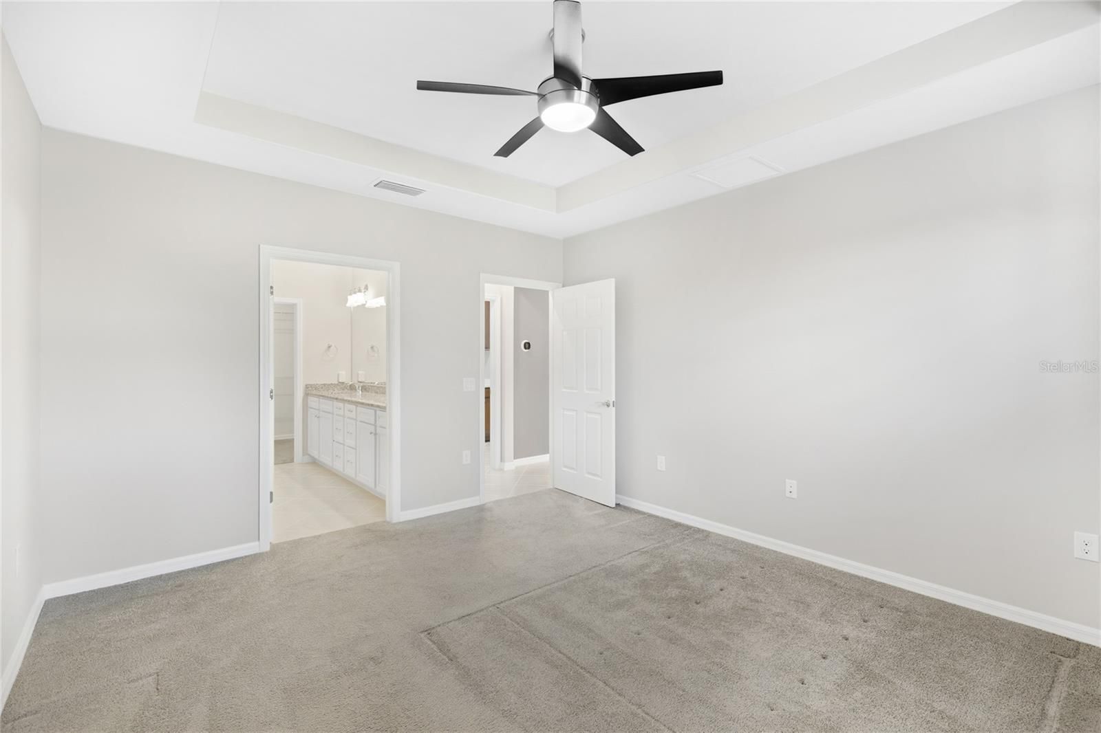 - Ceiling Fan(s), Eat-in Kitchen, High Ceilings, Kitchen/Family Room Combo, Open Floorplan, Split Bedrooms, Stone Counters, Thermostat, Tray Ceiling(s), Walk-In Closet(s), Window Treatments
