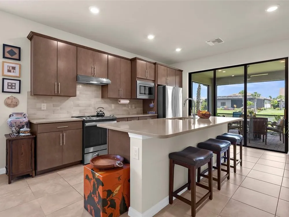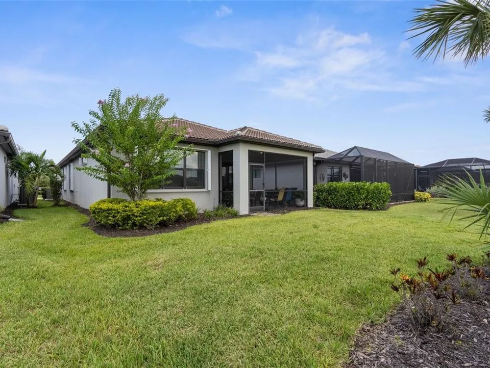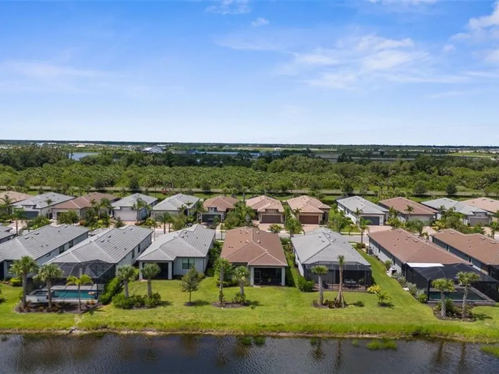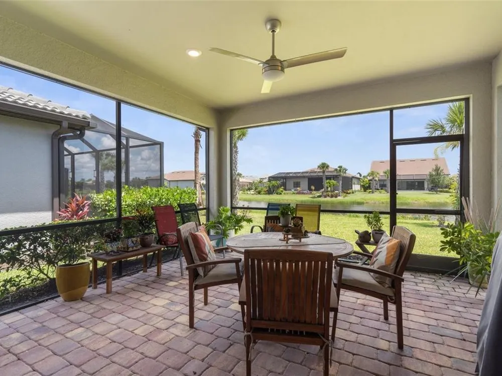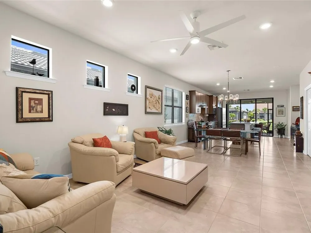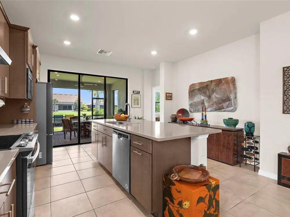 Furnishings have all been removed-easy to picture your own decor! WATER VIEW! Step into comfort and style in this beautifully designed 3-bedroom, 2-bath 1,575sf single family home with bright, open-concept living perfect for relaxing or entertaining. Move outdoors to your spacious covered lanai, positioned along one of IslandWalk’s scenic waterways—an ideal spot to savor breathtaking SUNRISES, dazzling SUNSETS, thrilling rocket launches, and festive fireworks, all from the comfort of home. This may be the only one in Islandwalk featuring the sleek clean lines of flat panel cabinetry, set apart with a modern flair. The Maple Latte soft neutral tones paired with QUARTZ COUNTERTOPS really give a chic look to the kitchen. What everyone loves about this home design is the kitchen! So much room for entertaining with that HUGE ISLAND as a focal point. Additional features include modern ceiling fans that draw the eye upward, accentuating the home's tall ceilings. With blinds on all windows, no need for the expense of purchasing window treatments. For ease of use, you will find hurricane accordion shutters on all windows and sliding door. Not found often - a WATER SOFTENER SYSTEM, gentle on clothes and appliances. FLEX ROOM with closet and french doors - ideal as a bedroom, office or den. You will have the luxury of extra space with a DEEPER GARAGE than found in most homes this size. Neutral tile flooring throughout with carpet in the primary and one guest bedroom(Seller offering credit for carpet condition in primary bedroom). Both bathrooms have coastal white cabinetry with the quartz countertop - same as kitchen. Islandwalk is renowned as one of VENICE'S largest and MOST DESIRED communities. With a full-time activity director, numerous events, clubs and activities, residents enjoy an active and social lifestyle. The community boasts 2 clubhouses, an event center, 2 resort-style pools, a lap pool, 12 pickleball courts, Har Tru tennis courts, dog park, playground, basketball court, miles of nature/biking trails. Venetian bridges and scenic water views complete this picturesque resort lifestyle. One of the great advantages of Islandwalk is that it doesn't require flood insurance and the entire community is maintenance-assisted. The Atlanta Braves Spring Training Stadium is just a short bike ride away, providing year-round events and activities for more than just sports enthusiasts. Another convenience is the completion of the new Downtown Wellen: Publix supermarket, restaurants, coffee places, shopping options, gas station and more! All of these amenities are just a short street-legal golf cart ride away. What are you waiting for? ENJOY the FLORIDA sunshine! Isn't it time to live the carefree lifestyle you’ve always dreamed of?