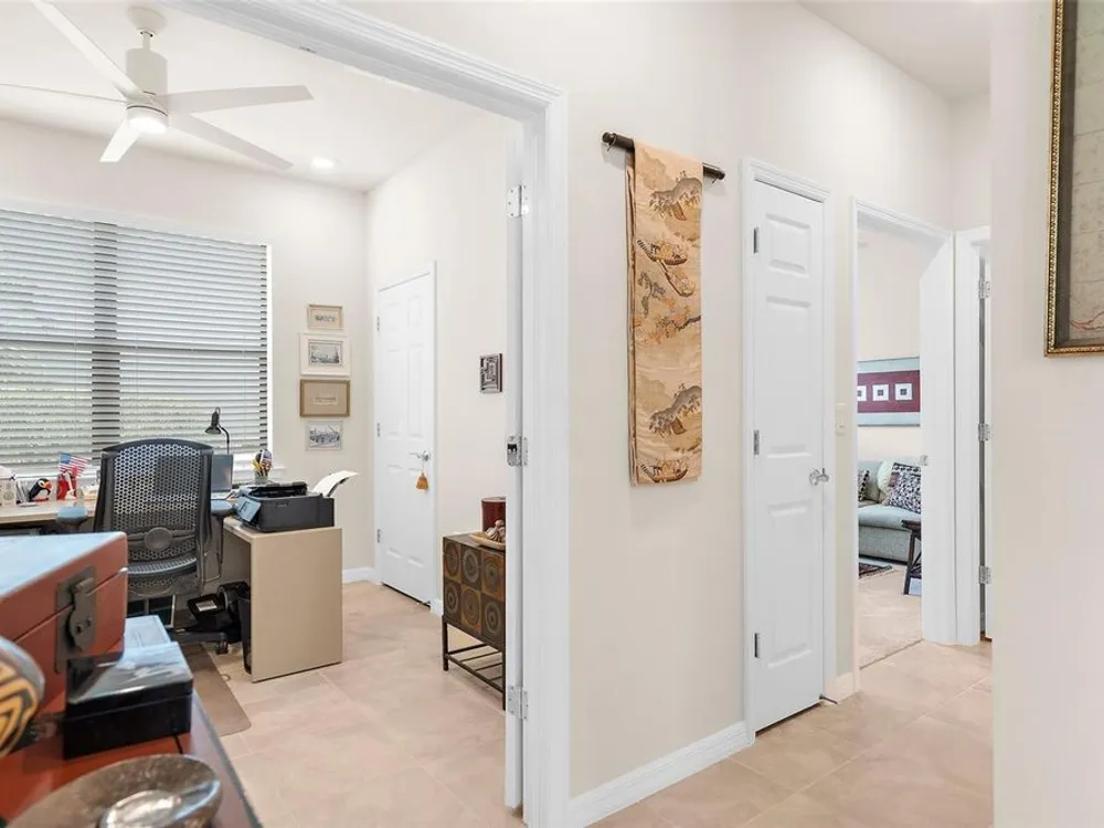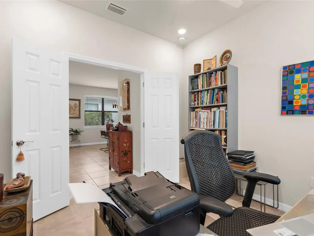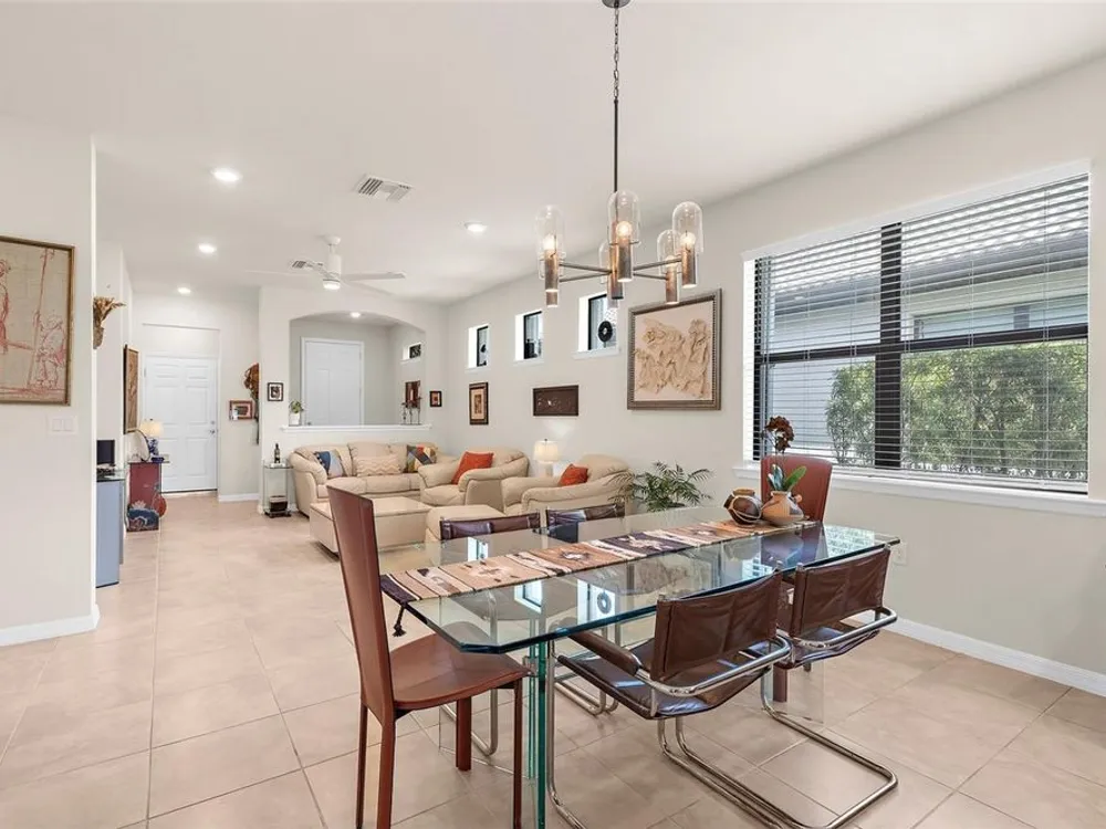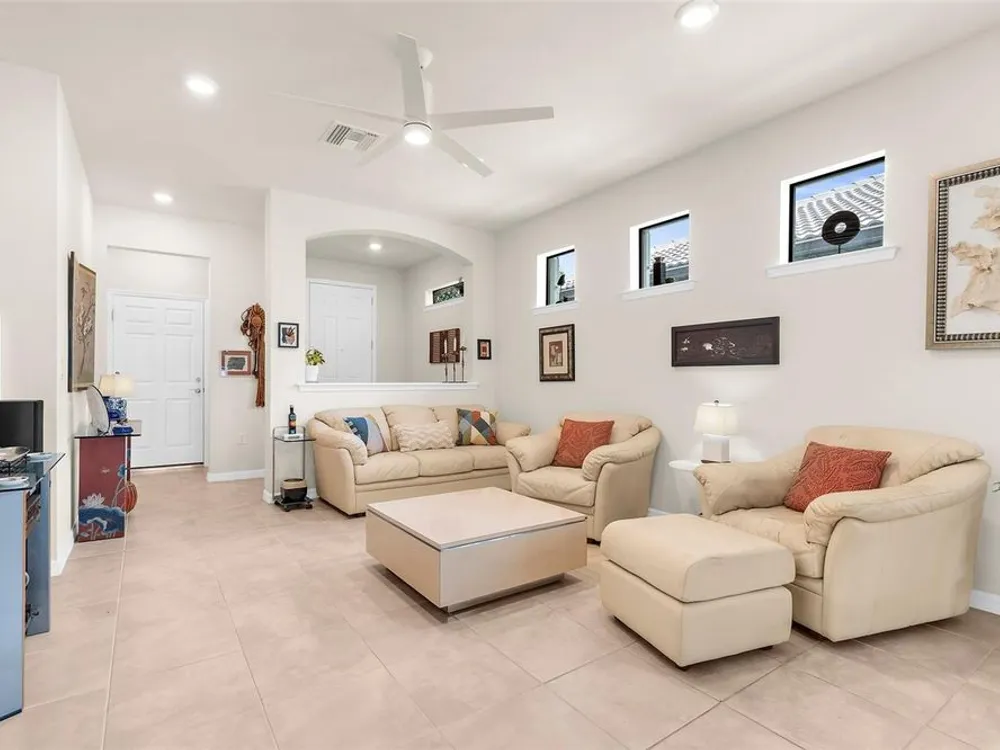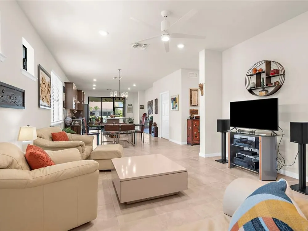 Furnishings have all been removed-easy to picture your own decor! WATER VIEW! Step into comfort and style in this beautifully designed 3-bedroom, 2-bath 1,575sf single family home with bright, open-concept living perfect for relaxing or entertaining. Move outdoors to your spacious covered lanai, positioned along one of IslandWalk’s scenic waterways—an ideal spot to savor breathtaking SUNRISES, dazzling SUNSETS, thrilling rocket launches, and festive fireworks, all from the comfort of home. This may be the only one in Islandwalk featuring the sleek clean lines of flat panel cabinetry, set apart with a modern flair. The Maple Latte soft neutral tones paired with QUARTZ COUNTERTOPS really give a chic look to the kitchen. What everyone loves about this home design is the kitchen! So much room for entertaining with that HUGE ISLAND as a focal point. Additional features include modern ceiling fans that draw the eye upward, accentuating the home's tall ceilings. With blinds on all windows, no need for the expense of purchasing window treatments. For ease of use, you will find hurricane accordion shutters on all windows and sliding door. Not found often - a WATER SOFTENER SYSTEM, gentle on clothes and appliances. FLEX ROOM with closet and french doors - ideal as a bedroom, office or den. You will have the luxury of extra space with a DEEPER GARAGE than found in most homes this size. Neutral tile flooring throughout with carpet in the primary and one guest bedroom(Seller offering credit for carpet condition in primary bedroom). Both bathrooms have coastal white cabinetry with the quartz countertop - same as kitchen. Islandwalk is renowned as one of VENICE'S largest and MOST DESIRED communities. With a full-time activity director, numerous events, clubs and activities, residents enjoy an active and social lifestyle. The community boasts 2 clubhouses, an event center, 2 resort-style pools, a lap pool, 12 pickleball courts, Har Tru tennis courts, dog park, playground, basketball court, miles of nature/biking trails. Venetian bridges and scenic water views complete this picturesque resort lifestyle. One of the great advantages of Islandwalk is that it doesn't require flood insurance and the entire community is maintenance-assisted. The Atlanta Braves Spring Training Stadium is just a short bike ride away, providing year-round events and activities for more than just sports enthusiasts. Another convenience is the completion of the new Downtown Wellen: Publix supermarket, restaurants, coffee places, shopping options, gas station and more! All of these amenities are just a short street-legal golf cart ride away. What are you waiting for? ENJOY the FLORIDA sunshine! Isn't it time to live the carefree lifestyle you’ve always dreamed of?