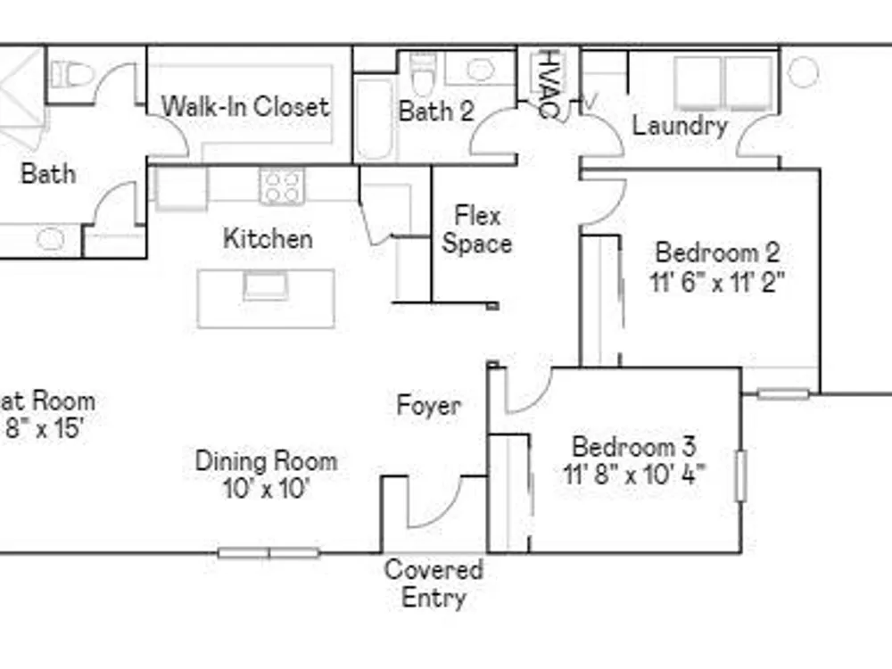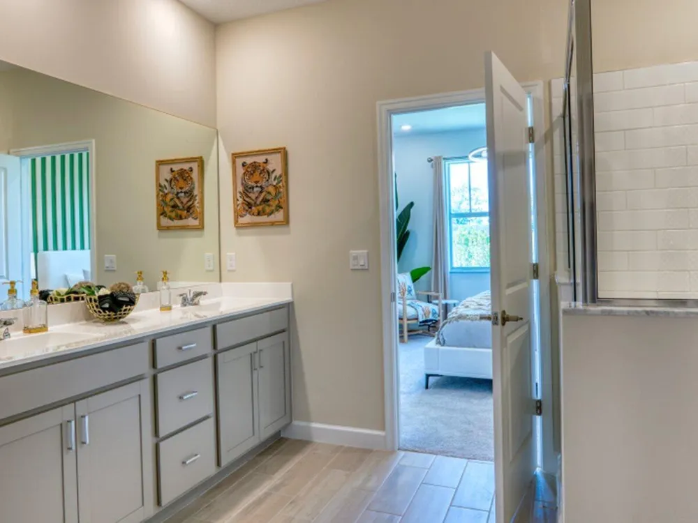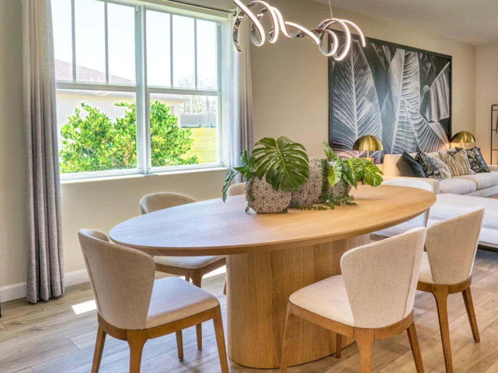 Exclusive to active adults 55+ and better, this new single-story twin home is a modern take on a classic design. Its open-plan layout connects the well-equipped kitchen, intimate dining room and Great Room together to prioritize ease of living. Glass sliders lead to an attached lanai. Nearby is the owner's suite with a full-sized bathroom and walk-in closet, while on the opposite side of the home are the remaining two bedrooms and a flex space. Prices, dimensions and features may vary and are subject to change. Photos are for illustrative purposes only.