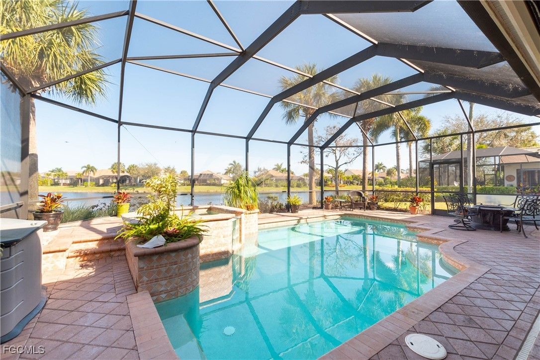 Significant price reduction on this well-maintained Arthur Rutenberg home featuring an attached 3-car garage, 3 bedrooms plus a den/study, and 2 full bathrooms. The spacious lanai offers a heated pool and hot tub, perfect for enjoying the Florida lifestyle. Notable upgrades include solar panels, a FULL HOUSE GENERATOR, newer HVAC system, newer hot water heater, and ELECTRIC HURRICANE SHUTTERS. Additional custom features include plantation shutters, wood flooring in all bedrooms, stainless steel appliances, and double tray ceilings. This elegant home boasts beautiful curb appeal with mature landscaping and tranquil freshwater lake views. Located in the highly desirable Verandah community, residents enjoy two 18-hole championship golf courses, tennis courts, a state-of-the-art fitness center, community pool, pickleball and bocce courts, and a dog park. Outdoor enthusiasts will love kayaking on the Orange River and exploring 9+ miles of walking and biking trails. Conveniently located near Downtown Fort Myers, the Caloosahatchee River, and Fort Myers and Punta Gorda airports. Exceptional value—prices like this are rare
