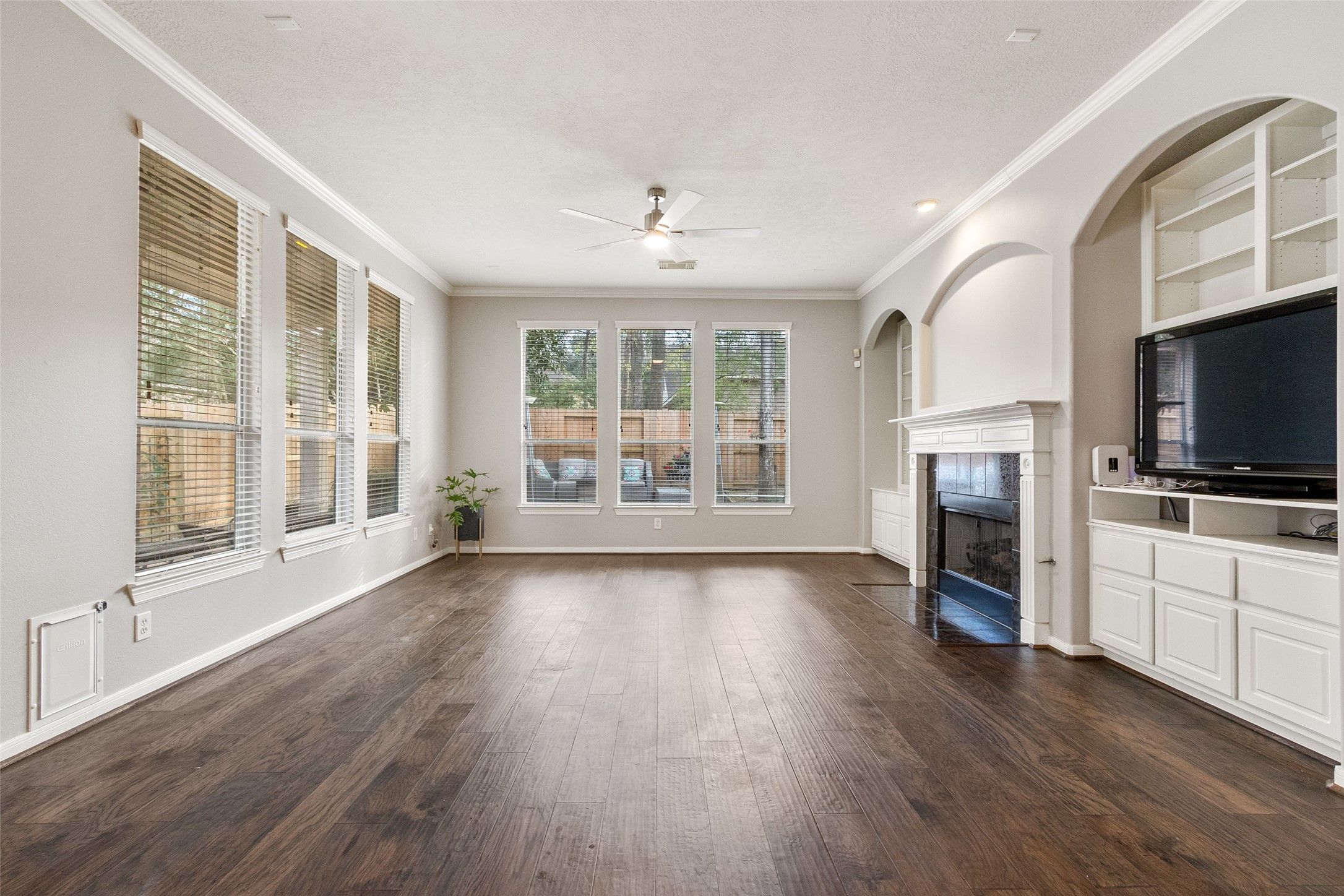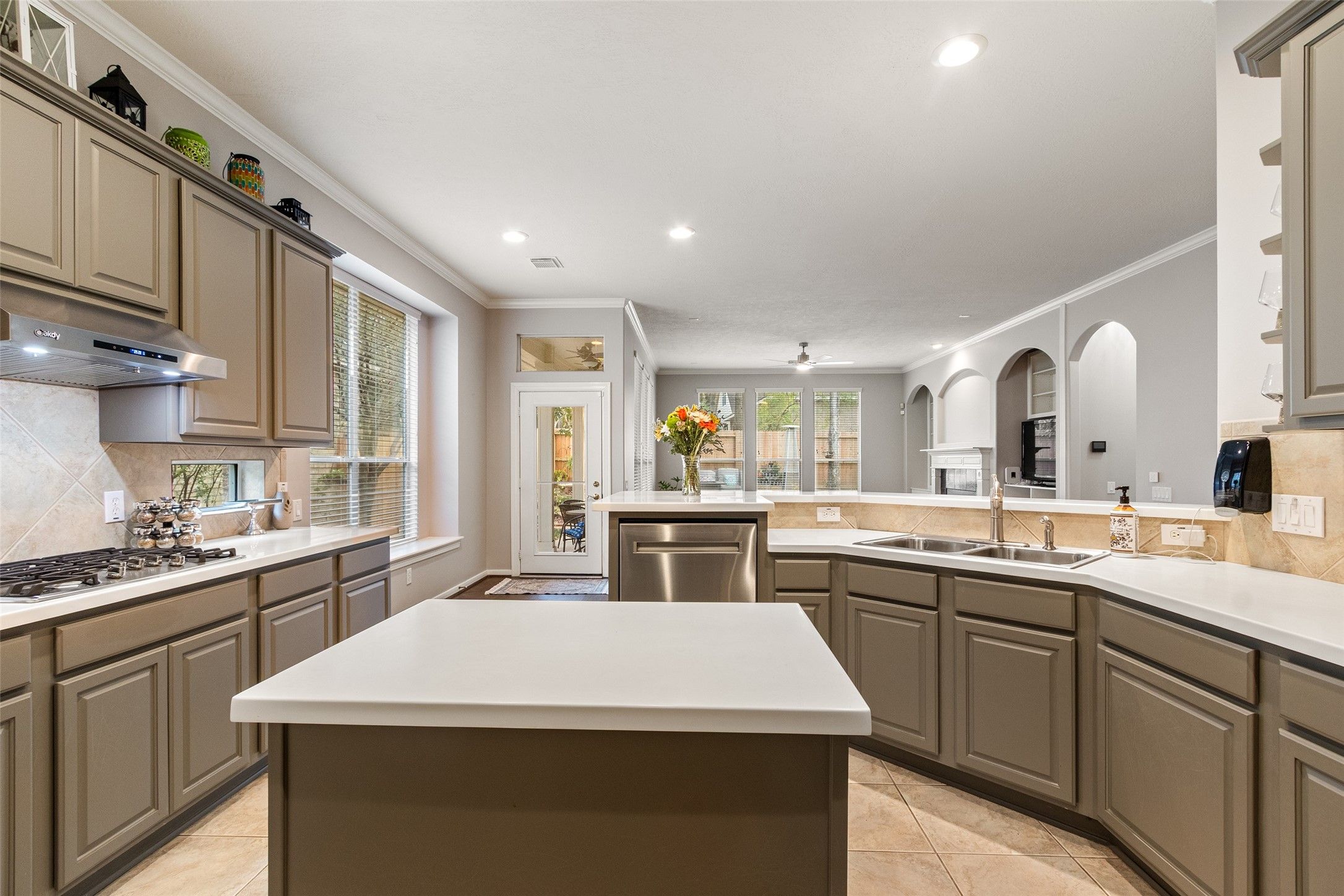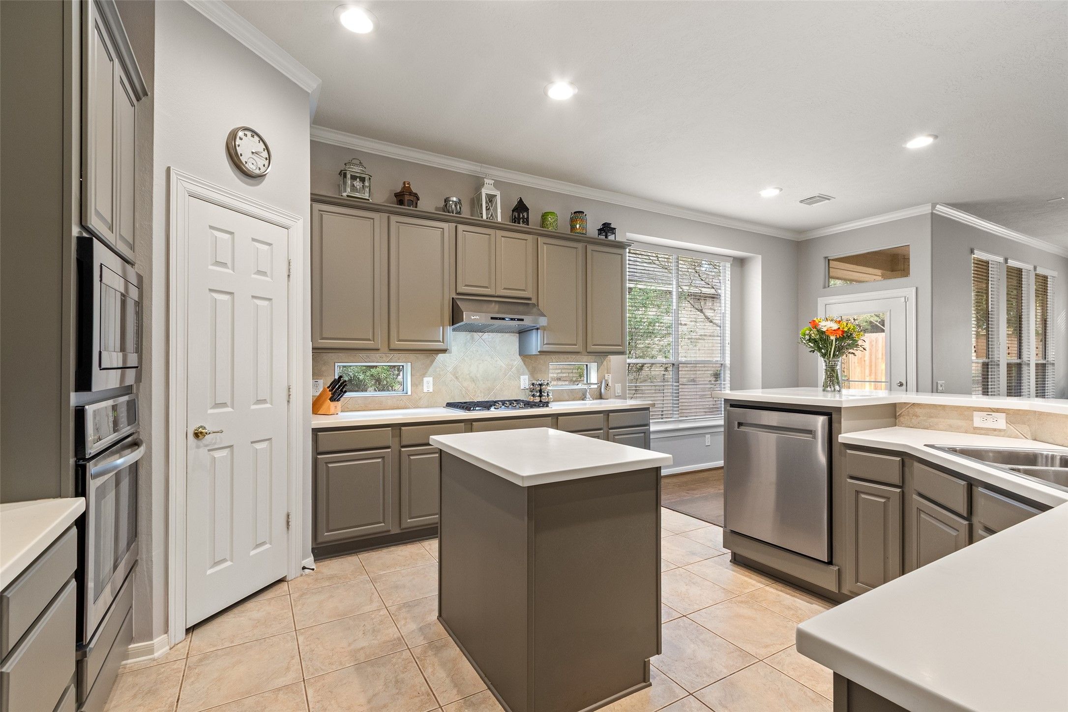 - Crown Molding, Double Vanity, Entrance Foyer, High Ceilings, Jetted Tub, Kitchen Island, Kitchen/Family Room Combo, Solid Surface Counters, Separate Shower, Walk-In Pantry, Window Treatments, Ceiling Fan(s), Programmable Thermostat