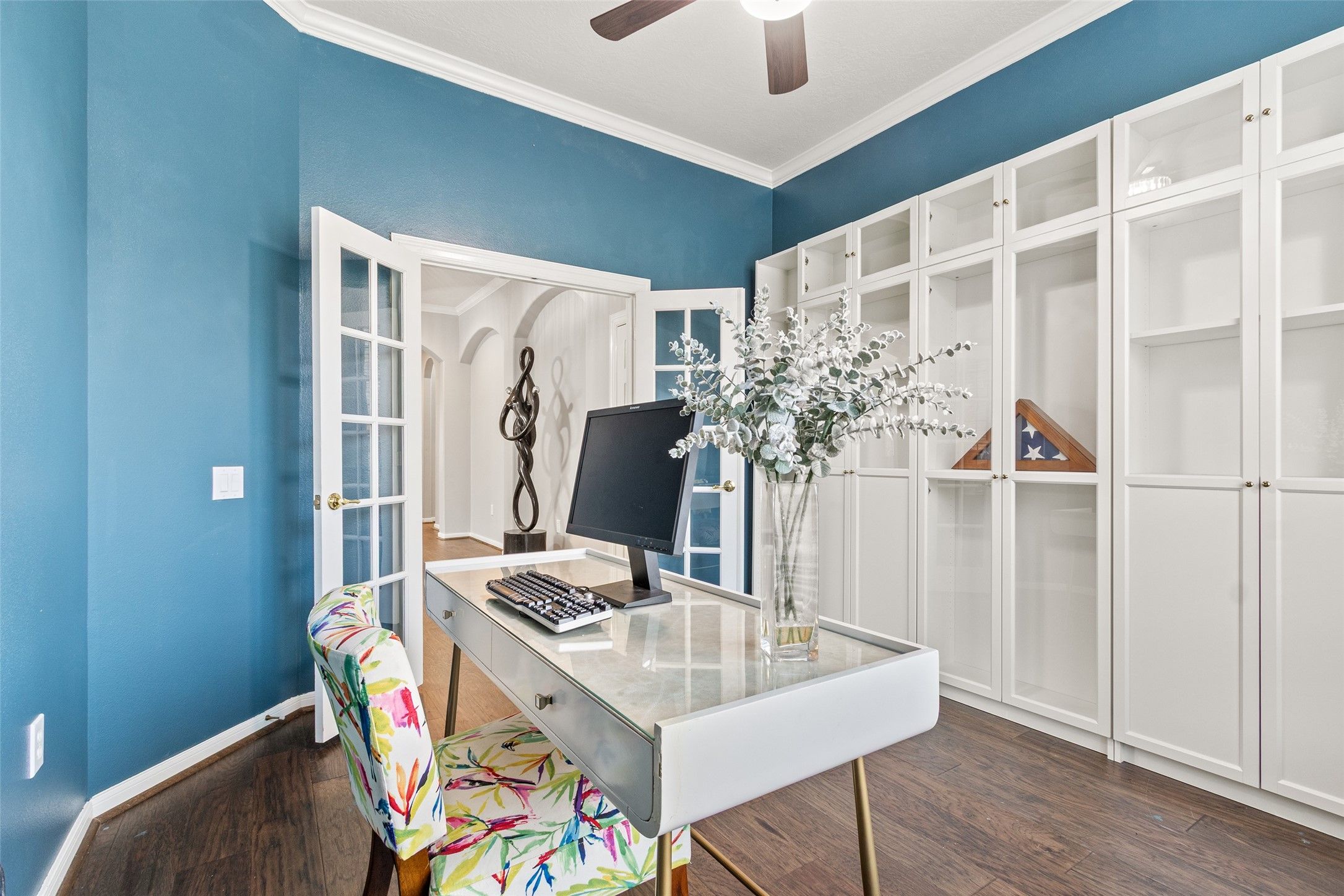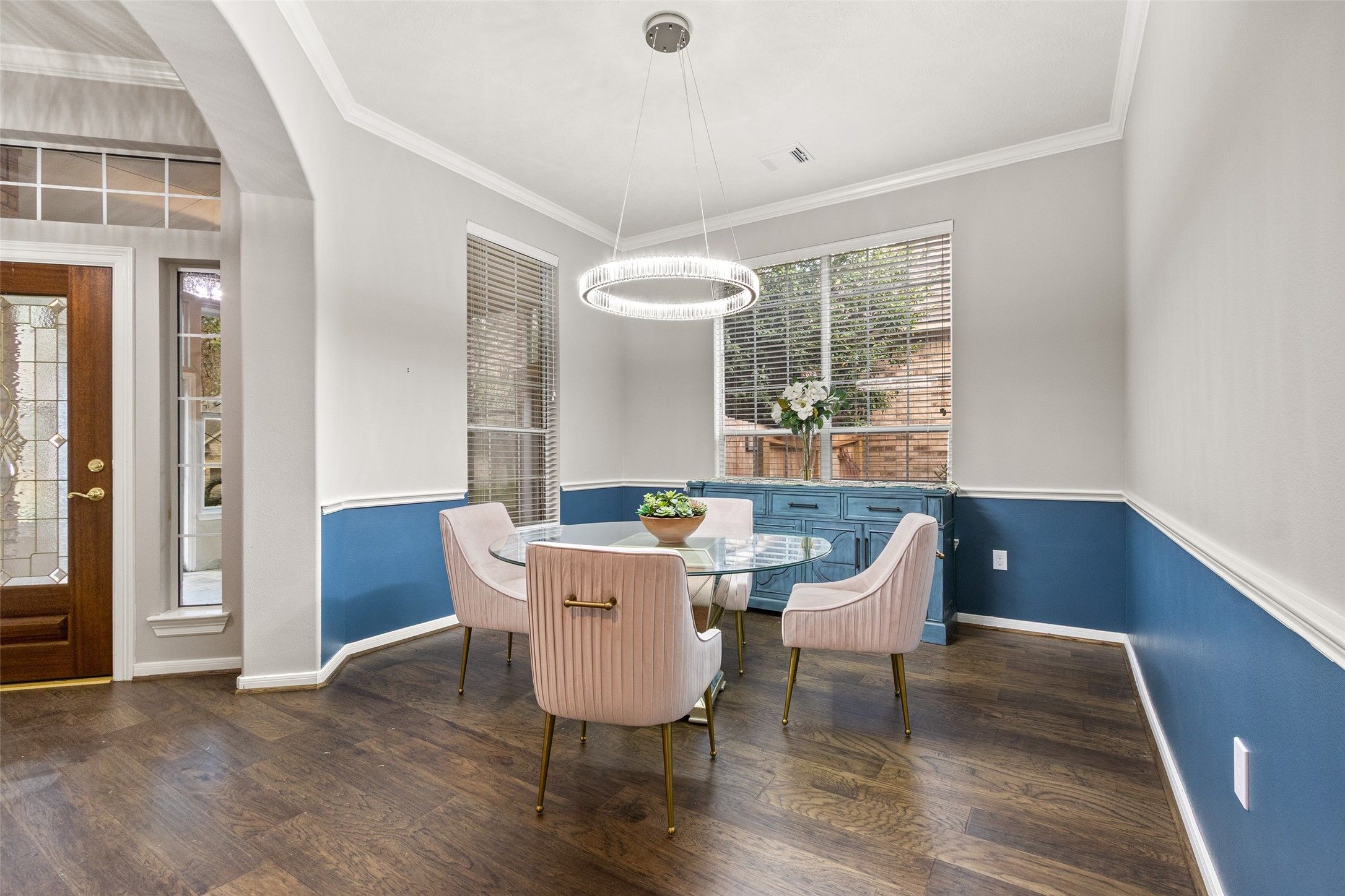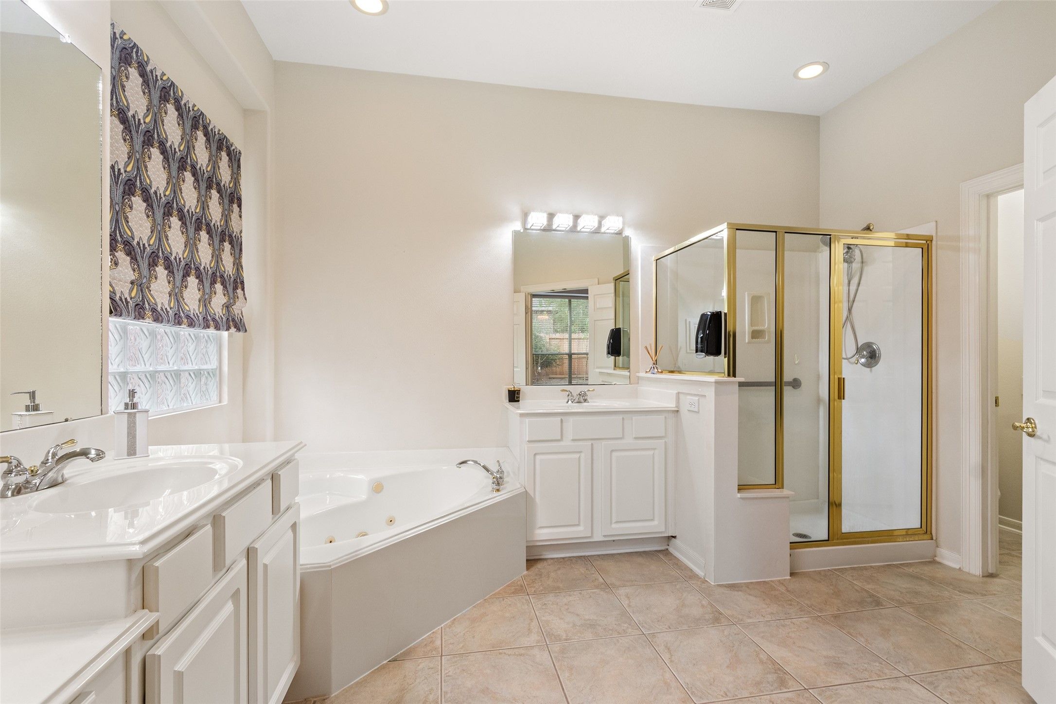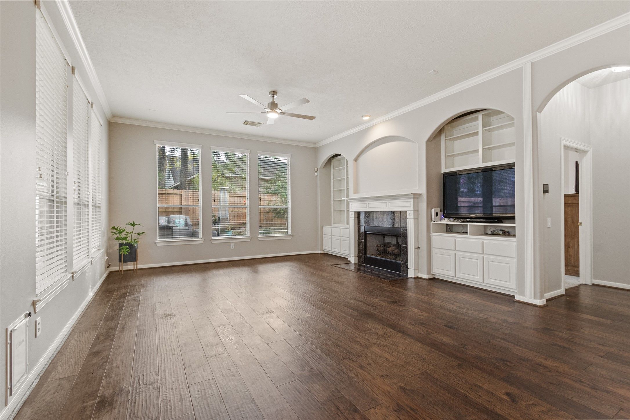 - Crown Molding, Double Vanity, Entrance Foyer, High Ceilings, Jetted Tub, Kitchen Island, Kitchen/Family Room Combo, Solid Surface Counters, Separate Shower, Walk-In Pantry, Window Treatments, Ceiling Fan(s), Programmable Thermostat