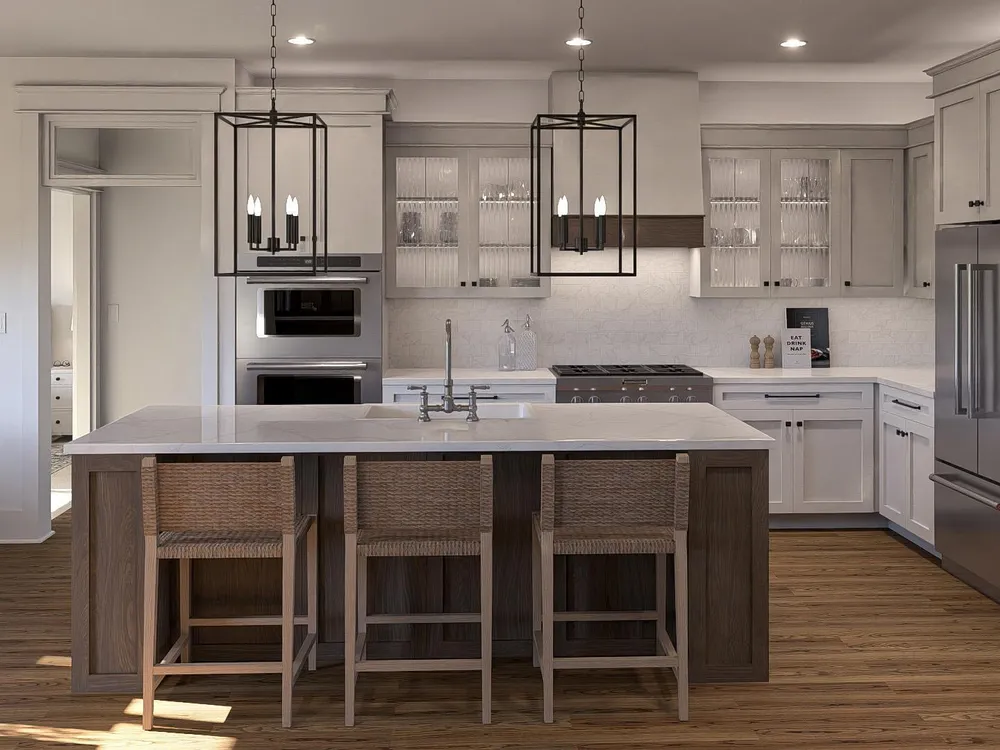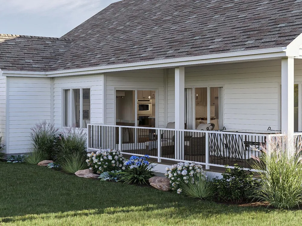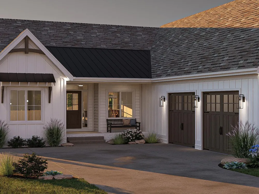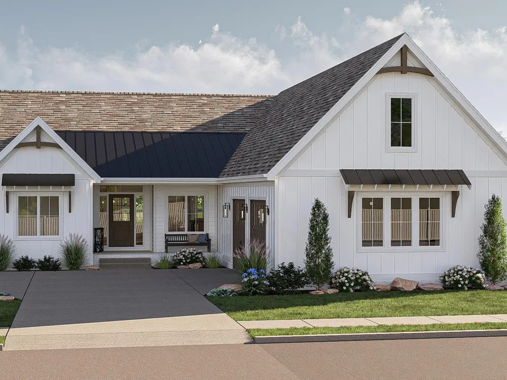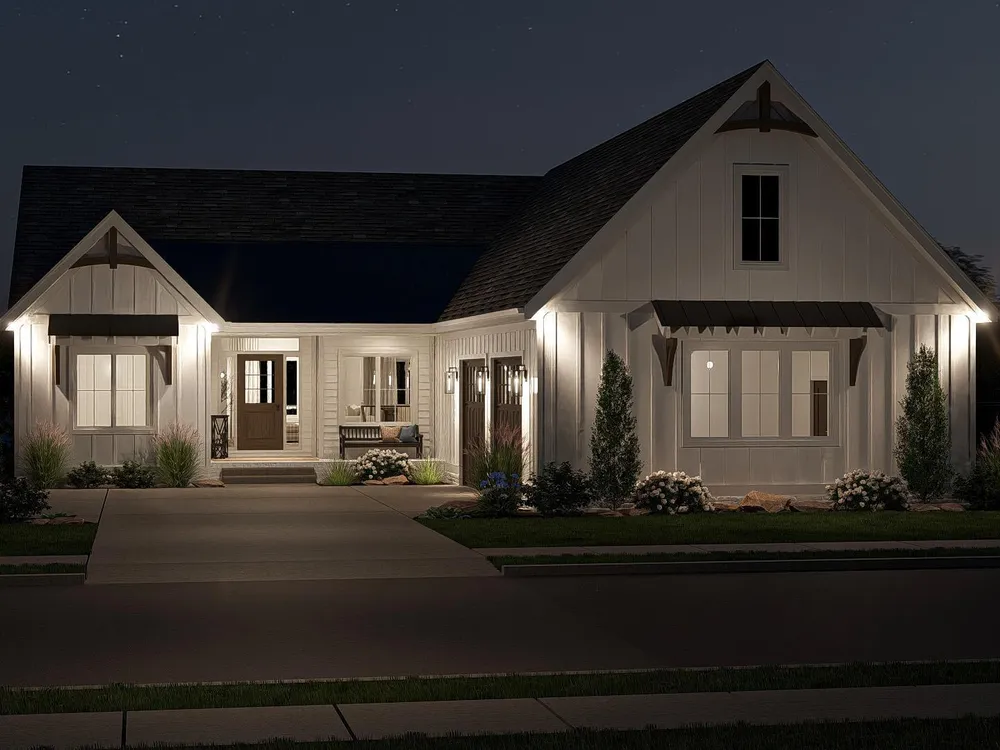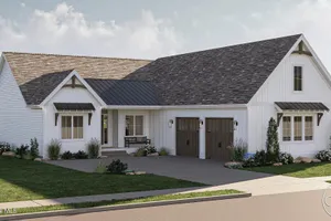 The Lakeland offers a beautiful modern farmhouse plan. The exterior features board & batten siding with a courtyard garage. At just over 1900 square feet, this plan is a great size for any family. Just inside the home, you'll walk into a large great room that is warmed by a fireplace with built-in bookshelves. The kitchen flows seamlessly with the great room & dining room in an open layout. The kitchen includes a walk-in pantry & a large island with built-in shelves. The primary suite includes his/her vanities, a walk-in shower & a large walk-in closet that accesses the laundry room. Bedrooms 2 & 3 share a centrally located hall bathroom. An optional finished room over the garage (FROG) adds 315 sq ft. Let's explore how this can be your new home!