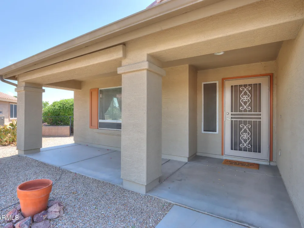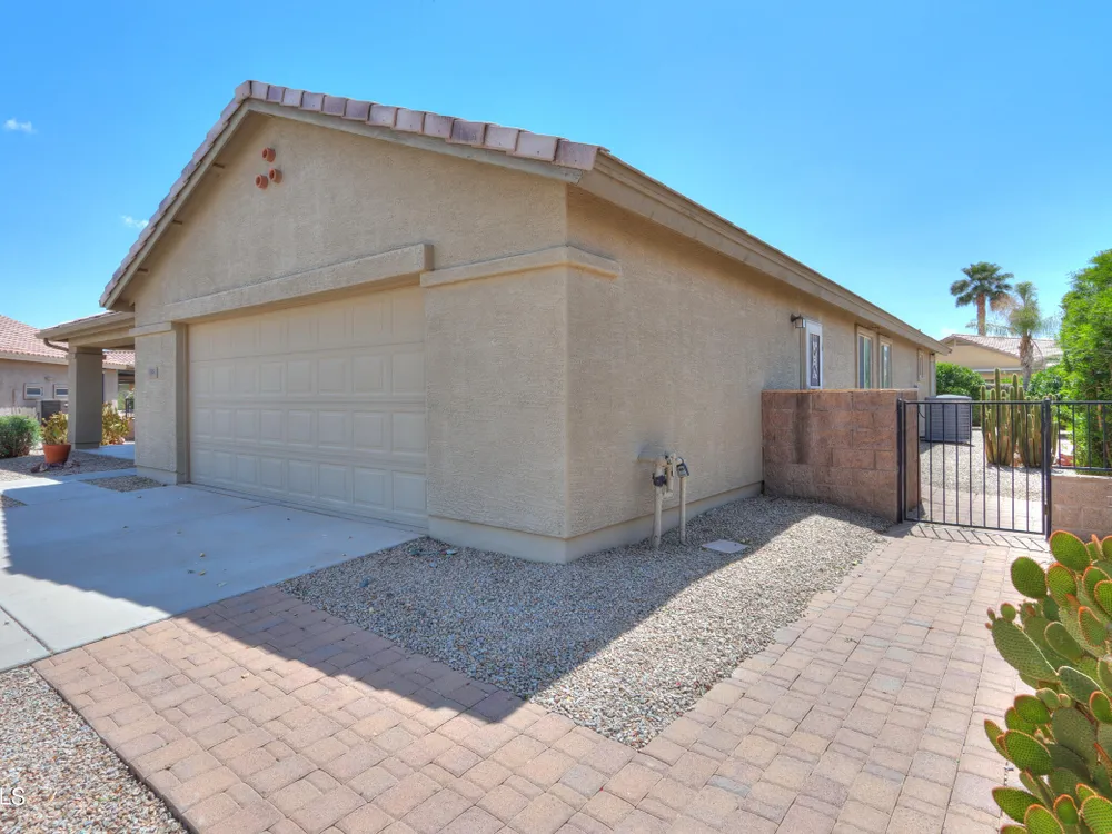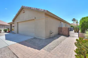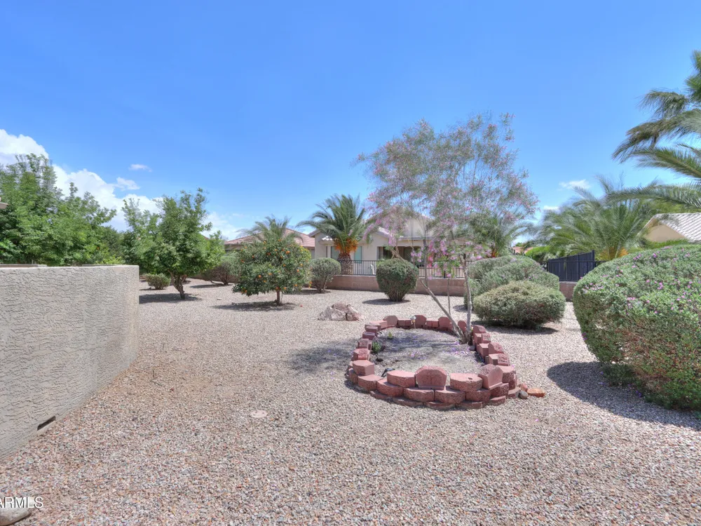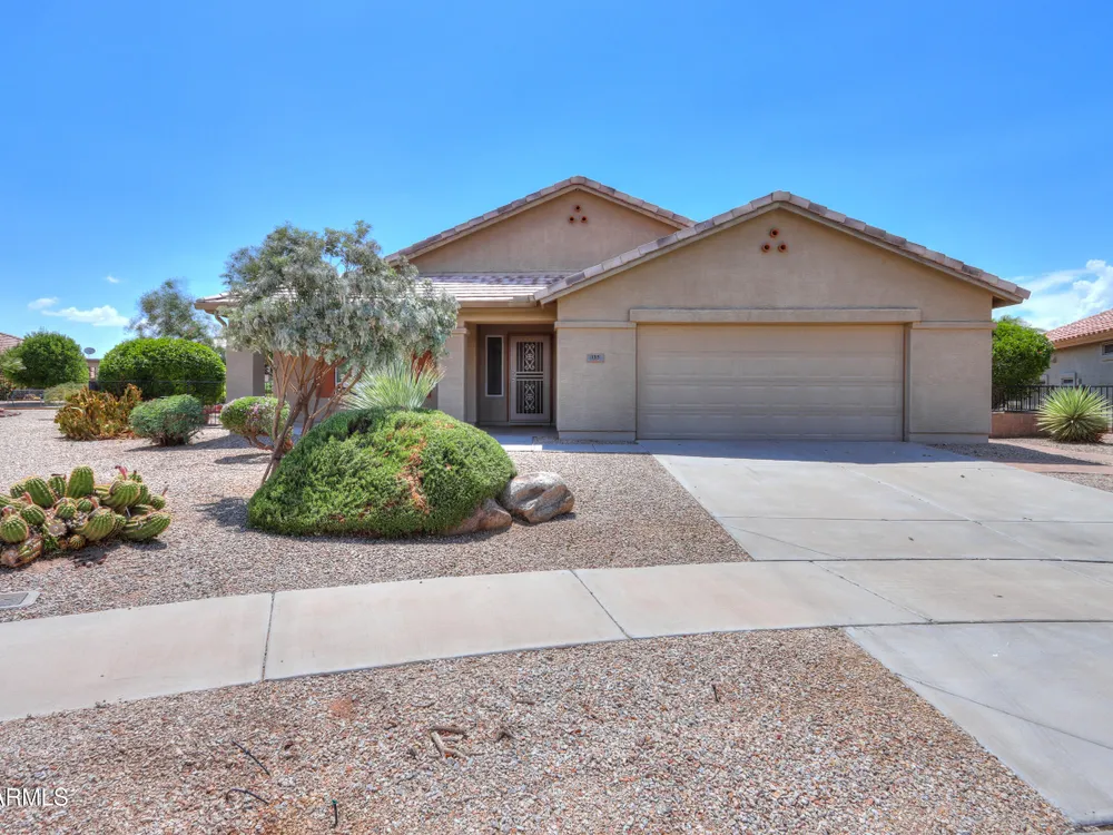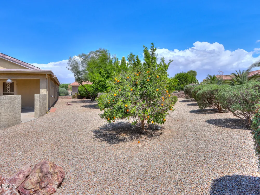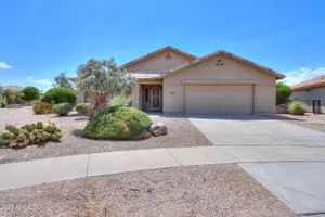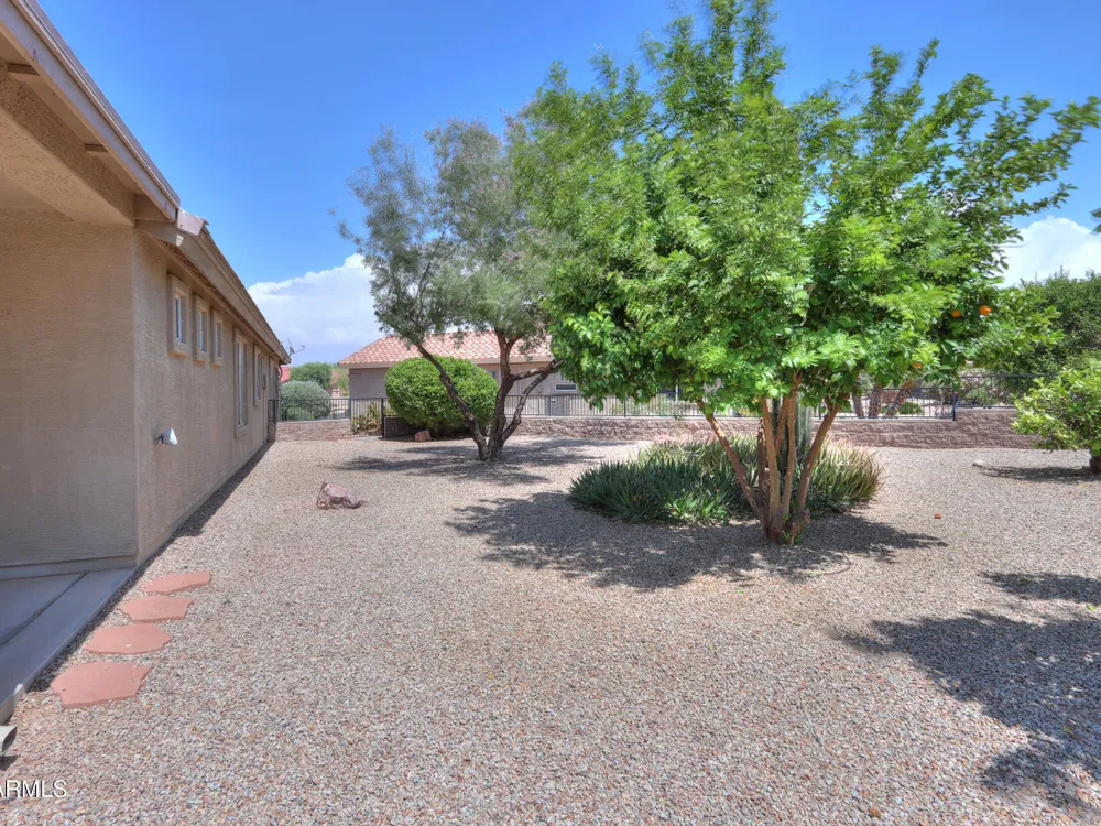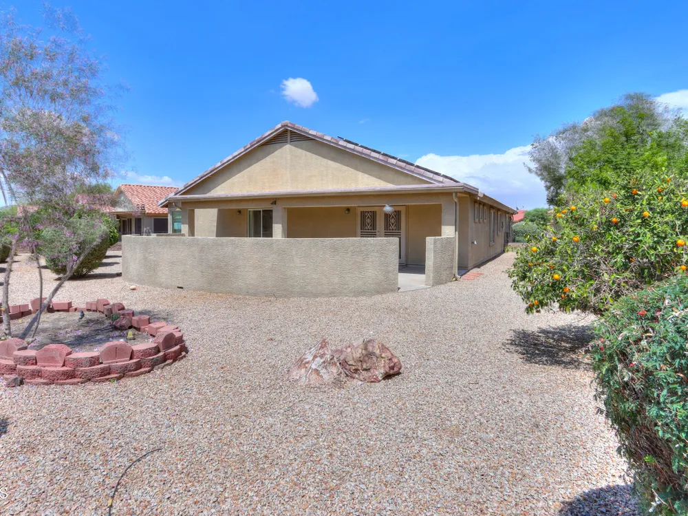 Welcome to your new home in the popular Mission Royale Active Adult Community! This spacious floorplan is one of the largest available with over 2200 sq feet, 3 BD, 2 BA, with an extra bonus room & both a living room & separate family room, giving you plenty of space to relax or entertain. You'll find upgraded tile flooring & ceiling fans throughout, while the kitchen is equipped with stainless steel appliances & reverse osmosis system. OWNED SOLAR PANELS. Security screen doors on the front & back offer added comfort and peace of mind. Situated on one of the largest lots offered in Mission Royale, the fenced in backyard is a showstopper with it's extended patio & mature landscaping including citrus trees! The primary suite is a comfortable retreat with it's separate bath and shower. garden tub, separate shower, spacious walk in closet & private toilet room. You will love all the additional storage that comes with the built in cabinetry in the garage which has a separate private entrance as well as the whole home water softener. Mission Royale offers resort-style living with a 15,000 sq ft clubhouse, fitness center, billiards room, library, and event spaces. Outdoor amenities include tennis, pickleball, bocce ball, two heated pools, a spa, and scenic walking/biking paths. Golfers will love the 18-hole course. Ideally located between Phoenix and Tucson, near shopping, dining, and healthcare, this vibrant 55+ community blends relaxation, recreation, and convenience.
