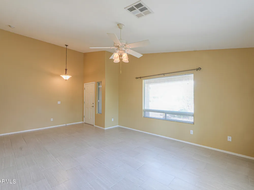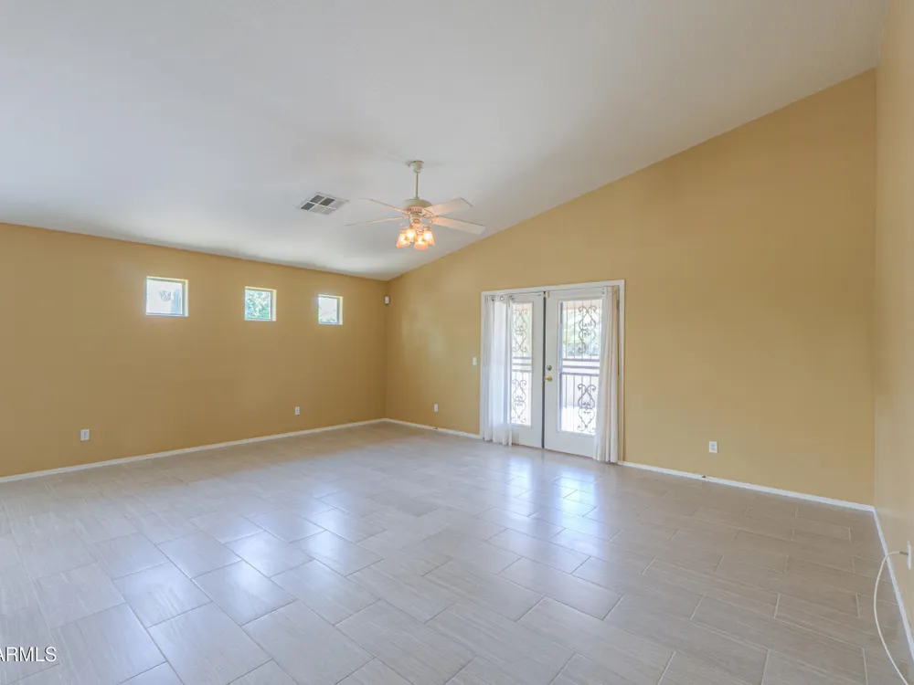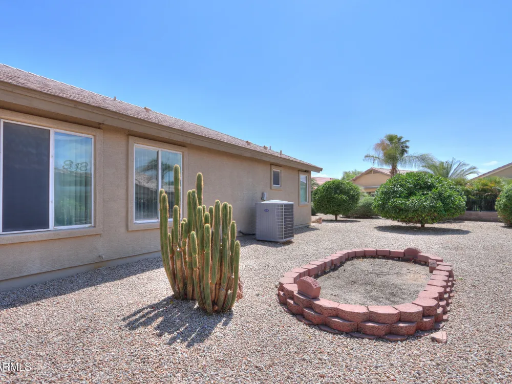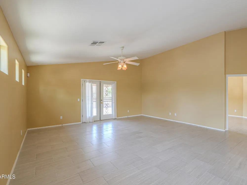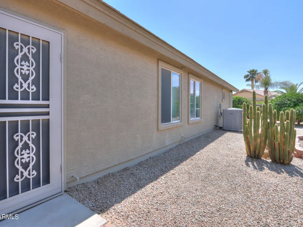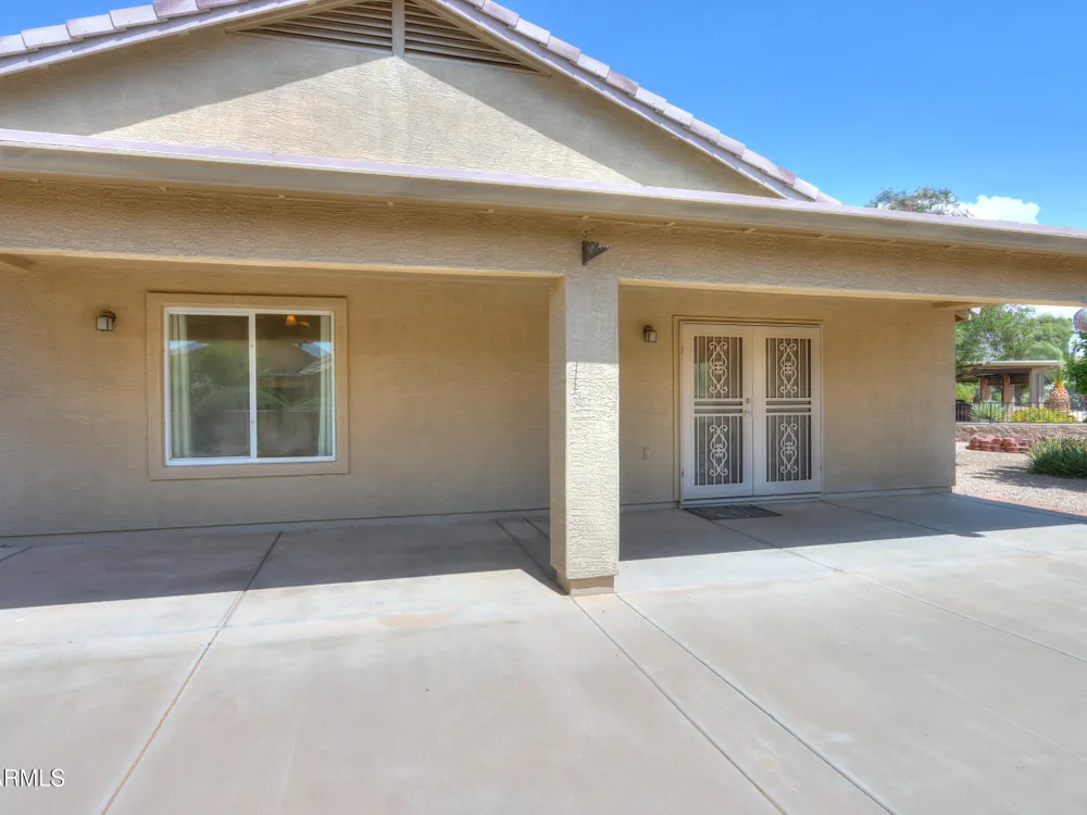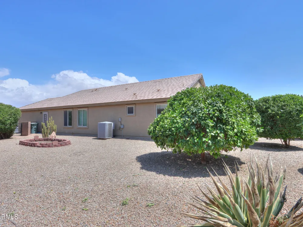Welcome to your new home in the popular Mission Royale Active Adult Community! This spacious floorplan is one of the largest available with over 2200 sq feet, 3 BD, 2 BA, with an extra bonus room & both a living room & separate family room, giving you plenty of space to relax or entertain. You'll find upgraded tile flooring & ceiling fans throughout, while the kitchen is equipped with stainless steel appliances & reverse osmosis system. OWNED SOLAR PANELS. Security screen doors on the front & back offer added comfort and peace of mind. Situated on one of the largest lots offered in Mission Royale, the fenced in backyard is a showstopper with it's extended patio & mature landscaping including citrus trees! The primary suite is a comfortable retreat with it's separate bath and shower. garden tub, separate shower, spacious walk in closet & private toilet room. You will love all the additional storage that comes with the built in cabinetry in the garage which has a separate private entrance as well as the whole home water softener. Mission Royale offers resort-style living with a 15,000 sq ft clubhouse, fitness center, billiards room, library, and event spaces. Outdoor amenities include tennis, pickleball, bocce ball, two heated pools, a spa, and scenic walking/biking paths. Golfers will love the 18-hole course. Ideally located between Phoenix and Tucson, near shopping, dining, and healthcare, this vibrant 55+ community blends relaxation, recreation, and convenience.