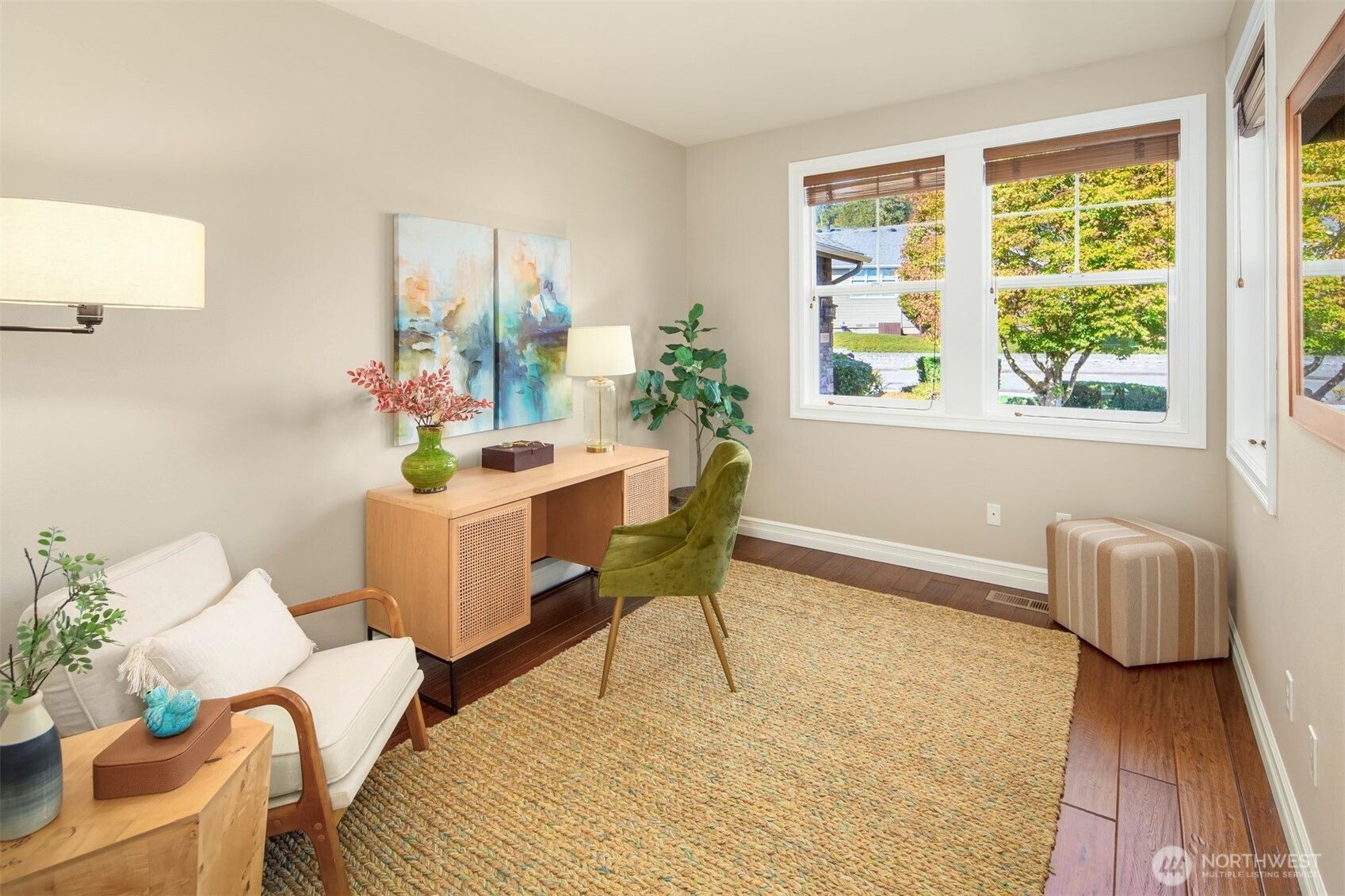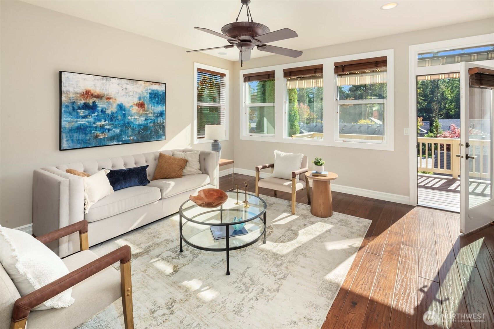 West-facing “Sammamish Plan” with tranquil forest outlook and abundant natural light. Open living, kitchen, and dining areas feature hardwood floors and open to a deck with electric awning for year-round enjoyment. Gourmet kitchen boasts GE Monogram appliances, slab granite counters, pantry, and ample storage. Primary suite includes dual vanities, walk-in closet, step-in shower, water closet, and linen storage. Flexible den/office near entry, guest bedroom, and full bath lead to a laundry with sink and cabinets plus a two-car garage with built-in storage. Air conditioning and pre-inspection complete the package. Age-restricted: one resident must be 55+.