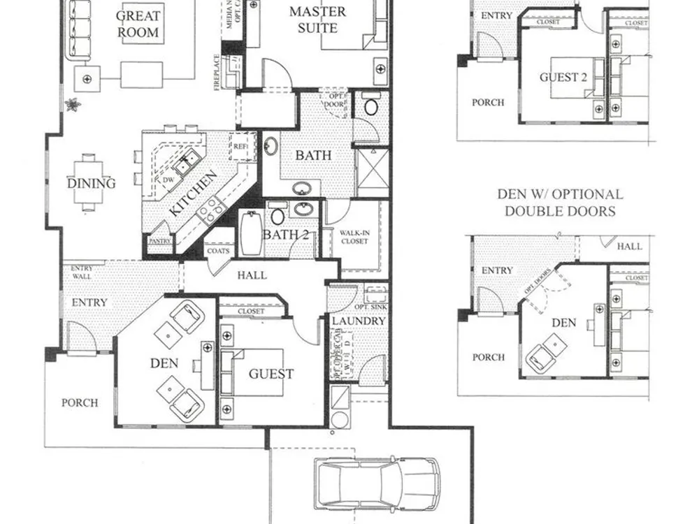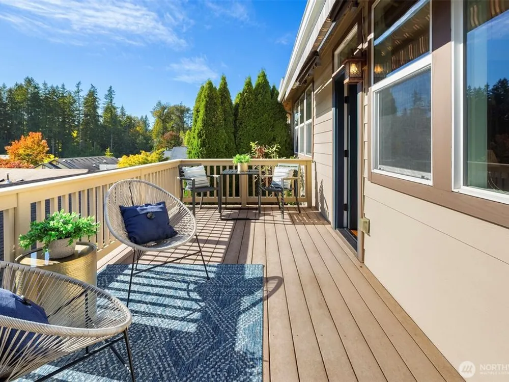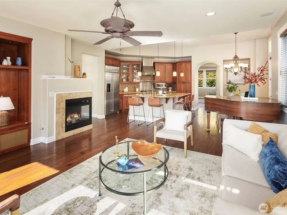West-facing “Sammamish Plan” with tranquil forest outlook and abundant natural light. Open living, kitchen, and dining areas feature hardwood floors and open to a deck with electric awning for year-round enjoyment. Gourmet kitchen boasts GE Monogram appliances, slab granite counters, pantry, and ample storage. Primary suite includes dual vanities, walk-in closet, step-in shower, water closet, and linen storage. Flexible den/office near entry, guest bedroom, and full bath lead to a laundry with sink and cabinets plus a two-car garage with built-in storage. Air conditioning and pre-inspection complete the package. Age-restricted: one resident must be 53+.