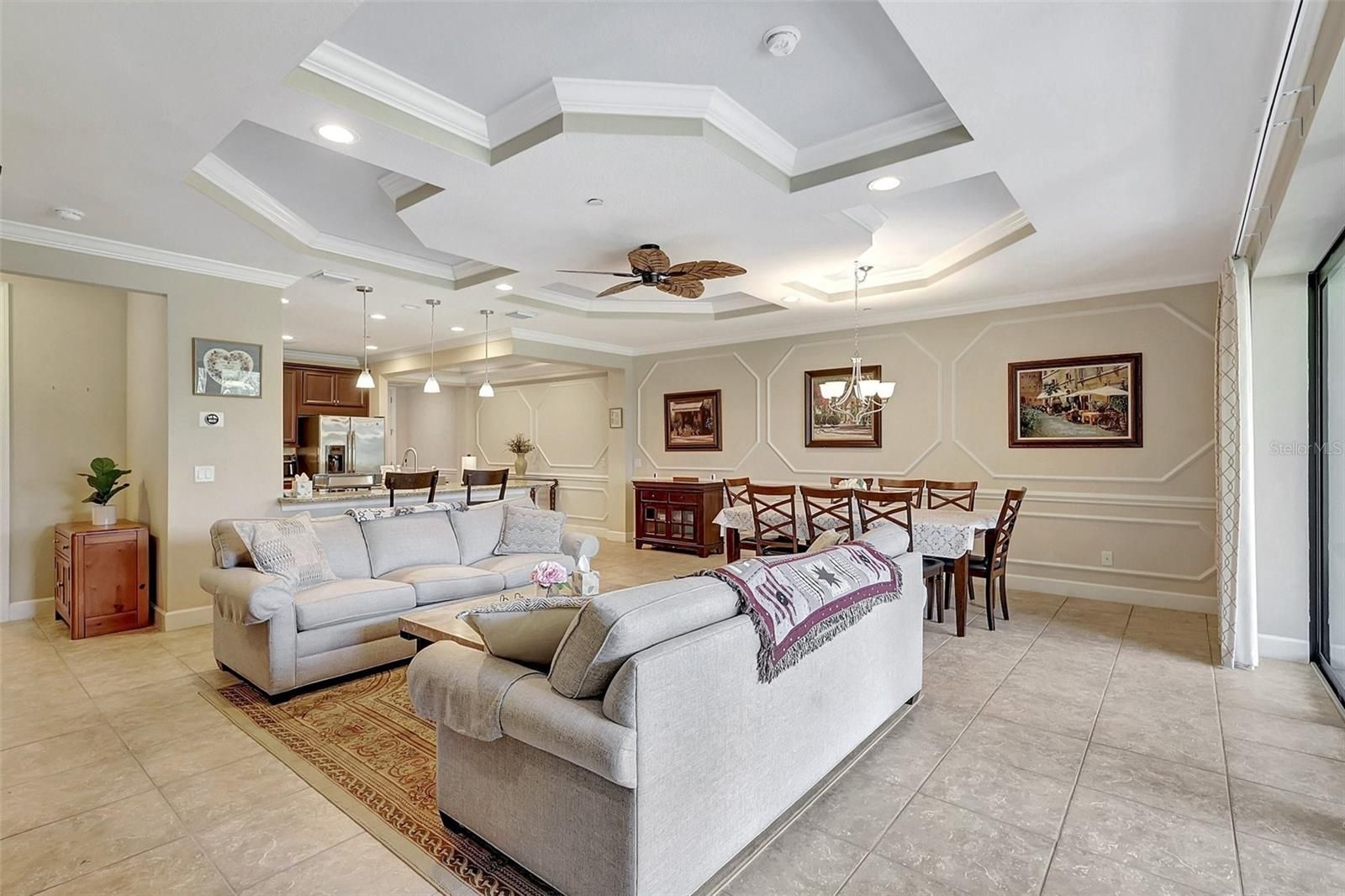- Ceiling Fan(s), Coffered Ceiling(s), Crown Molding, Eat-in Kitchen, High Ceilings, Living/Dining Room, Open Floorplan, Main Level Primary, Solid Surface Counters, Solid-Wood Cabinets, Thermostat, Tray Ceiling(s), Walk-In Closet(s)
