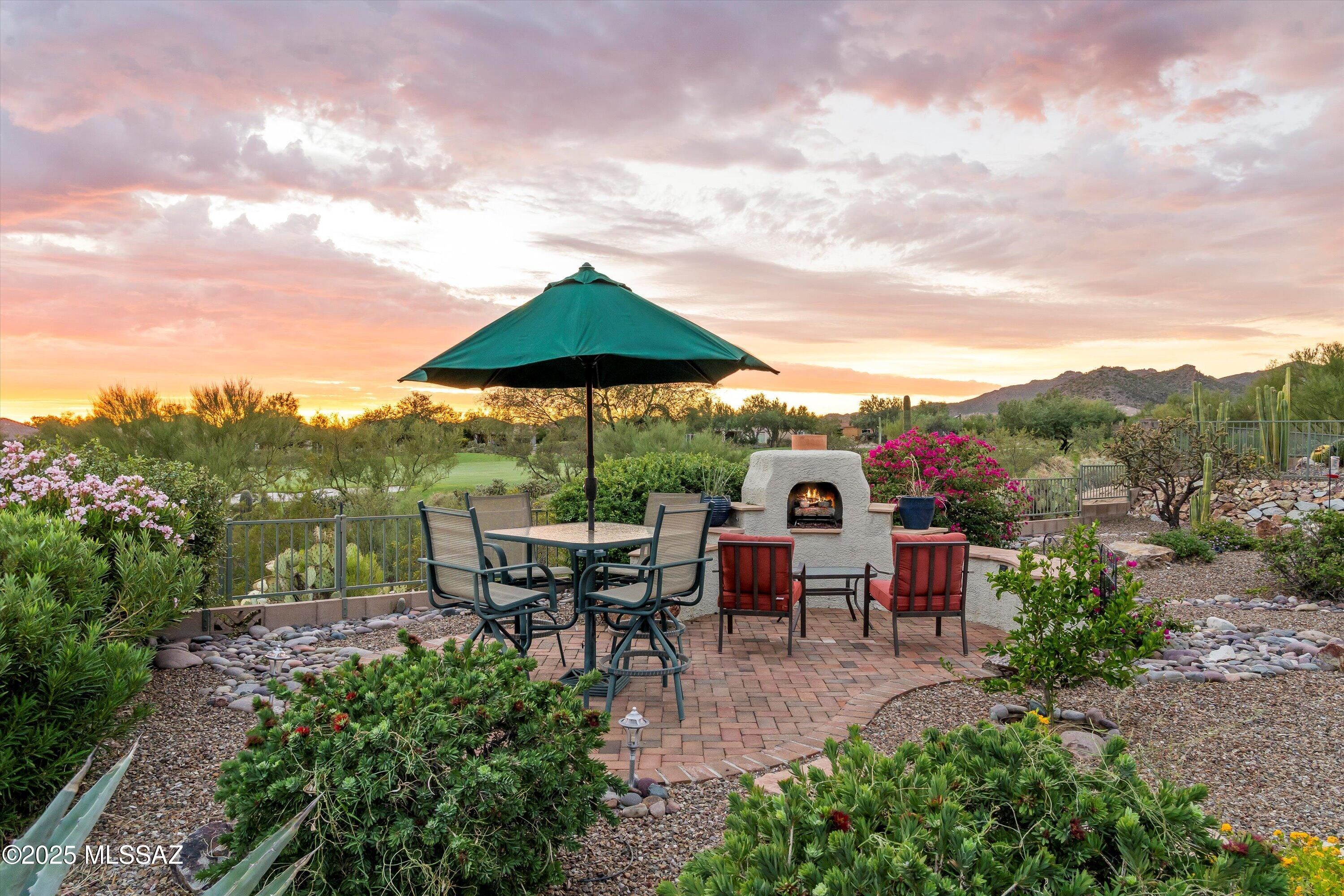 NEW ROOF, NEW WINDOWS & AMAZING VIEWS! Enjoy sunsets, sunrises, mountains, golf course, and city lights from this beautifully updated 2BR + den Santa Rosa model (2,060 sq ft) with a 2.5-car garage and custom golf cart bay. Features include bay windows, extended patio, plantation shutters, stacked-stone fireplace with surround sound, granite counters, built-in appliances, steam shower, custom closet, mesquite wood floors, and outdoor fireplace with paver patios. Stylish, move-in ready, and perfect for relaxing or entertaining!