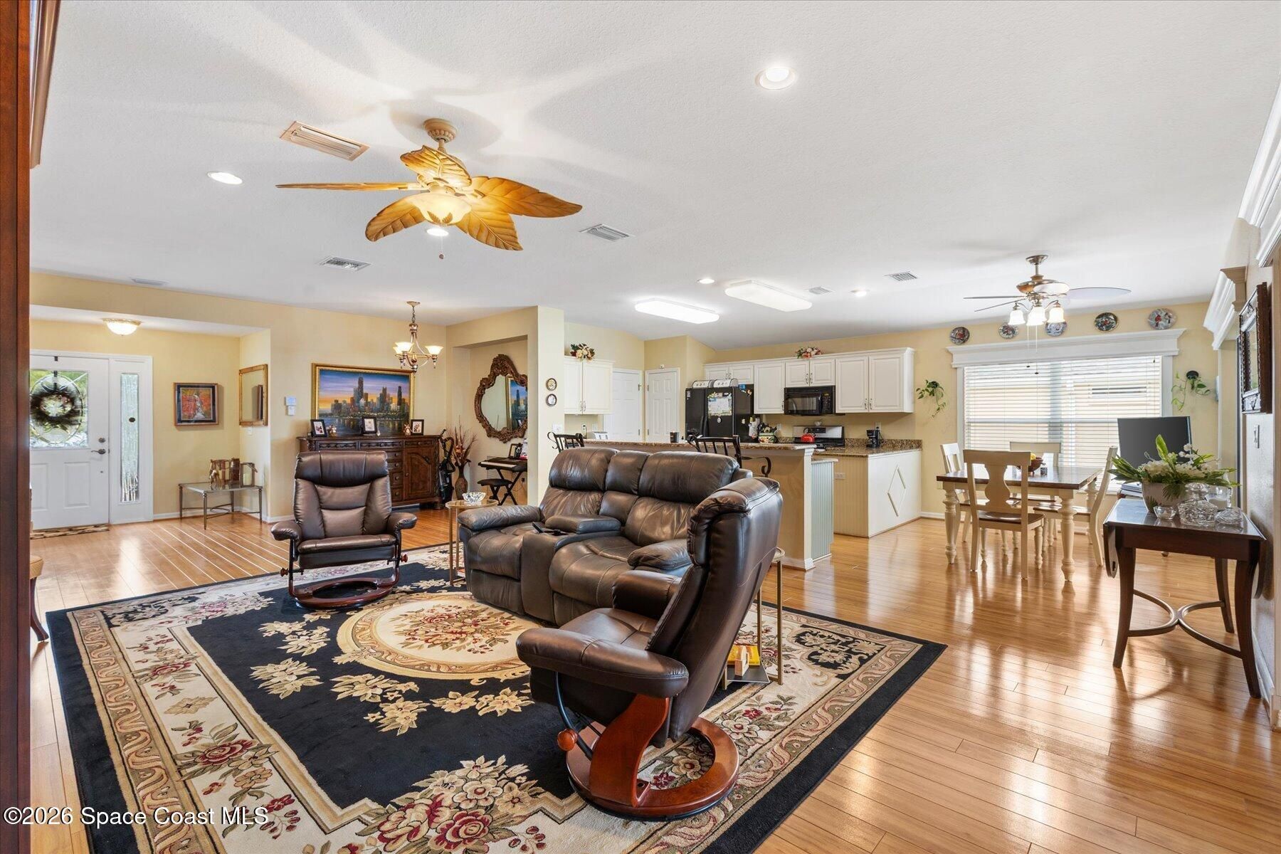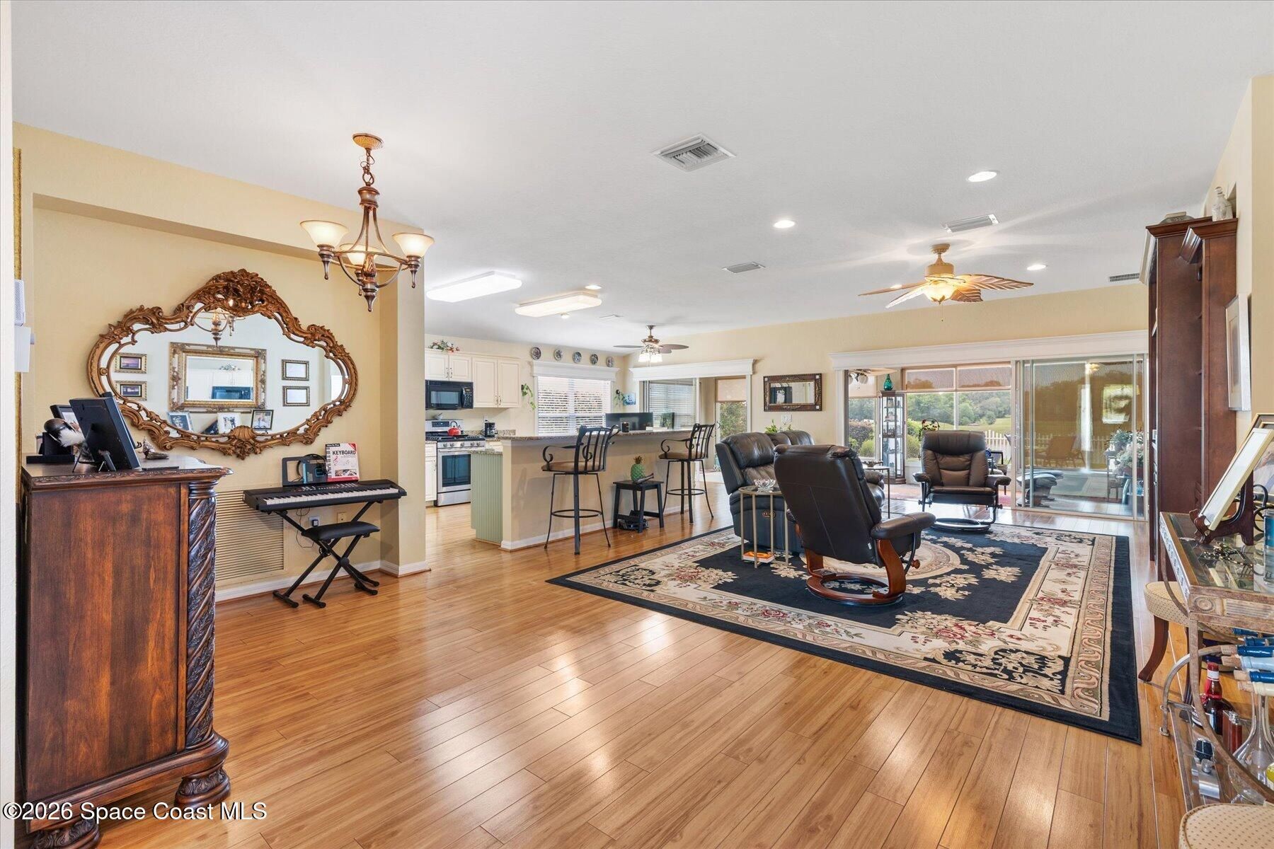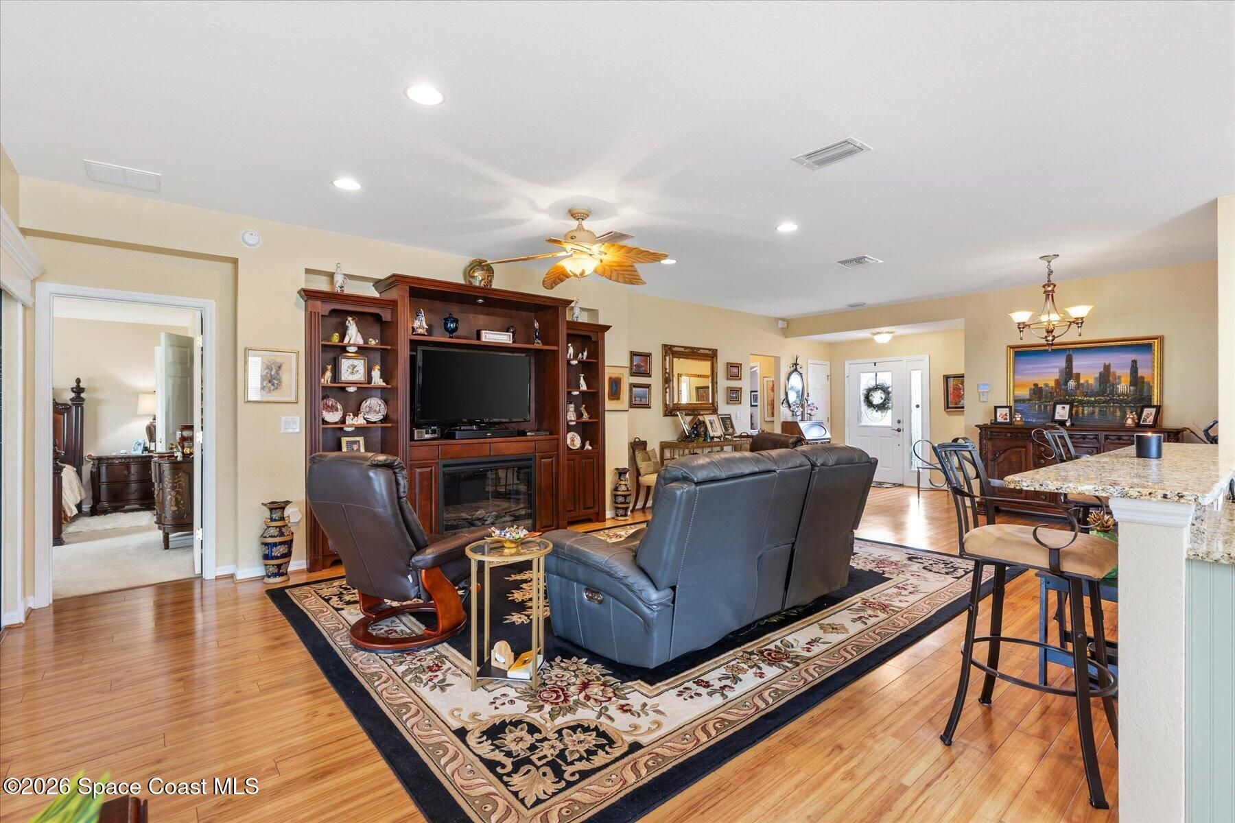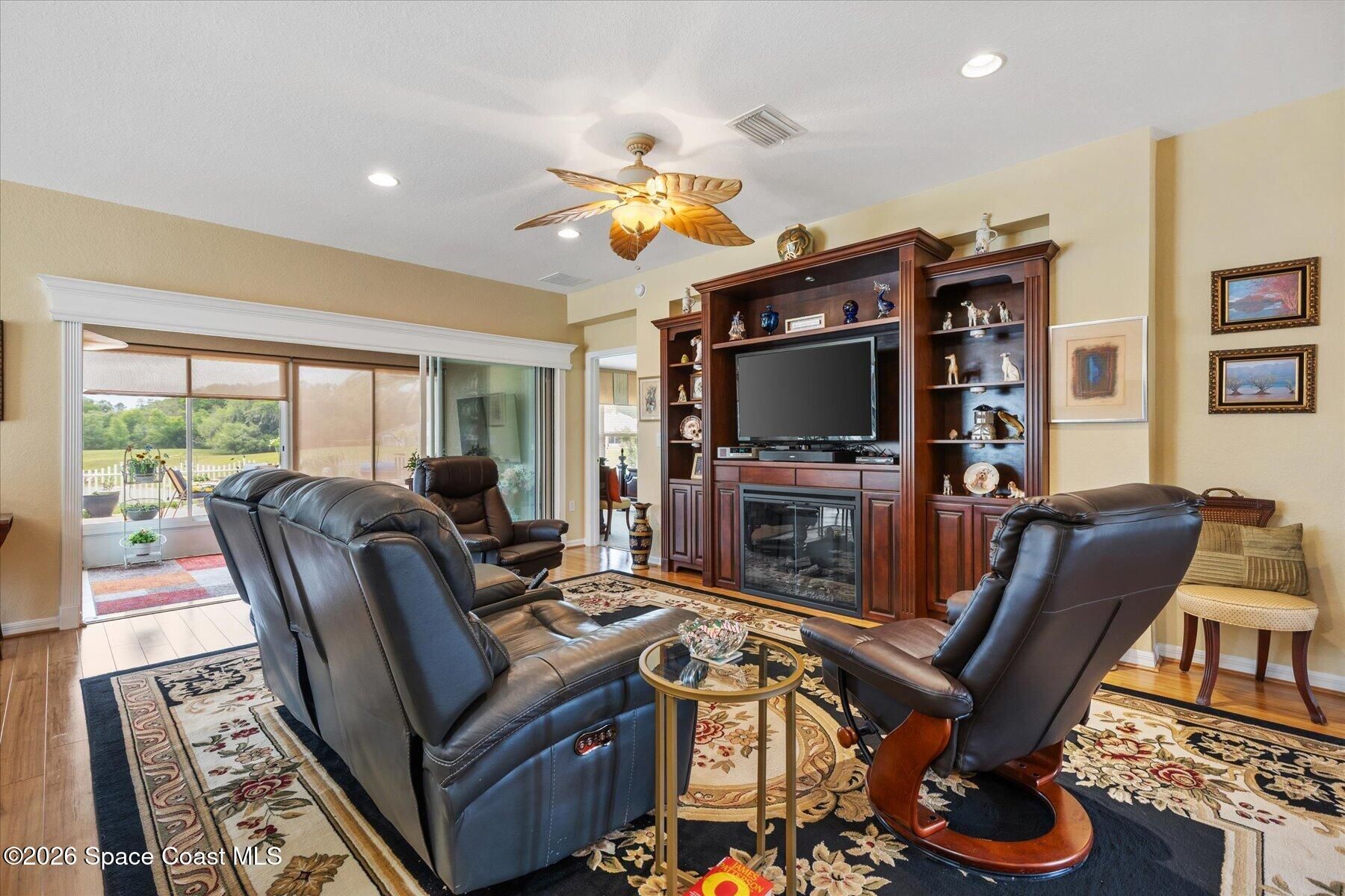 Beautiful Elkridge Located in Spruce Creek Country & Golf Club. This 3 Bedroom/2 Bathroom Home Has an Open Floorplan. Open Living Area w/ Rich Wood Entertainment Center Featuring Fireplace & Neutral Luxury Flooring . Remodeled Kitchen w/ Two-Tone Real Wood Cabinetry, Granite Countertops, Island & Pantry. Spacious Master Suite w/ Walk-In Closet, Double Sink Vanity, Tiled Shower & Glass Door. Split Layout w/ Guest Bedroom & Third Room Is Being Utilized as an Office with Built-In Storage! The Double & Triple Sliders Open to the 10x28 Florida Room. Gorgeous Water Views from the Concrete Patio & Lush Landscaping. Newer Roof Replaced in 2023, HVAC 2019 Handler/2023 Compressor, Newer Plumbing & Fixtures. This Gated Community Features Tennis Courts, Pickle Ball, Fitness Center, Multiple Pools, Golf Club Membership & Planned Activities!