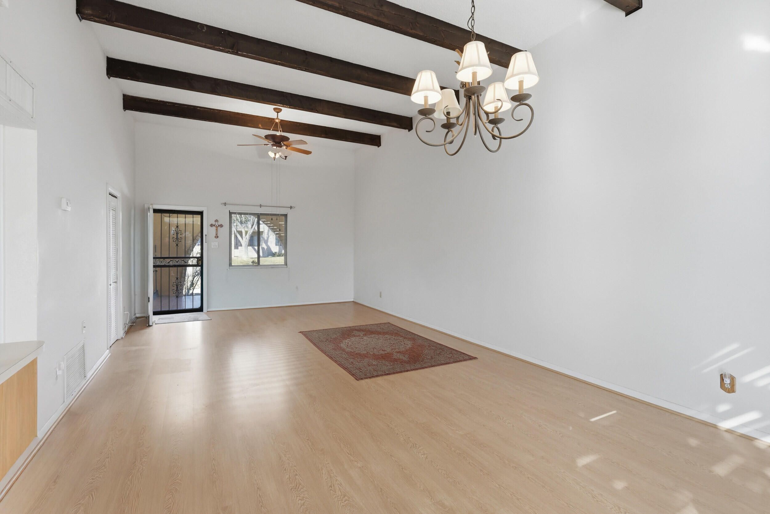 - Beamed Ceilings, Ceiling Fan(s), Cathedral Ceiling(s), High Ceilings, Main Level Primary, Pantry