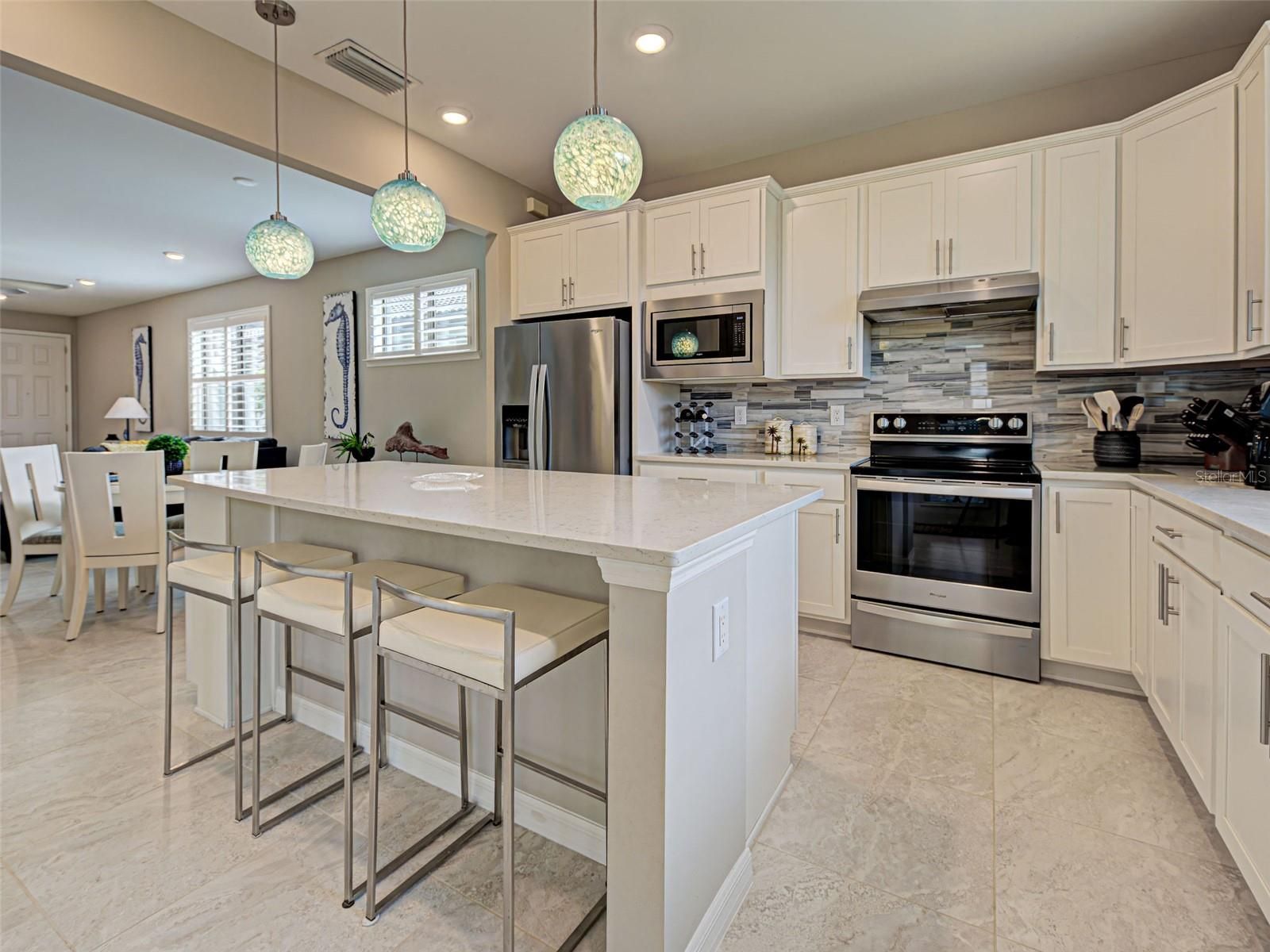 This exceptional FURNISHED POOL HOME is ideally located on a PRIVATE LOT surrounded by ADDED lush landscaping that enhances both privacy and curb appeal. From the moment you arrive, you will notice the VALUE of the thoughtful FEATURES including a CUSTOM COAST-TO-COAST POOL that was added after purchasing the home, TILE and LUXURY VINYL FLOORING (NO CARPET!), complemented by elegant PLANTATION SHUTTERS, and 8-FOOT DOORS that elevate the home’s spacious feel. The home is being offered FURNISHED WITH A FEW EXCEPTIONS and presents a GENTLE COASTAL VIBE—yet remains easily CUSTOMIZABLE TO YOUR TASTE. The versatile flex room near the entrance includes SOLID DOORS making it private and a perfect third bedroom, home office, or cozy den if desired. The great room and dining area are bathed in natural light and seamlessly flow into the fully equipped kitchen, which boasts a generous island for casual dining and entertaining, desired white color cabinetry, a spacious closet pantry, and a window over the sink with a lovely view of the pool and mature landscaping! The guest bedroom, thoughtfully positioned opposite the primary bedroom for optimal privacy, includes LUXURY VINYL FLOORING, a ceiling fan and access to a guest bathroom, featuring a bathtub with tiled wall and stylish wallpaper. Meanwhile, the bright primary suite offers PLANTATION SHUTTERS, luxury vinyl, and gorgeous views of the lanai! Its ensuite bathroom is a true retreat, boasting dual vanities topped with quartz counters, a light-toned subway tile backsplash, a sleek glass-enclosed shower, and a spacious walk-in closet offering generous storage. Additional highlights include a laundry room with upgraded washer and dryer, and an adjacent linen closet. The outdoor living space boasts a covered lanai, including a section UNDER AIR—perfect for enjoying the Florida lifestyle in every season. PRIVACY IS THE GEM of this home, thanks to thoughtfully added landscaping and NO NEIGHBORS IN THE BACK, creating a true oasis ideal for relaxing in the HEATED, SALT WATER POOL. The garage offers epoxy flooring and a utility sink. Located on a desirable tranquil street, this home offers convenient access to the resident-only back gate, clubhouse, and resort center. A second resident only back gate is installed & will provide access to Manasota Beach Rd., projected for August 2026. Islandwalk amenities include: geothermal pools, a lap pool, (2) gyms, pickleball, tennis courts, bocce, an event center, firepits, a community garden, dog park and a 24 hour staffed security gate.Golf carts are permitted. A resident only back gate takes you directly to the vibrant downtown Wellen Park, a Marketplace anchored by Publix, the Atlanta Braves ballpark and Costco without ever needing to go on US-41! The low HOA covers landscaping, high speed internet & 3 DVR boxes, a full-time Lifestyle Director, amenities, and an on-site HOA management team. Located just 4 miles to I-75, there is easy access to (4) major airports and pristine Gulf beaches.