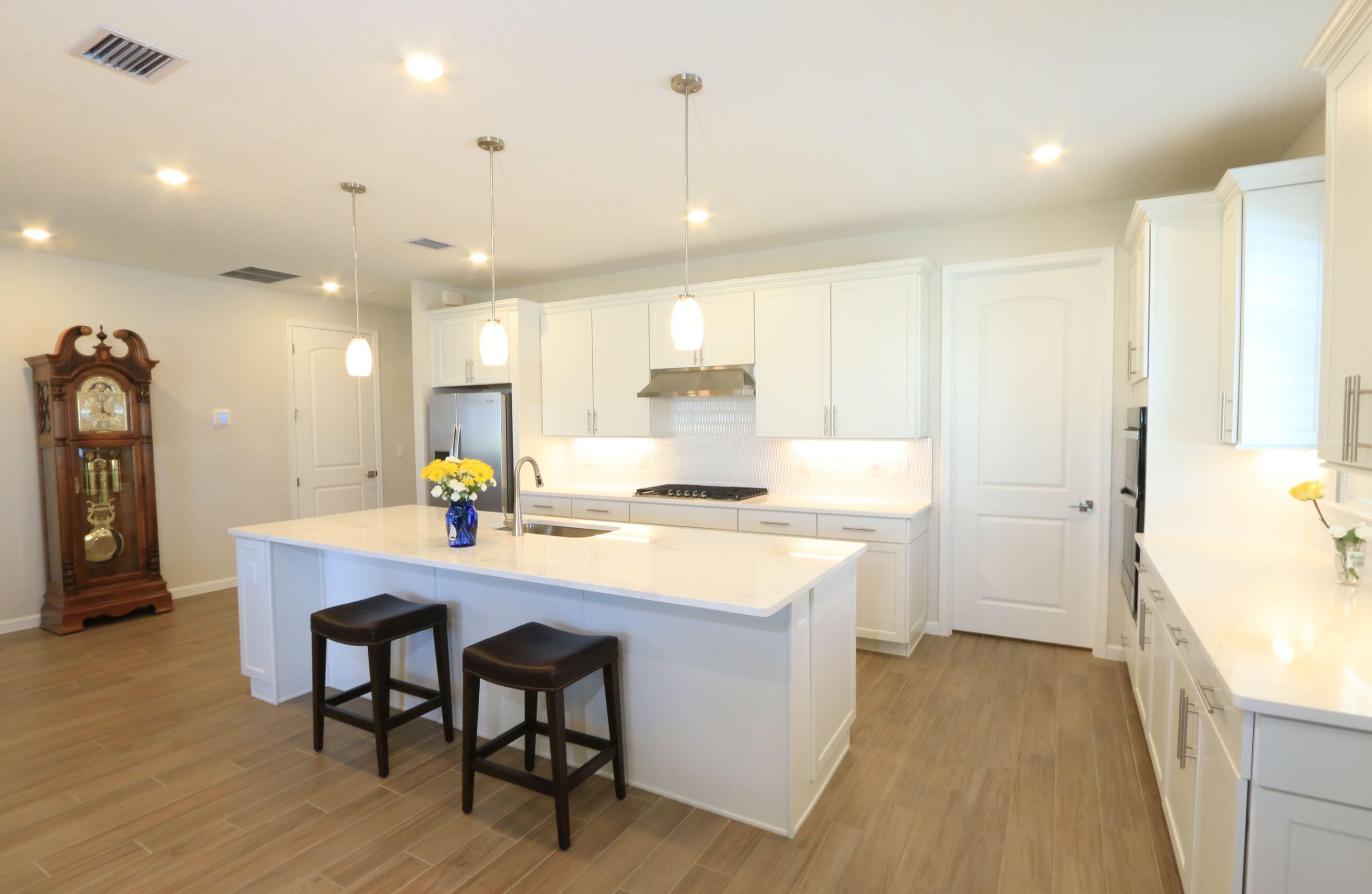 Why wait to build when you can move right into this stunning Palmary model on a desirable large corner lot? This home features a spacious open-concept floor plan, perfect for entertaining and everyday living, with tile flooring throughout. The chef's kitchen boasts a huge island with beautiful quartz countertops, abundant cabinetry, and a large walk-in pantry with custom shelving. Unwind in the elegant owner's suite offering a generous walk-in shower, dual vanities, and a spacious walk-in closet with custom built-ins. A versatile flex room provides the ideal space for a den, office, or hobby room. Active 55+ community with 2 clubhouses, 2 pools, pickleball,tennis, bocce, putting green