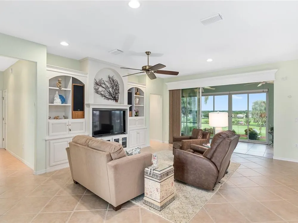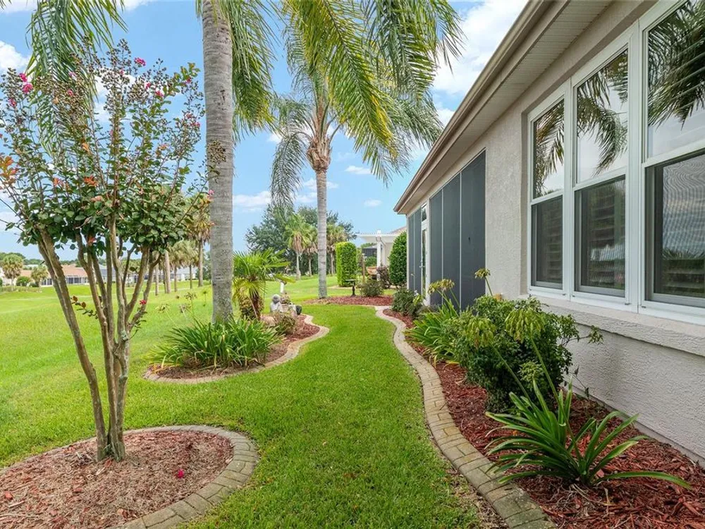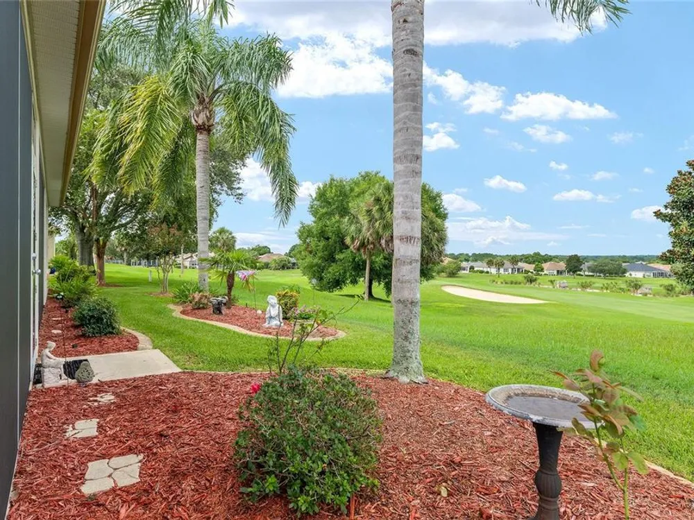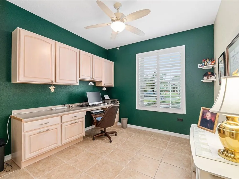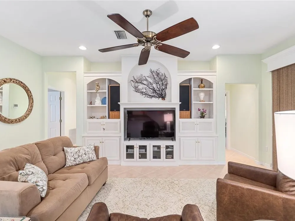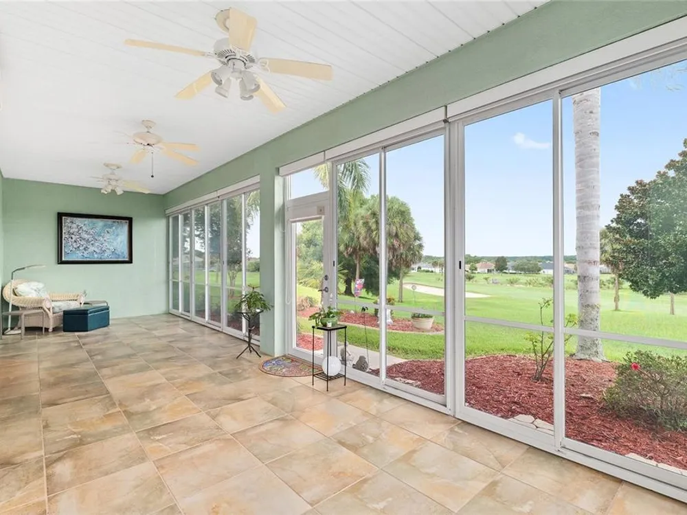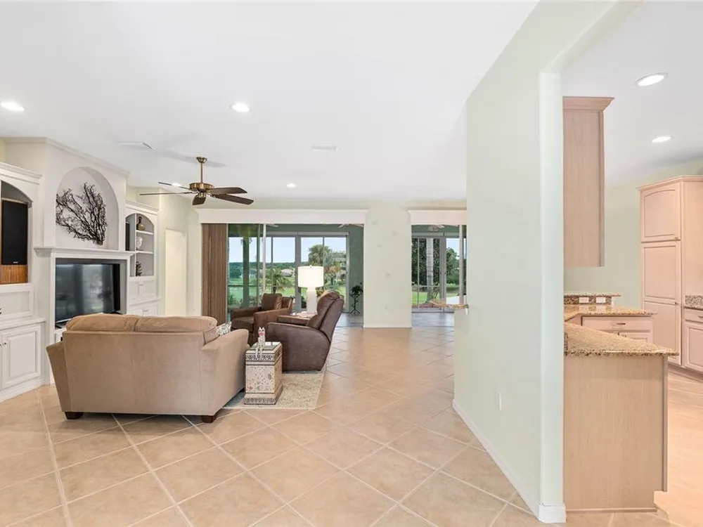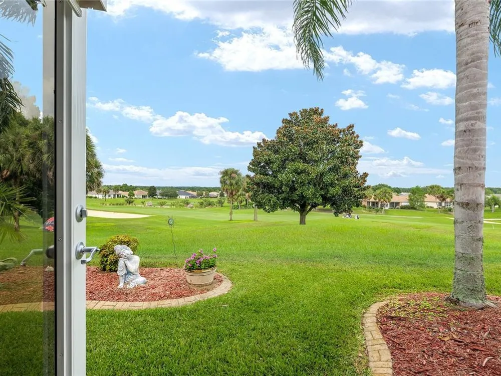 One or more photo(s) has been virtually staged. The spectacular views of Holes 2 and 3 of the Memorial Golf Course set the stage for this beautifully maintained Hanover model with 3 full bedrooms and 2 baths. From the moment you arrive, the professional landscaping, decorative curbing, and inviting front patio create a lasting first impression. Step through the double leaded glass doors and be greeted by sweeping golf course views that continue throughout the home. Impeccably clean and move-in ready, this CBS home offers tile flooring throughout and a climate-controlled enclosed lanai with a split system for year-round enjoyment. The kitchen features granite counters, birch cabinets, and stainless steel appliances, while the remodeled primary bath adds a touch of luxury. Plantation shutters, a built-in entertainment center in the Great Room, and a built-in desk in the third bedroom further enhance the home’s appeal. Additional upgrades include a tankless Rinnai water heater, freshly painted epoxy garage floor, and an extended by 4-foot garage with a dedicated golf cart garage. Major systems are up to date with a new HVAC installed in August 2025, roof replaced in 2014, and re-piped ceilings and walls. An assumable termite bond adds peace of mind.This rare Hanover with golf course frontage is truly a must-see. Call today for your private showing—opportunities like this don’t last long!