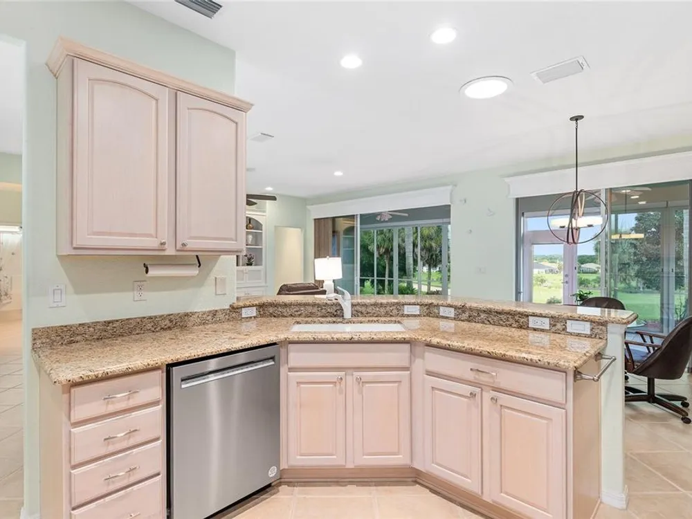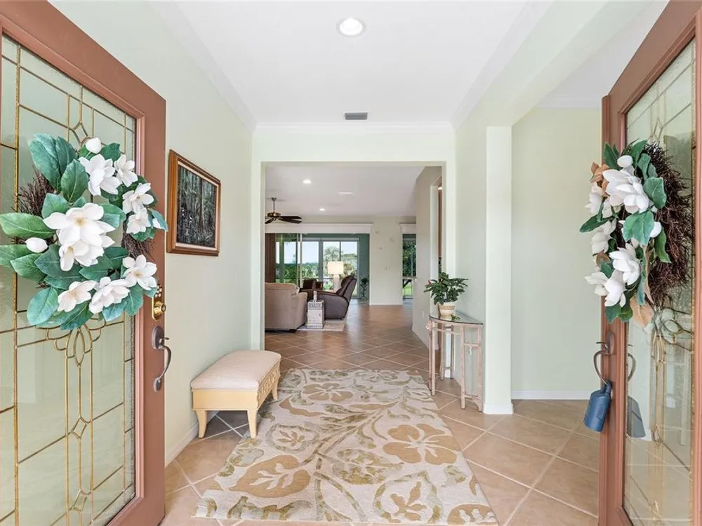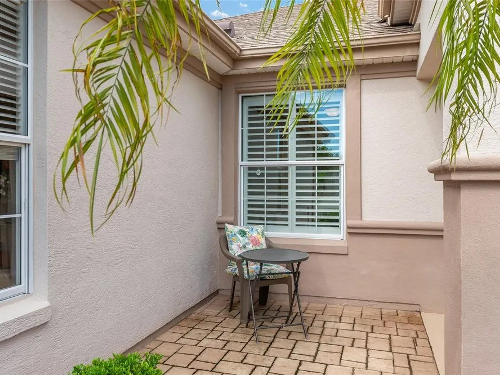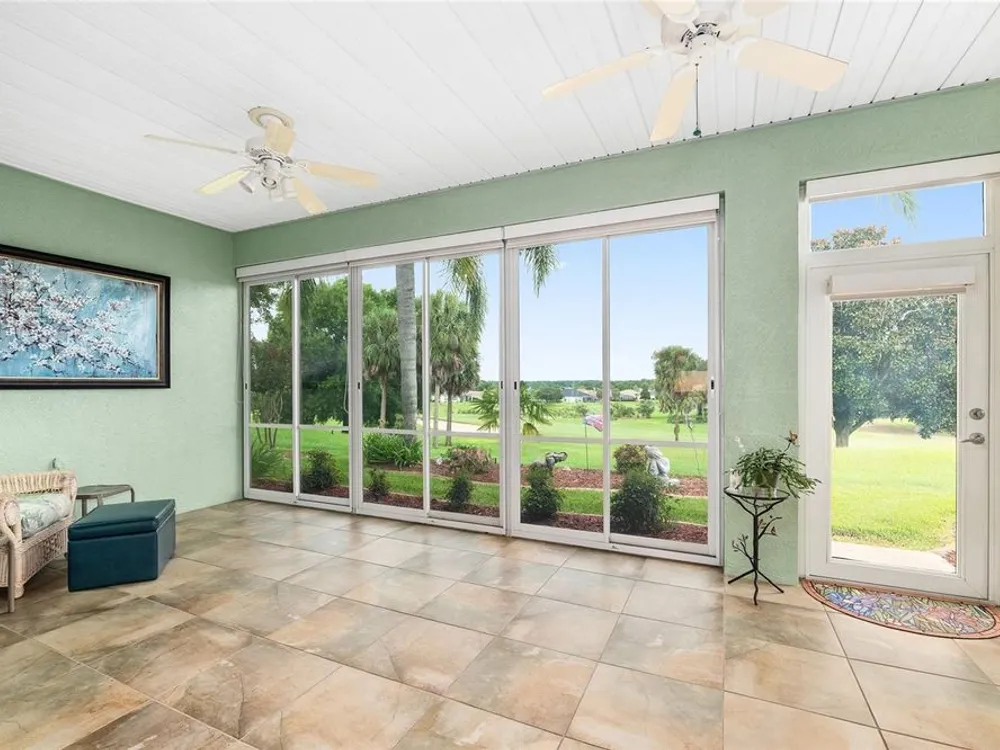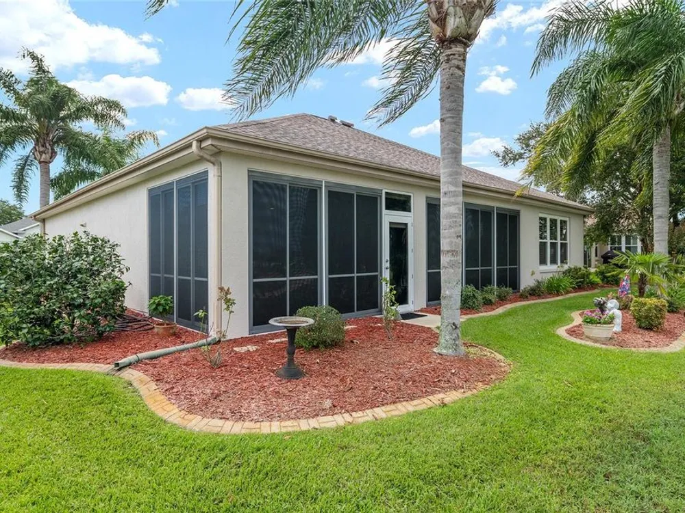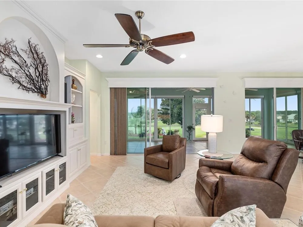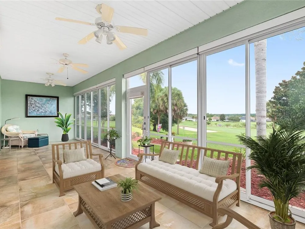 One or more photo(s) has been virtually staged. The spectacular views of Holes 2 and 3 of the Memorial Golf Course set the stage for this beautifully maintained Hanover model with 3 full bedrooms and 2 baths. From the moment you arrive, the professional landscaping, decorative curbing, and inviting front patio create a lasting first impression. Step through the double leaded glass doors and be greeted by sweeping golf course views that continue throughout the home. Impeccably clean and move-in ready, this CBS home offers tile flooring throughout and a climate-controlled enclosed lanai with a split system for year-round enjoyment. The kitchen features granite counters, birch cabinets, and stainless steel appliances, while the remodeled primary bath adds a touch of luxury. Plantation shutters, a built-in entertainment center in the Great Room, and a built-in desk in the third bedroom further enhance the home’s appeal. Additional upgrades include a tankless Rinnai water heater, freshly painted epoxy garage floor, and an extended by 4-foot garage with a dedicated golf cart garage. Major systems are up to date with a new HVAC installed in August 2025, roof replaced in 2014, and re-piped ceilings and walls. An assumable termite bond adds peace of mind.This rare Hanover with golf course frontage is truly a must-see. Call today for your private showing—opportunities like this don’t last long!