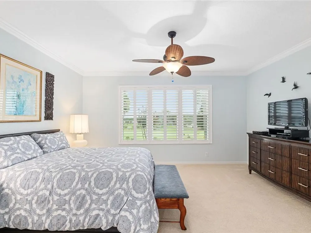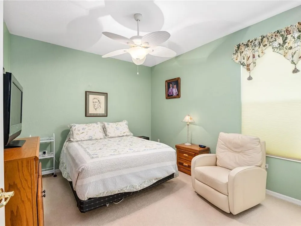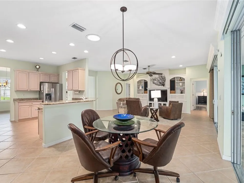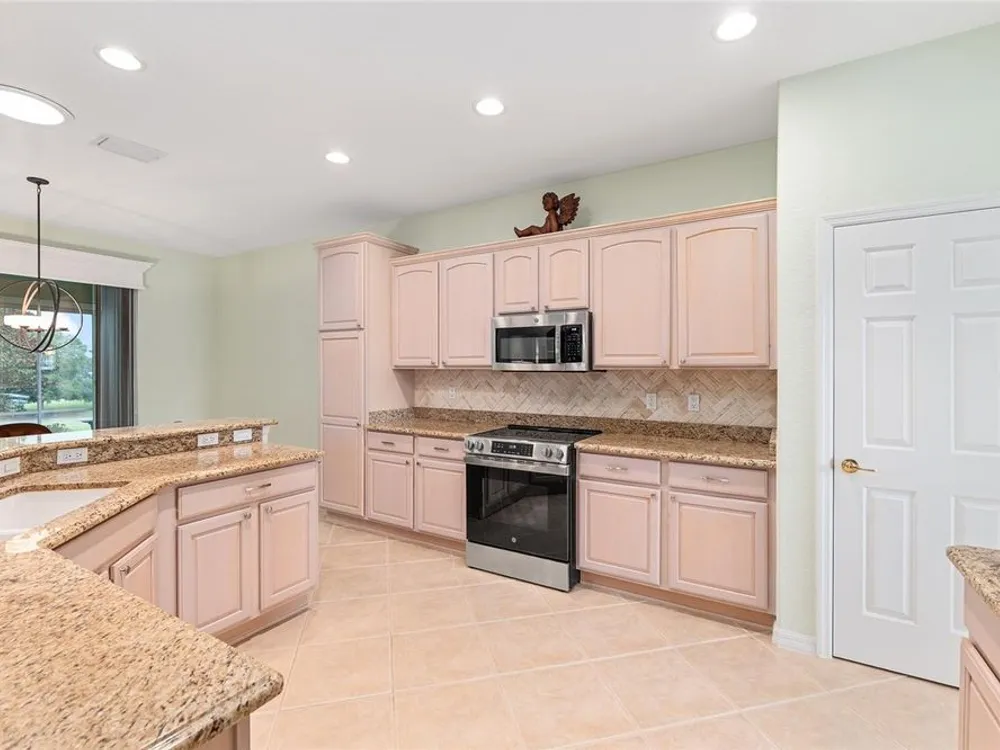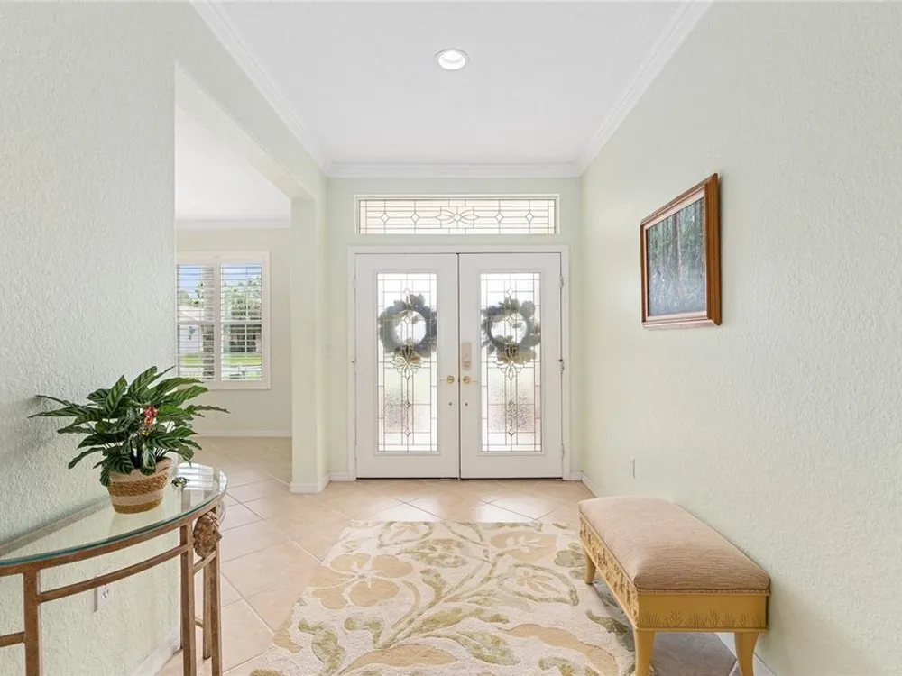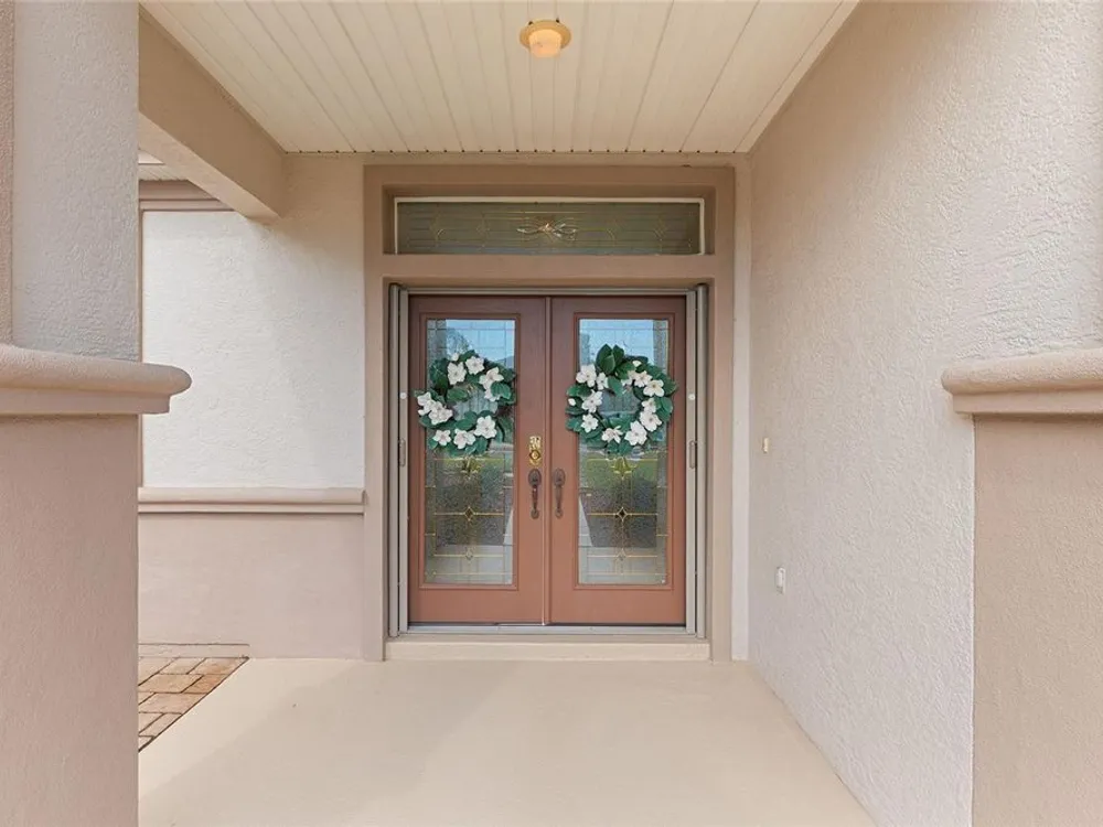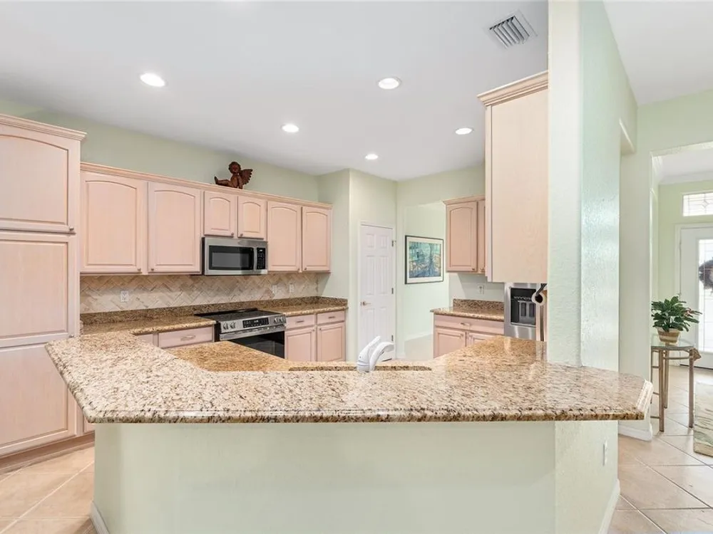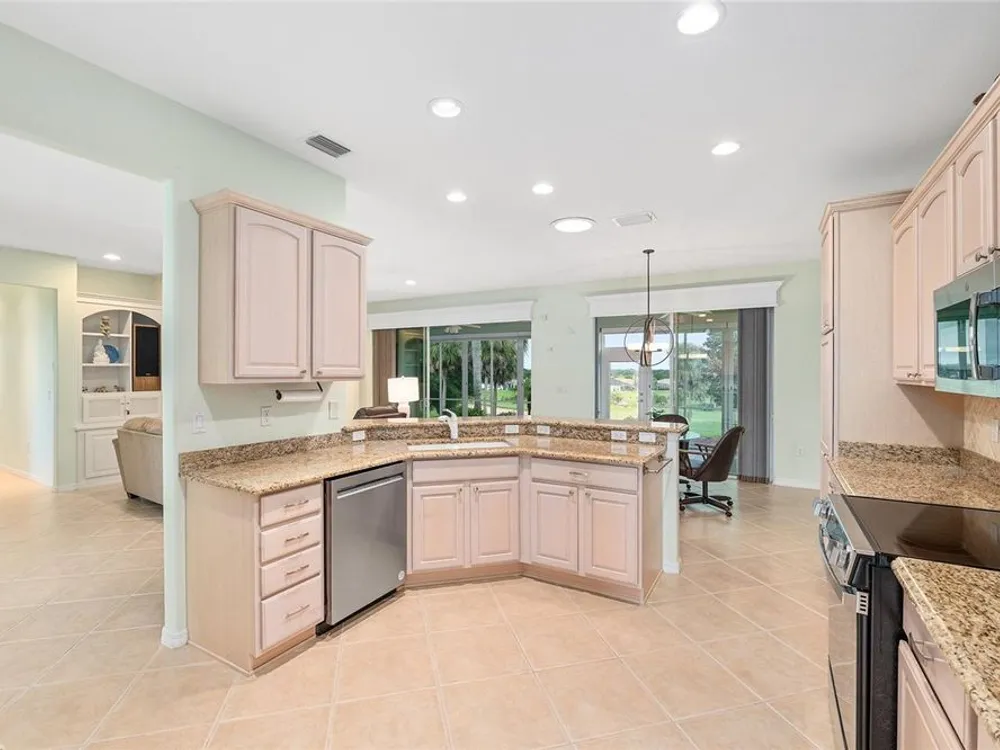 One or more photo(s) has been virtually staged. The spectacular views of Holes 2 and 3 of the Memorial Golf Course set the stage for this beautifully maintained Hanover model with 3 full bedrooms and 2 baths. From the moment you arrive, the professional landscaping, decorative curbing, and inviting front patio create a lasting first impression. Step through the double leaded glass doors and be greeted by sweeping golf course views that continue throughout the home. Impeccably clean and move-in ready, this CBS home offers tile flooring throughout and a climate-controlled enclosed lanai with a split system for year-round enjoyment. The kitchen features granite counters, birch cabinets, and stainless steel appliances, while the remodeled primary bath adds a touch of luxury. Plantation shutters, a built-in entertainment center in the Great Room, and a built-in desk in the third bedroom further enhance the home’s appeal. Additional upgrades include a tankless Rinnai water heater, freshly painted epoxy garage floor, and an extended by 4-foot garage with a dedicated golf cart garage. Major systems are up to date with a new HVAC installed in August 2025, roof replaced in 2014, and re-piped ceilings and walls. An assumable termite bond adds peace of mind.This rare Hanover with golf course frontage is truly a must-see. Call today for your private showing—opportunities like this don’t last long!