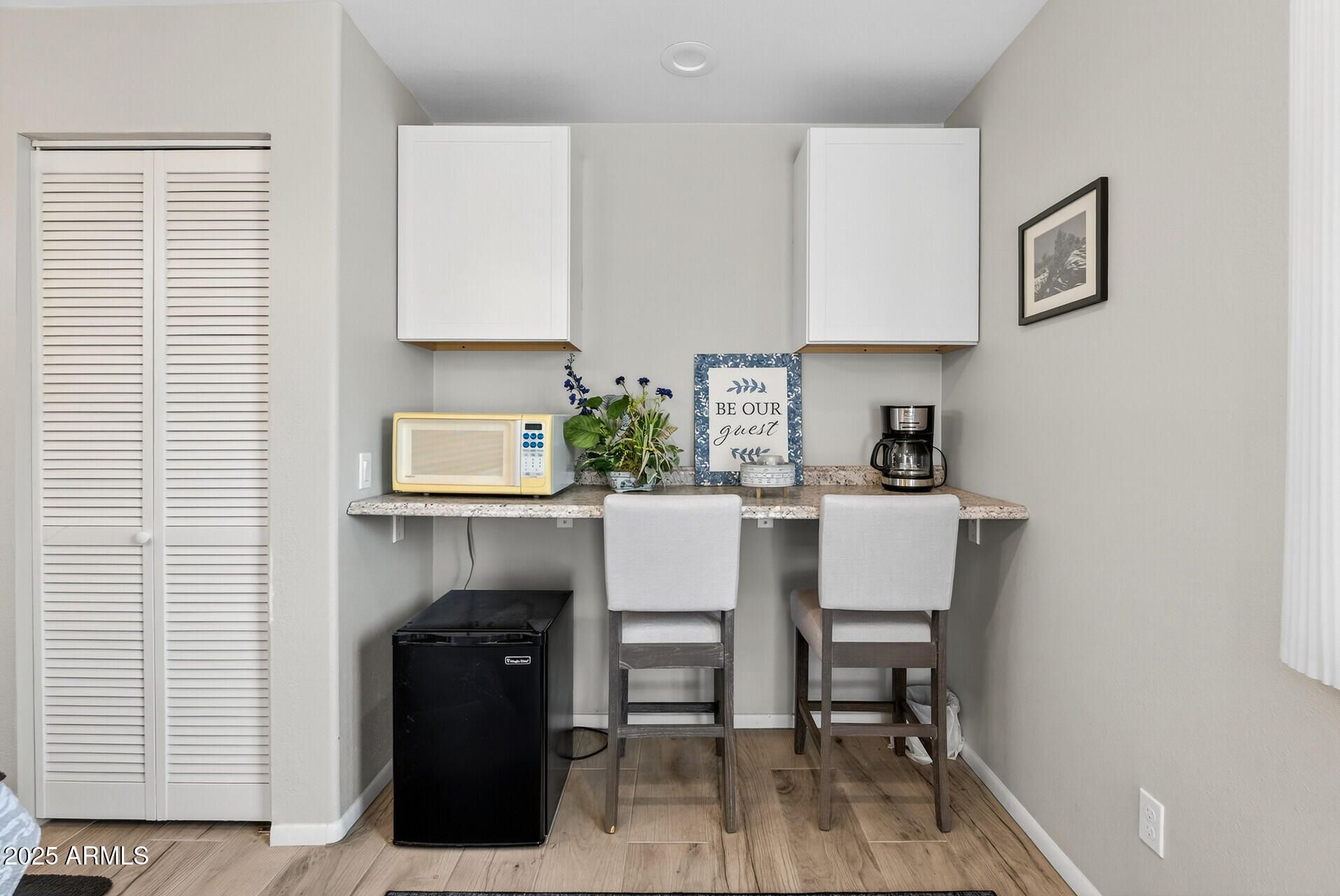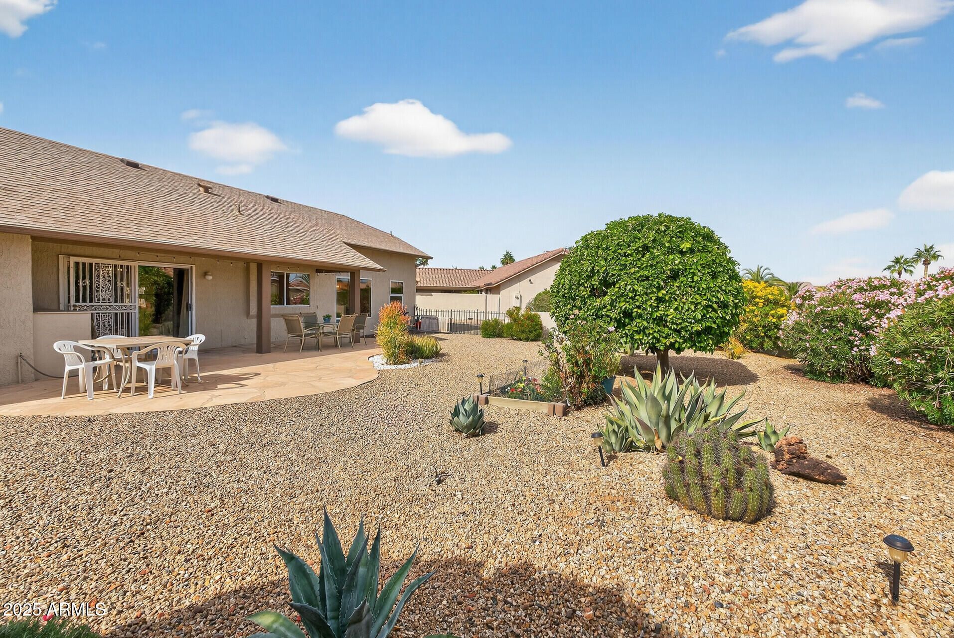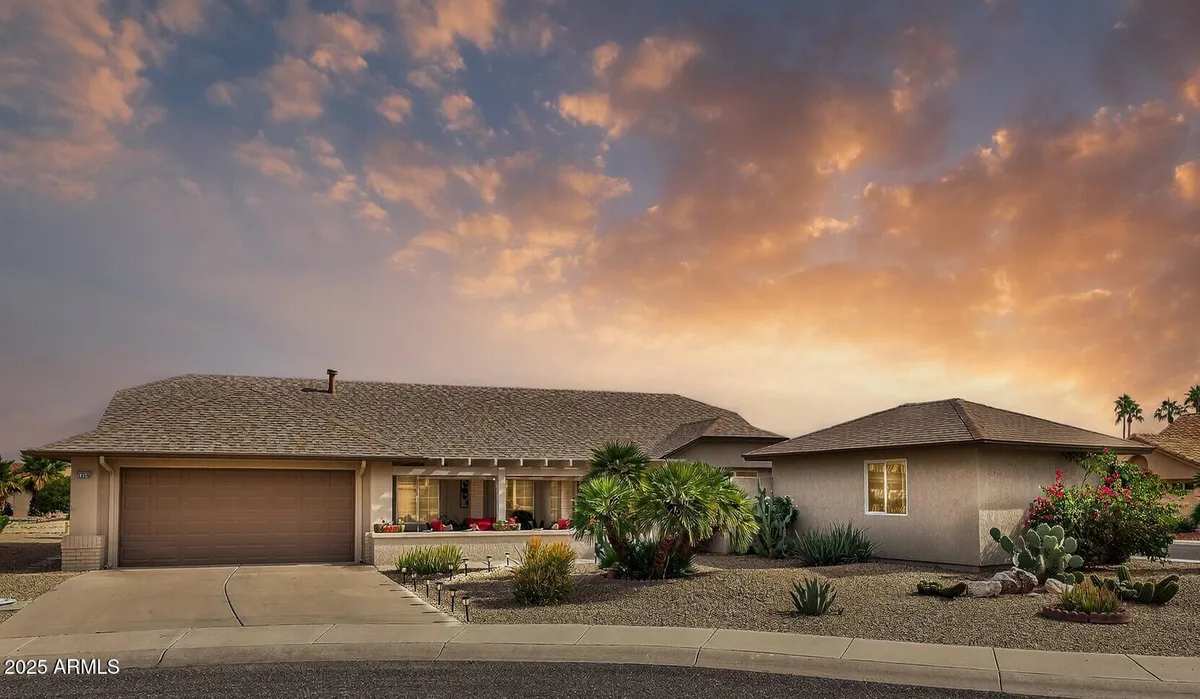 SENSATIONAL, FULLY FURNISHED HOME WITH A CONTEMPORARY CASITA (built 2019)! Ideally situated on a pool-sized 10,500 sq ft cul-de-sac lot, this special property offers exceptional privacy, charm, and versatility. Fabulous curb appeal welcomes you with lush, mature landscaping and a large covered front patio—perfect for relaxing or entertaining (patio furniture conveys). Inside the main home (1356sf), vaulted ceilings enhance the open living and dining areas, complemented by neutral paint, ceiling fans, and tile flooring in high-traffic areas and the kitchen. The bright, cheery eat-in kitchen features a breakfast nook, gas stove, pantry, abundant cabinetry, and a built-in desk/office space. Just off the kitchen is a spacious utility room—ideal for a home office, craft, or hobby room—with convenient built-in cabinets. The primary bedroom offers a charming bay window overlooking the private backyard. The updated ensuite bath showcases a custom dual-sink vanity, new plumbing fixtures, mirrors, and lighting, along with a walk-in shower and walk-in wardrobe. A generously sized guest bedroom and a guest bath with a tub/shower combination complete the main home. The 280 sq ft contemporary casita is a true highlight, featuring a private entrance, porcelain plank wood-grain flooring, mini refrigerator, built-in shelving and seating area, and a spa-like bathroom with a frameless walk-in showerperfect for guests, hobbies, or multigenerational living. The backyard is fully enclosed with a custom-shaped pony wall and feels like a private park, offering multiple citrus trees, colorful blooming desert trees, and mature shrubs for beauty and privacy. Gently lived in and well cared for by seasonal owner. Roof replaced in 2018, HVAC - 2014 serviced annually additional insulation added. Ideally located with low taxes, no HOA, and an easy golf-cart ride to golf courses, recreation centers, and shopping, this AMAZING CASITA HOME is truly a SPECTACULAR FIND!