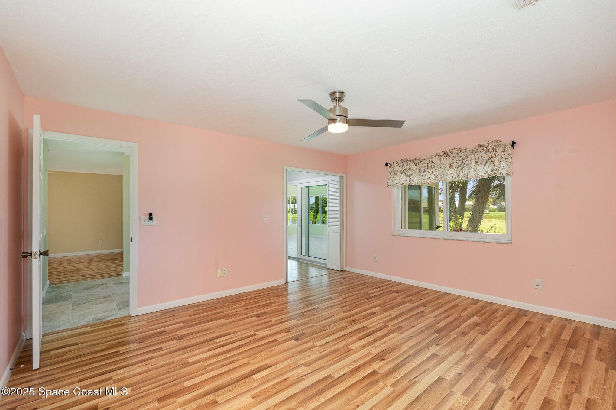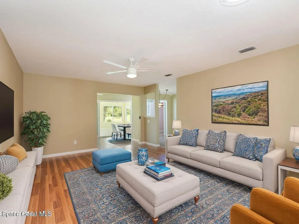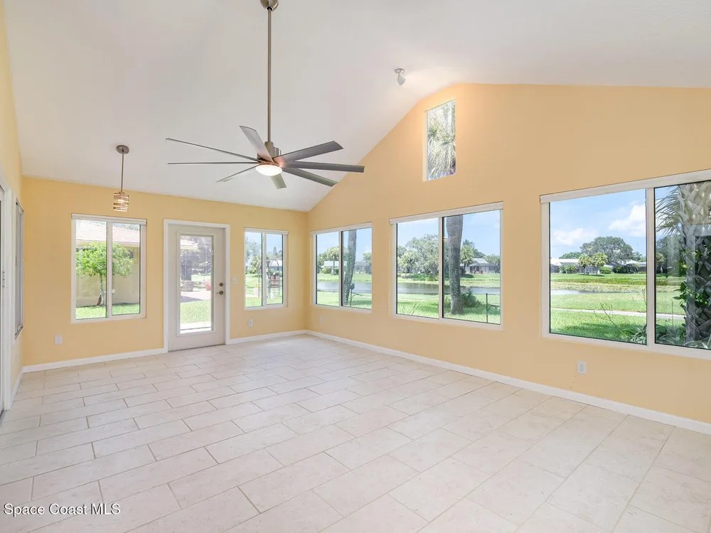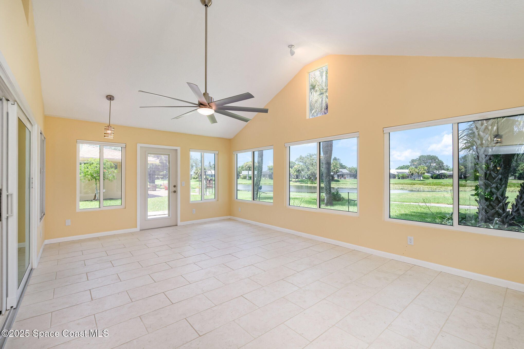 Located in a resort-style country club community, this beautifully upgraded Expanded Bangor model offers the ultimate Florida lifestyle with top-tier amenities. Enjoy stunning golf course and water views from the large Florida room and outdoor paver patio with retractable awning—perfect for entertaining or relaxing in style. Featuring an added bedroom, tile and laminate flooring throughout, and California closets in the primary and one guest bedroom. Kitchen boasts Martha Stewart cabinets and quartz countertops. Updated primary bath with walk-in shower, newer fans and lights, 2021 roof, solar attic fan, and added attic insulation. Paver driveway and pristine landscaping complete this move-in-ready home designed for comfort and style. Home to over 600 military veterans, Indian River Colony Club is a private 55+ country club community offering a unique blend of camaraderie, comfort, and care. Residents enjoy an extensive home maintenance program and access to exceptional amenities, including an 18-hole golf course, fine dining with an executive chef, the casual 19th Hole restaurant and bar, fitness center, heated pool, tennis, croquet, bocce ball, shuffleboard, and more. This pet-friendly, gated community boasts over 60 social and activity groupsmaking every day feel like a vacation.
